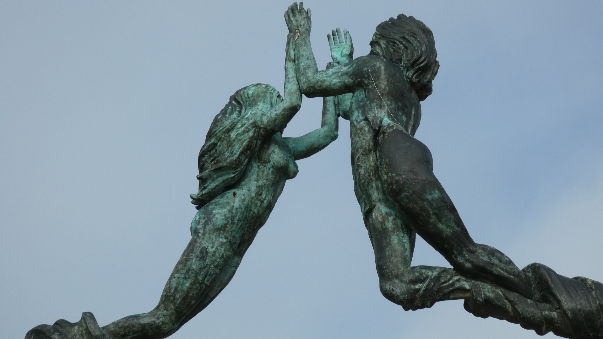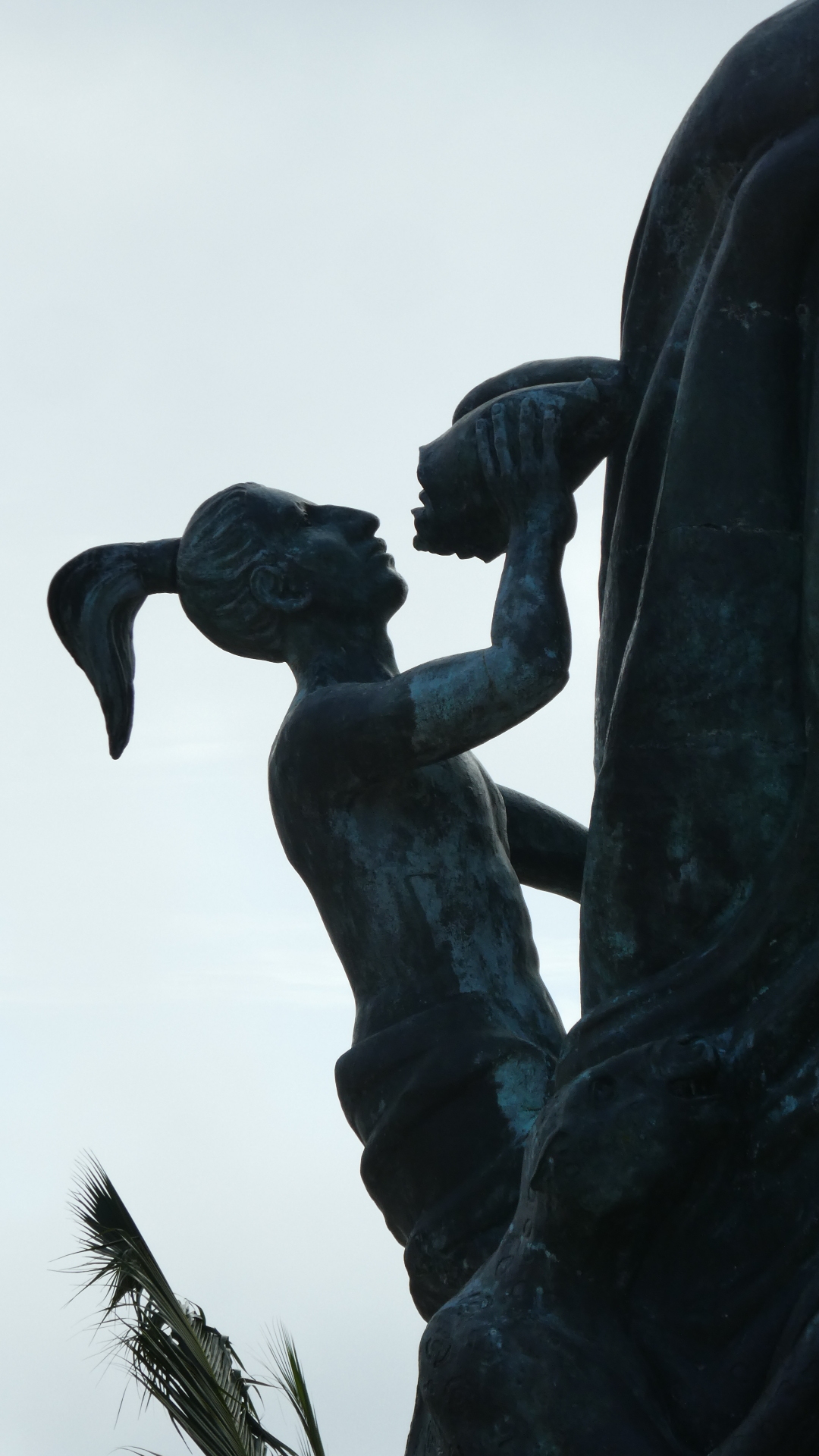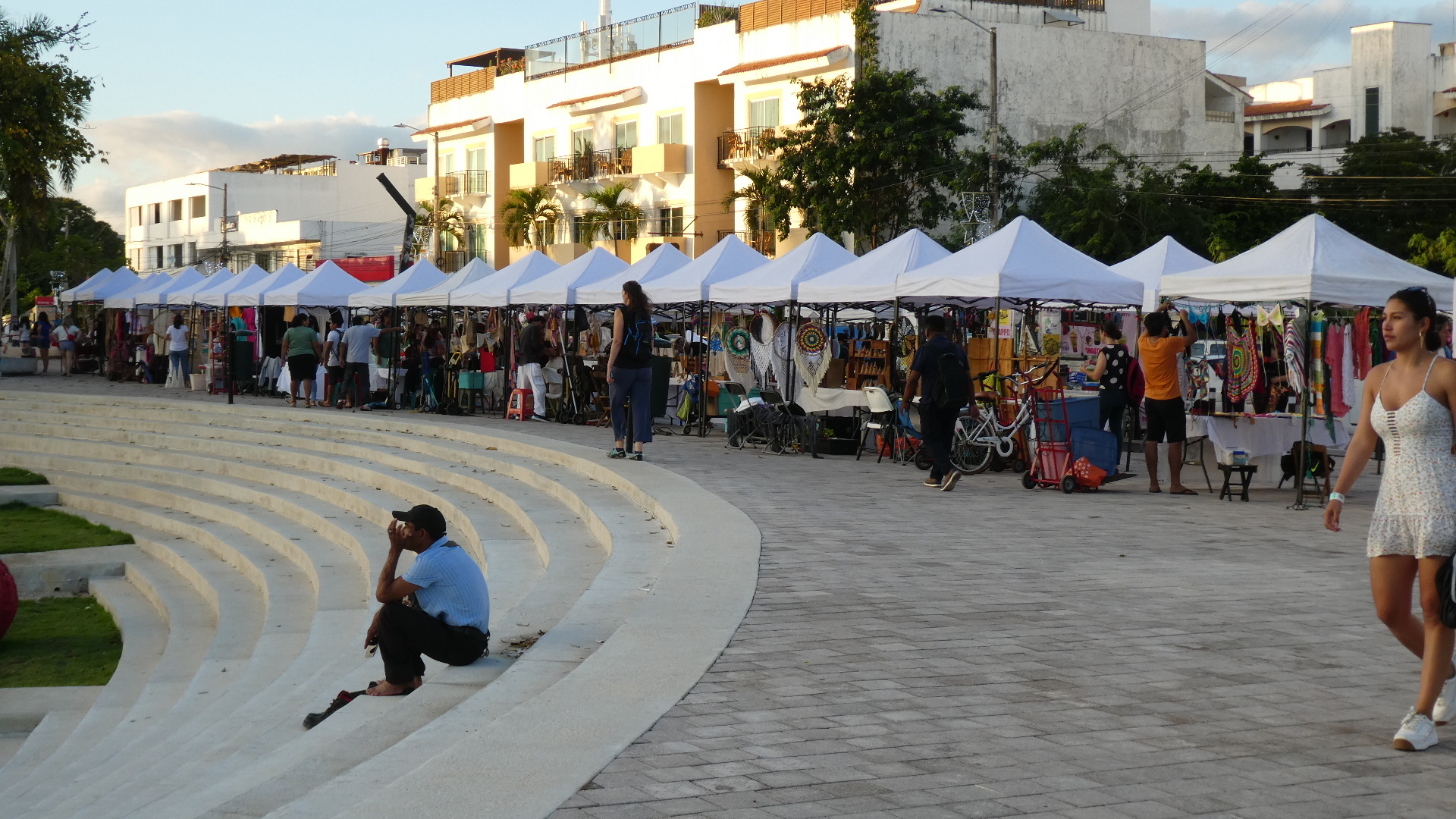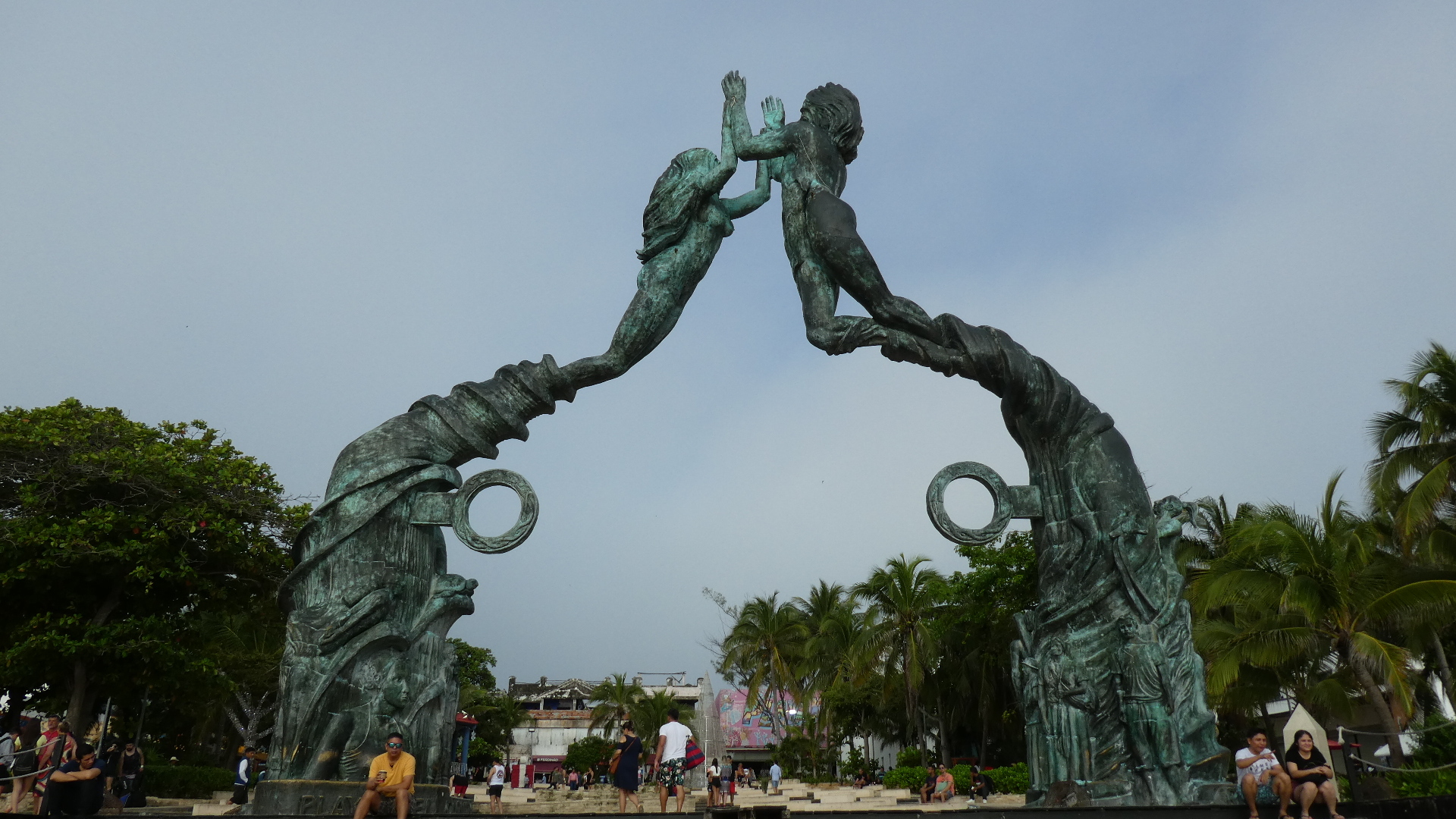 Down by the ferries is the famous "Portal Maya" statue. It was installed in 2012, the year of the change over in the Mayan calendar, and it is meant to usher in a new age, of some sort. The two main figures form an arch, which is the portal, and we also see the rings, which are the goals in the Mayan ball game. Ball courts with these rings can be seen at all the Mayan ruins.
