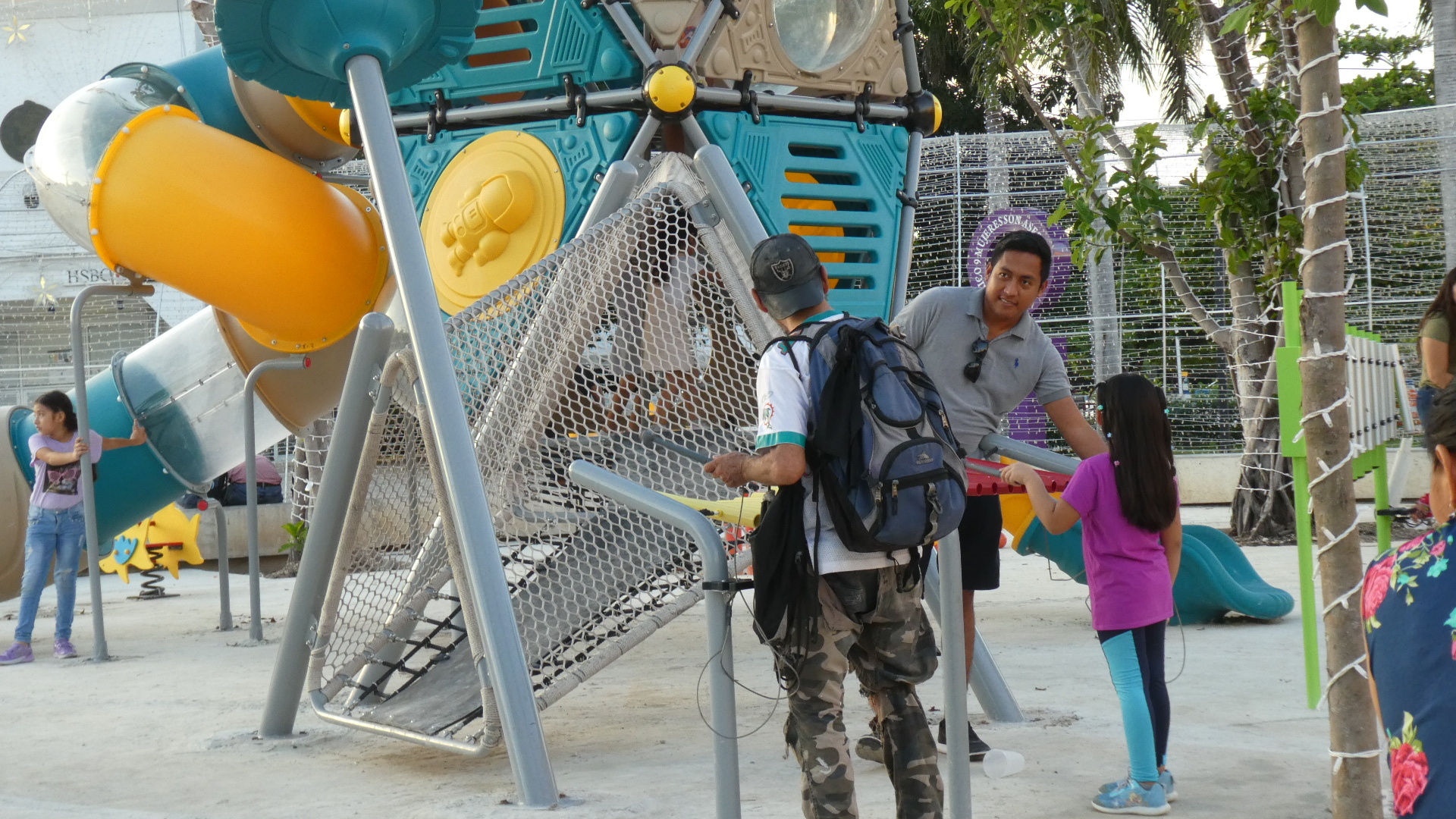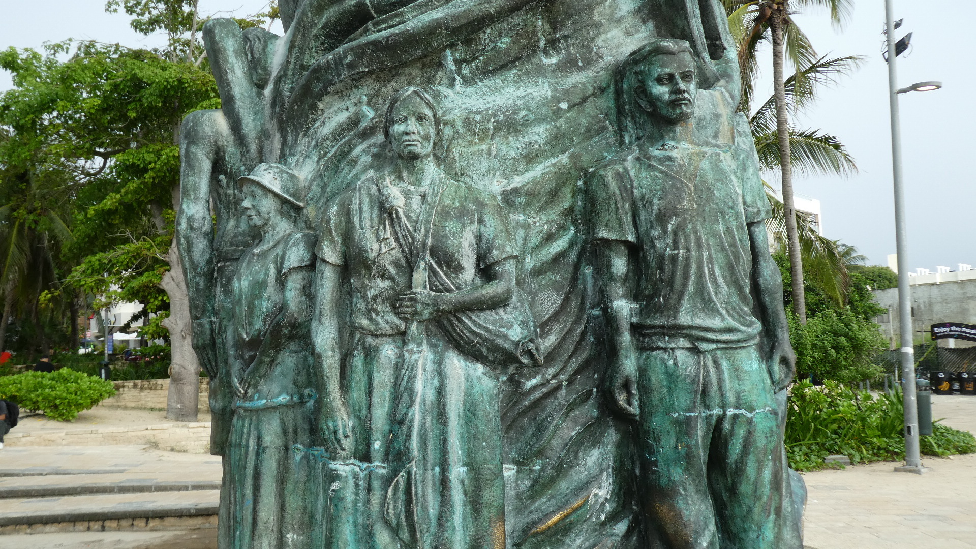The two figures are naked and borne aloft by swirling wind and wave. We assume they symbolize tourists on the beach. Around the base of the statue are images of what we take to be Spanish settlers, who are probably being credited with building Playa and its facilities. Fair enough. Only on one side is there an actual Mayan guy, blowing a ceremonial shell.