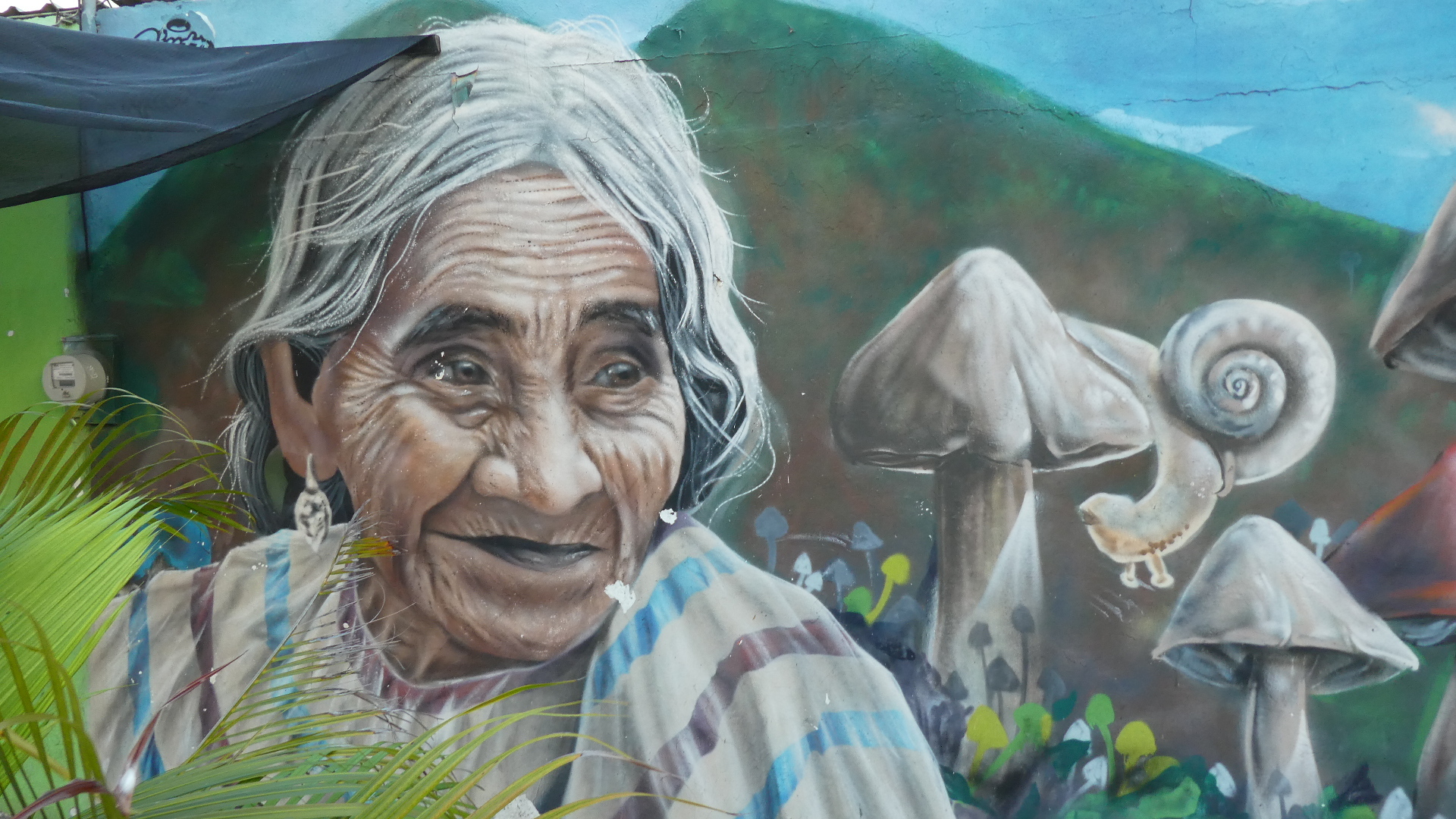 As we continued, we noted some of the many other murals around town, like this one depicting a Mayan and a Spanish profile, and the abuela with the mushrooms and snail.