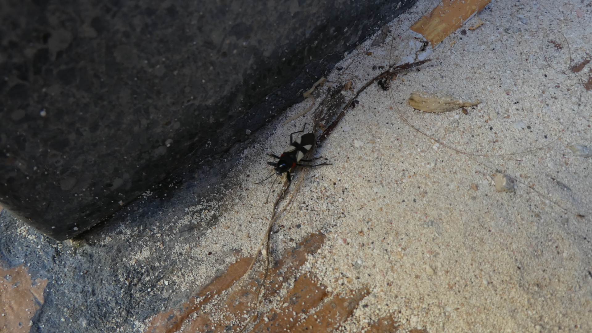 While looking down, my favourite direction, I spotted this sort of striking bug. I thought at first it could be a spider, but no - six legs. It looks a little like like an assassin bug, but ...ideas?