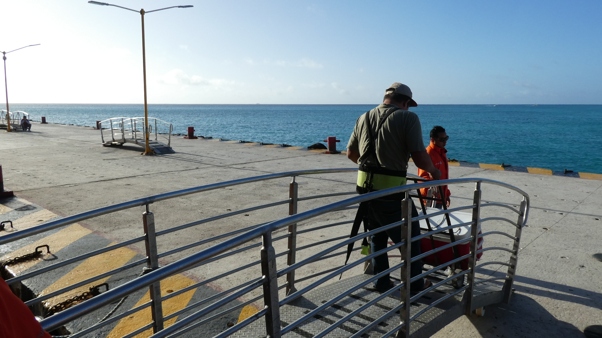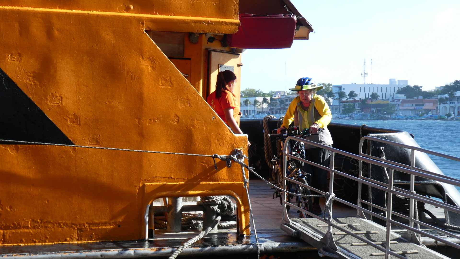 At the Cozumel dock, the wind was higher and the waves jumpier, but Dodie jockeyed the bikes down the gangway on her own. Very good.
