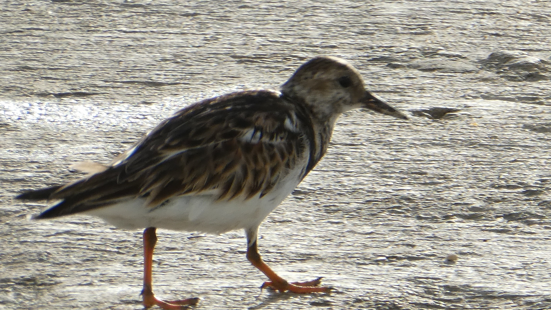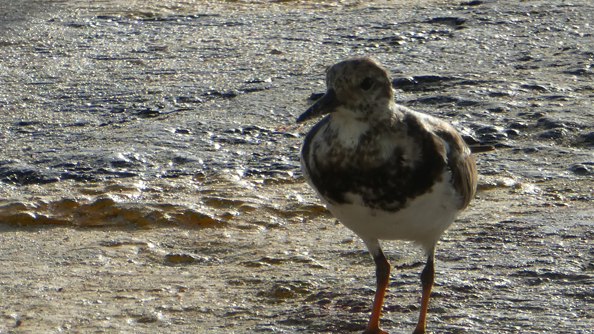 When the boat came and we did our roll down, there were a couple of more wrinkles. The boat was heaving by the pier, moving up and down about two feet, and there was a gangway that was compensating by rolling back and forth. It turned out we were expected to put our bikes on the boat, in what was really a very secure railed area at the rear. But the bags needed to go into shelving inside at the front. That's where having a two person team helped. I negotiated the swinging gangway with the bikes, and then Dodie set about securing them while I dragged the bags to another gangway at the front. Our forethought made it all happen effectively, and we later congratulated ourselves for good thinking. Each half witted partner had added up to the needed one capable traveler. We even had time to shoot what we take to be a Ruddy Turnstone, which would be a new bird for us.