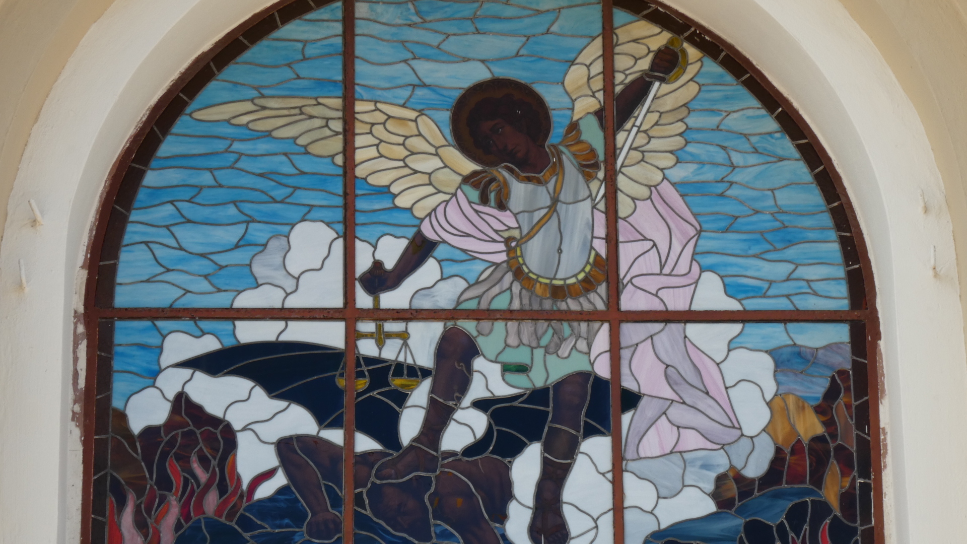I thought of St. George at first because of the dragon, but the scales are characteristic of St. Michael the archangel who is often depicted vanquishing satan in the form of a dragon. You might say the scales tipped the balance for St. Mike.