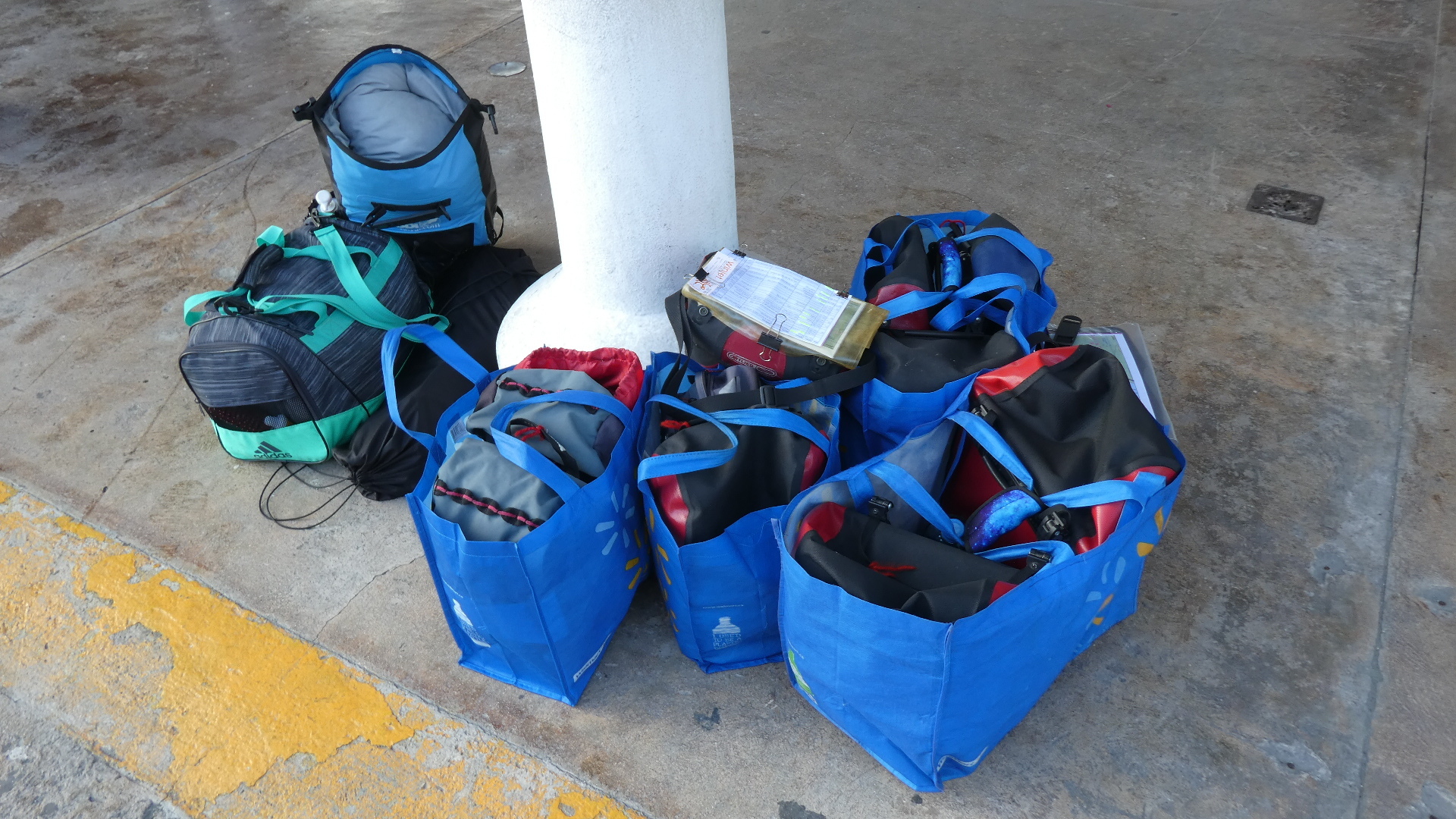 As we sat waiting for the ferry, we thought through how it all might go down. If crew were going to hoick our bikes up and over a railing, then clearly the bags needed to be off. We got a jump on this by taking all the luggage off right there, and loading the panniers into our large Walmart carry bags. But then how to get bikes and all those liberated bags down a long pier to the boat? We found to our relief that we could hang the bags on the handlebars, and then roll the whole show quite easily along. This could be a good trick for some future train stations as well.