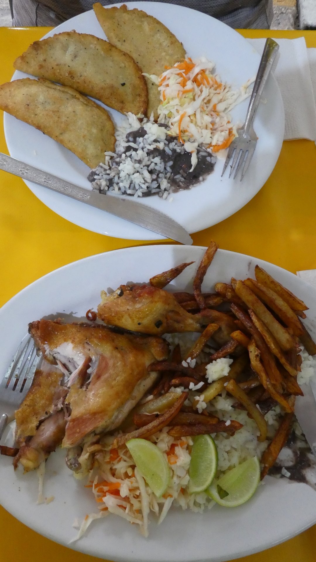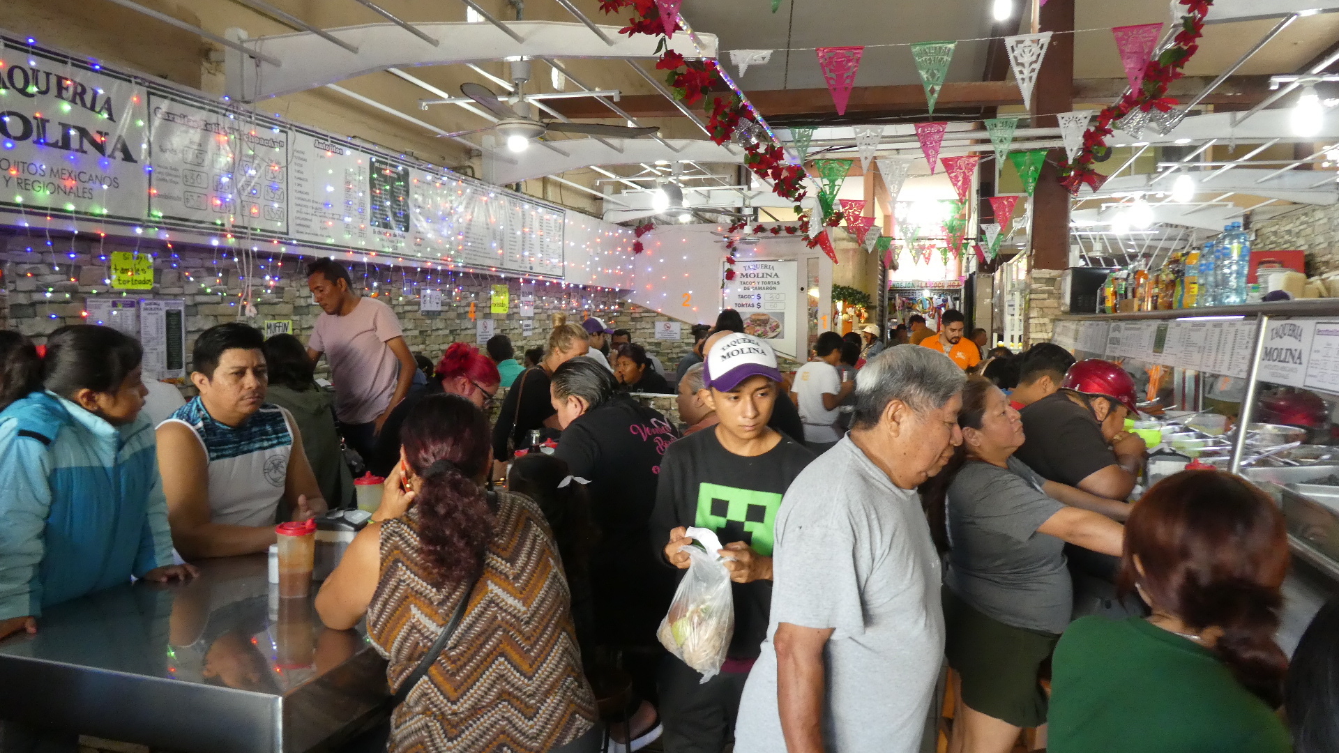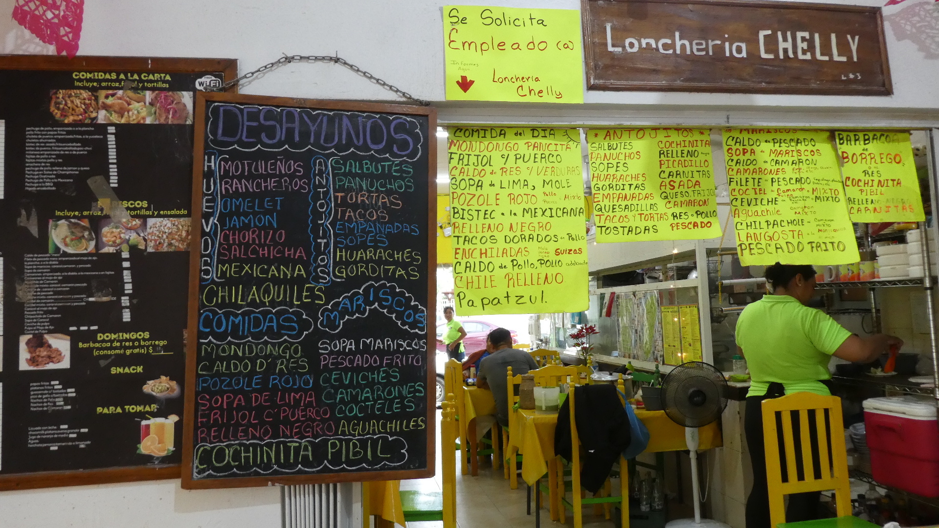We walked out to the market, but found it closed. Still, some of the surrounding restaurants were in operation. We chose Loncheria Chelly, where prices for a main dish were about 150 pesos. This is about 25% more than what we remember, and with the exchange rate about 10% worse than what we have had in the past, it comes to 35% or so more. Dodie thinks it's no use grousing, but we will surely be stopping at groceries more, or splitting "poison" sandwiches at OXXO.