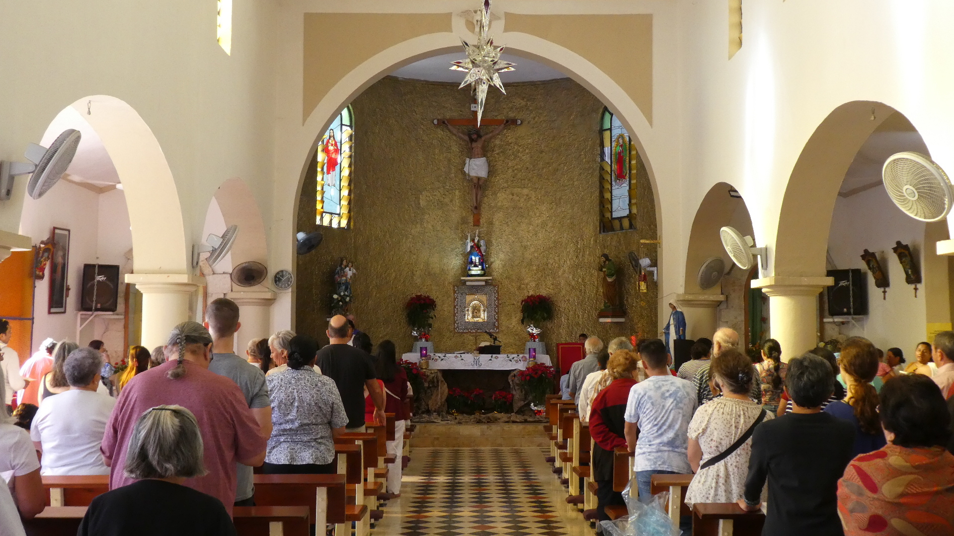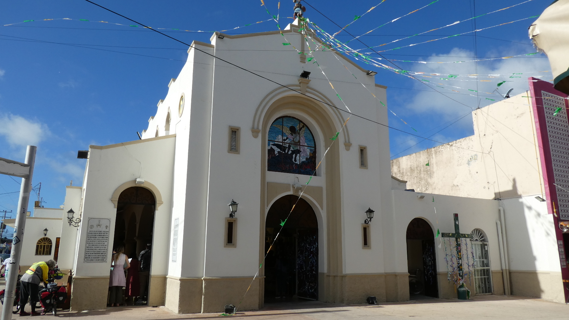 We pedaled a short distance from the dock and stopped to better arrange our gear. We turned out to be just at a church, with a Sunday service ongoing. A plaque nearby said that catholic services have been happening on the island since 1518. This is the earliest date of any mass in Mexico.