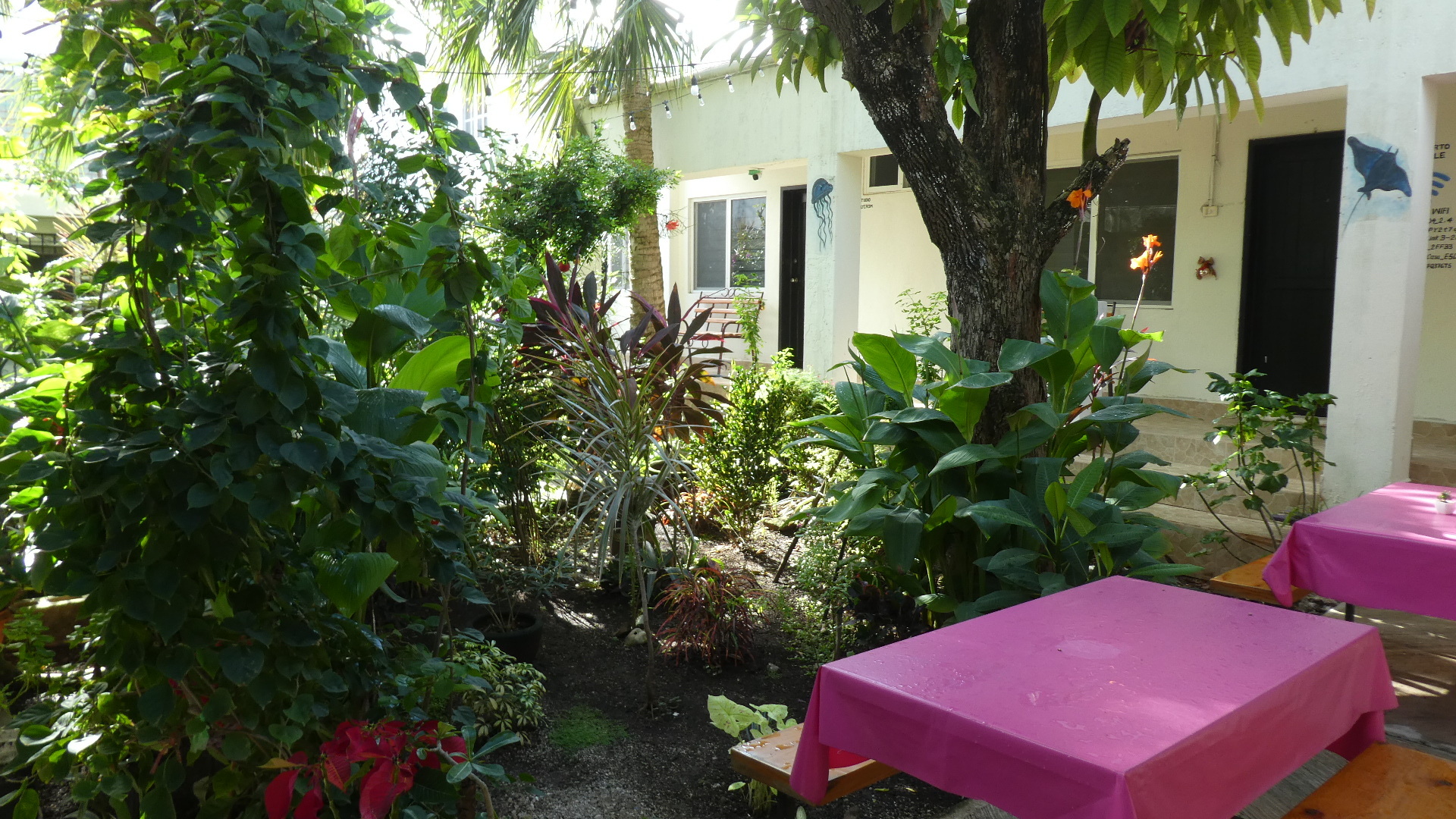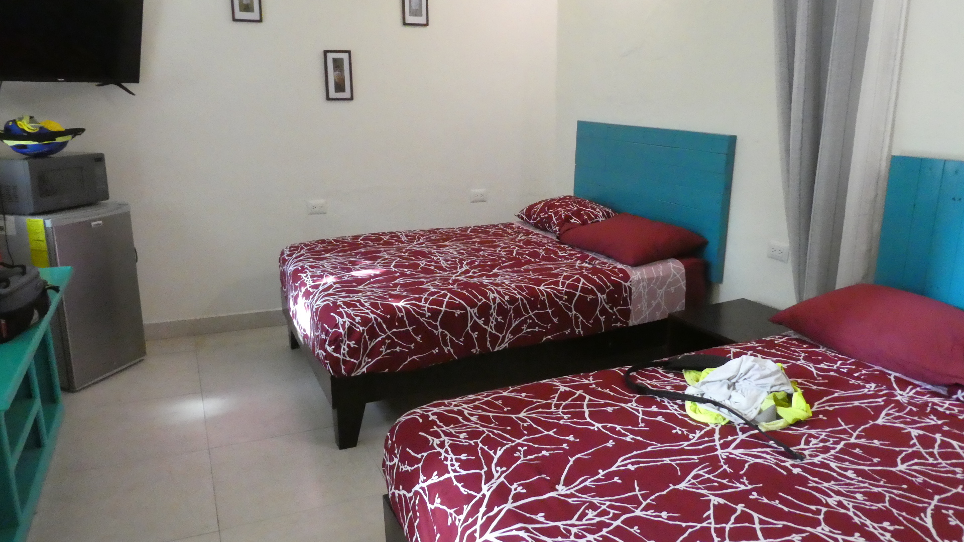 We returned to town, and were surprised to find that the BEA hides a lovely garden, and that our room could easily fit the bikes, has a fridge and microwave, A/C, lots of plugs, and an adjoining available kitchen!