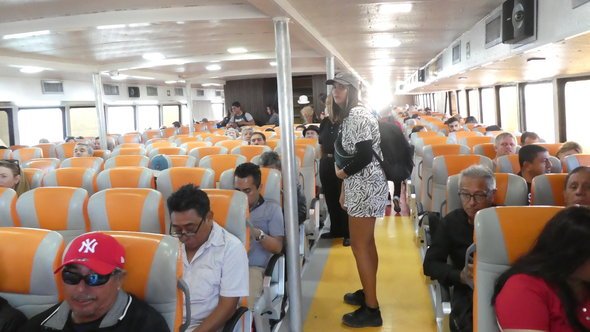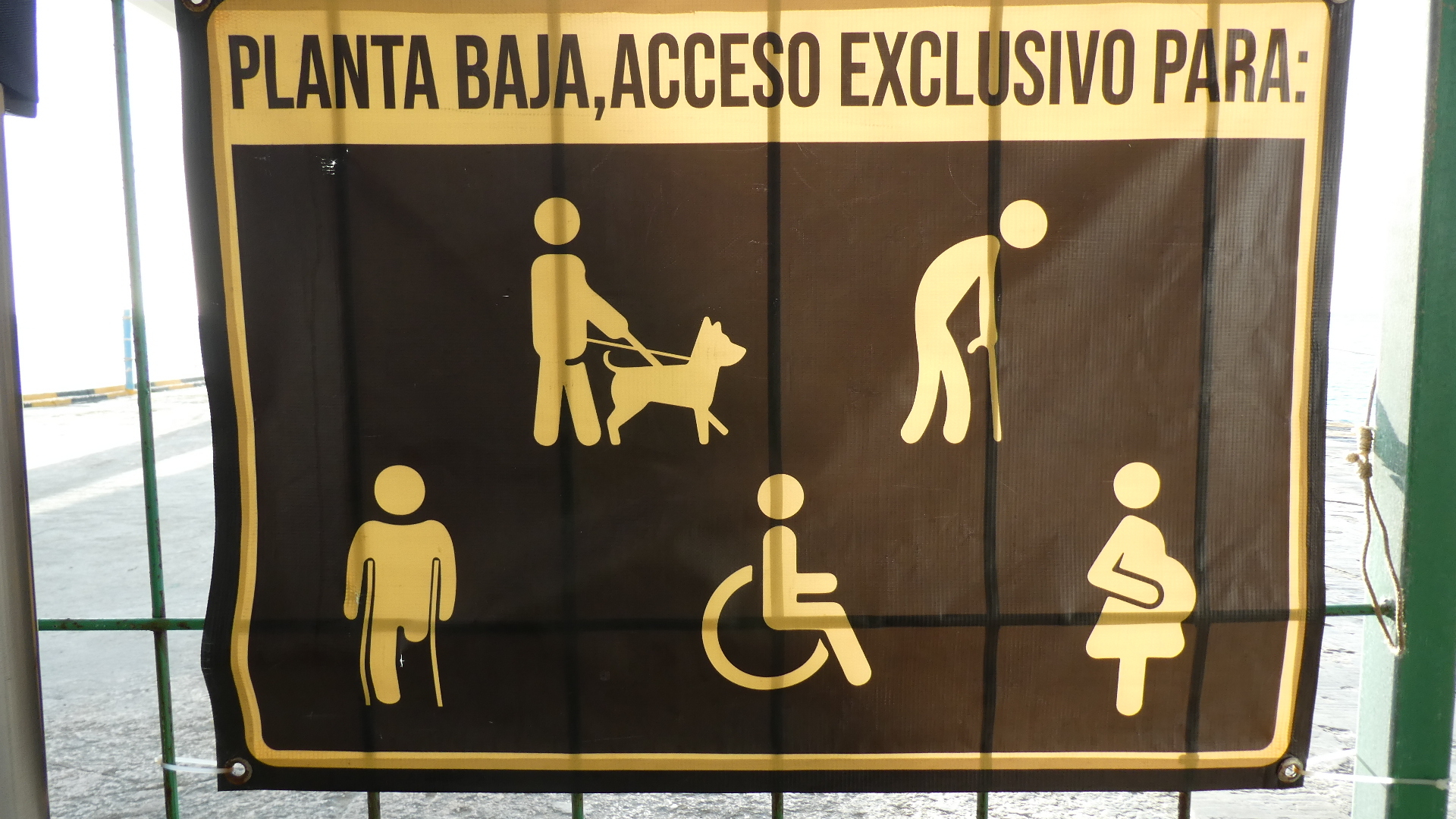 We went down to the dock, avoided an overhead walkway accessed by steps, and lined up where wheelchairs, blind people, and such are welcomed.