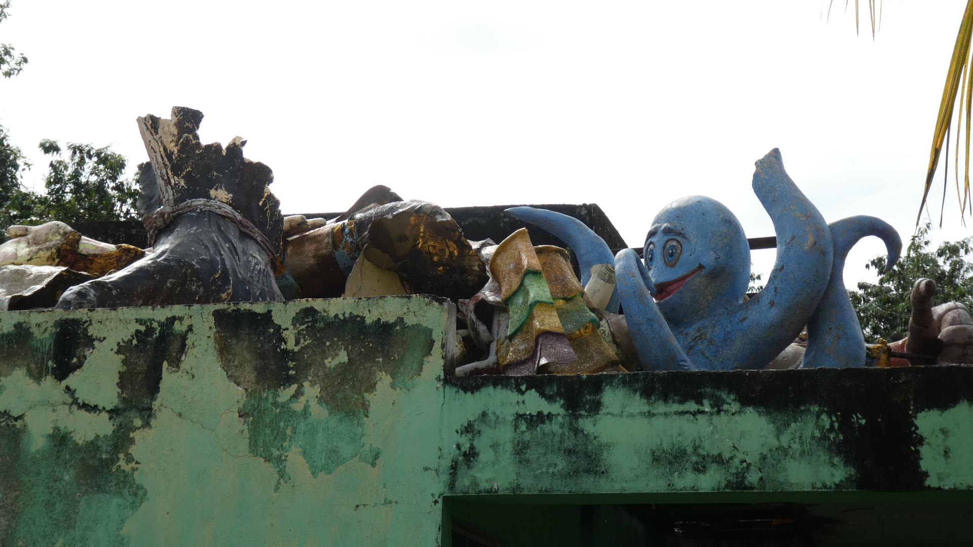 Here was a weird one - a building with piles of what must have been theme park props, stacked randomly on its roof.