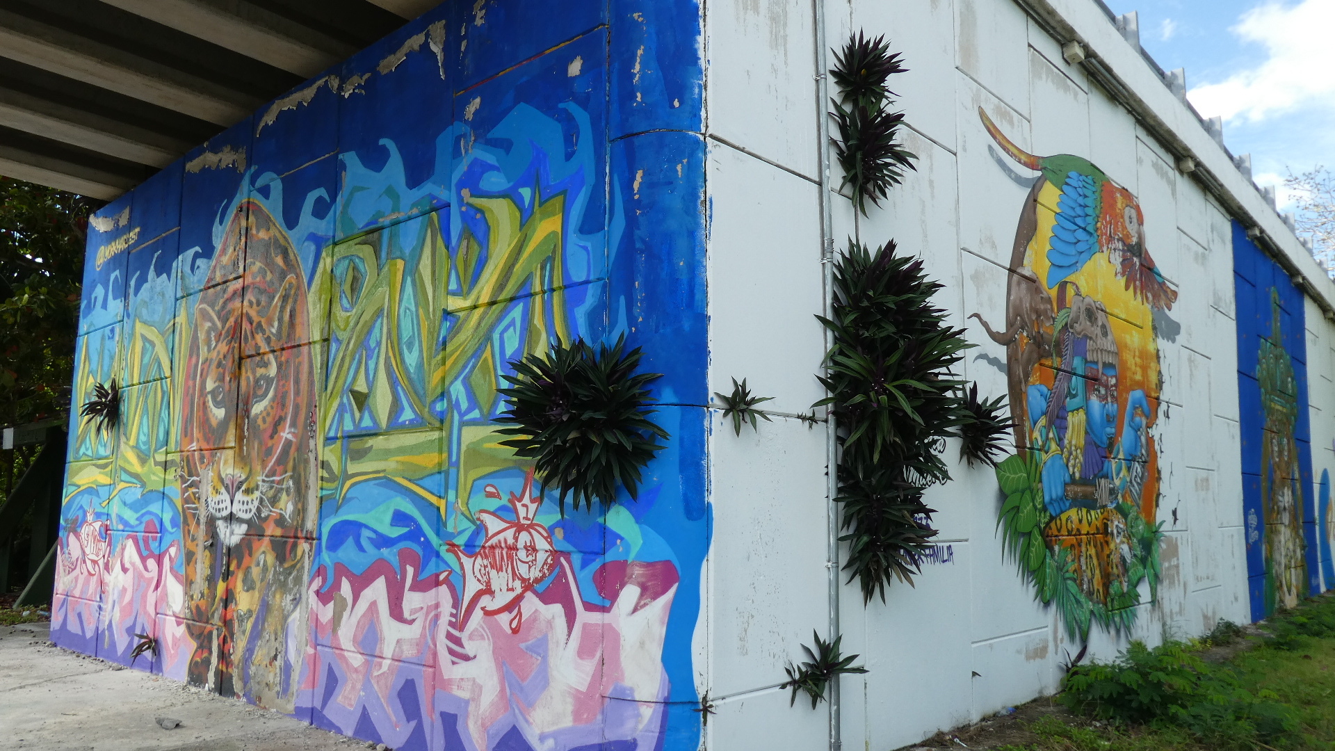 Along the way we rested in the shade o bus shelters, or overpasses, like ths one. Dodie liked the plants growing on the wall.