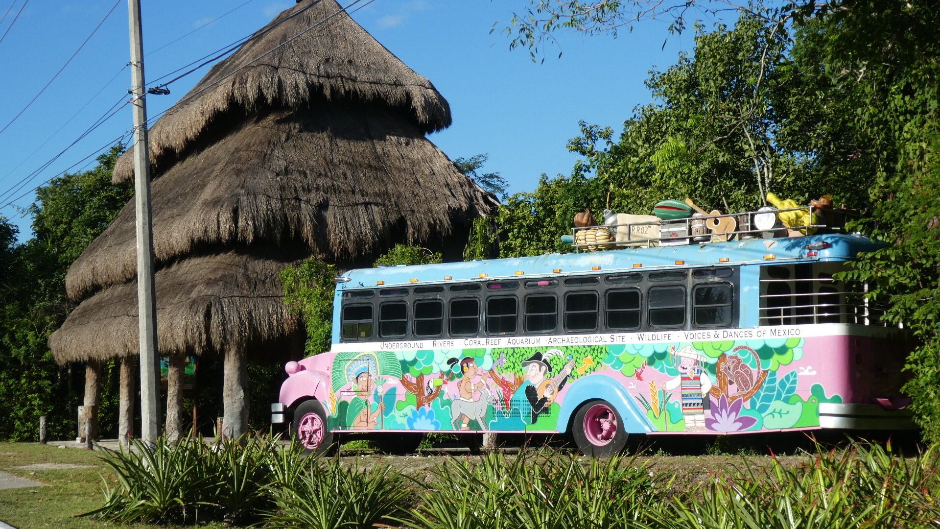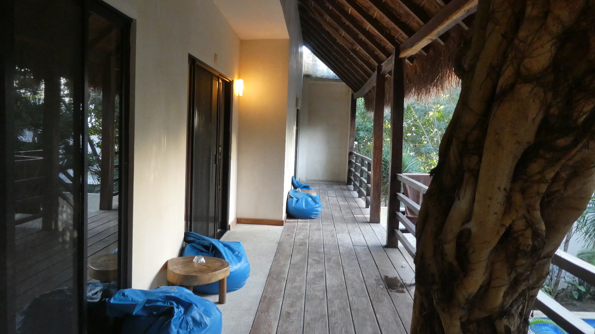 We pedaled on in to Tulum, dodging construction and noisy traffic all the way. Eventually we came to the corner where a right turn could eventually take us past Gran Cenote and on to Coba. Our hotel, the "Uolis Nah" was near that corner. The corner always has a pretty good burrito stand, and also there is a Super Aki grocery. But it also is always a total zoo of construction, snorting trucks, and noise.
