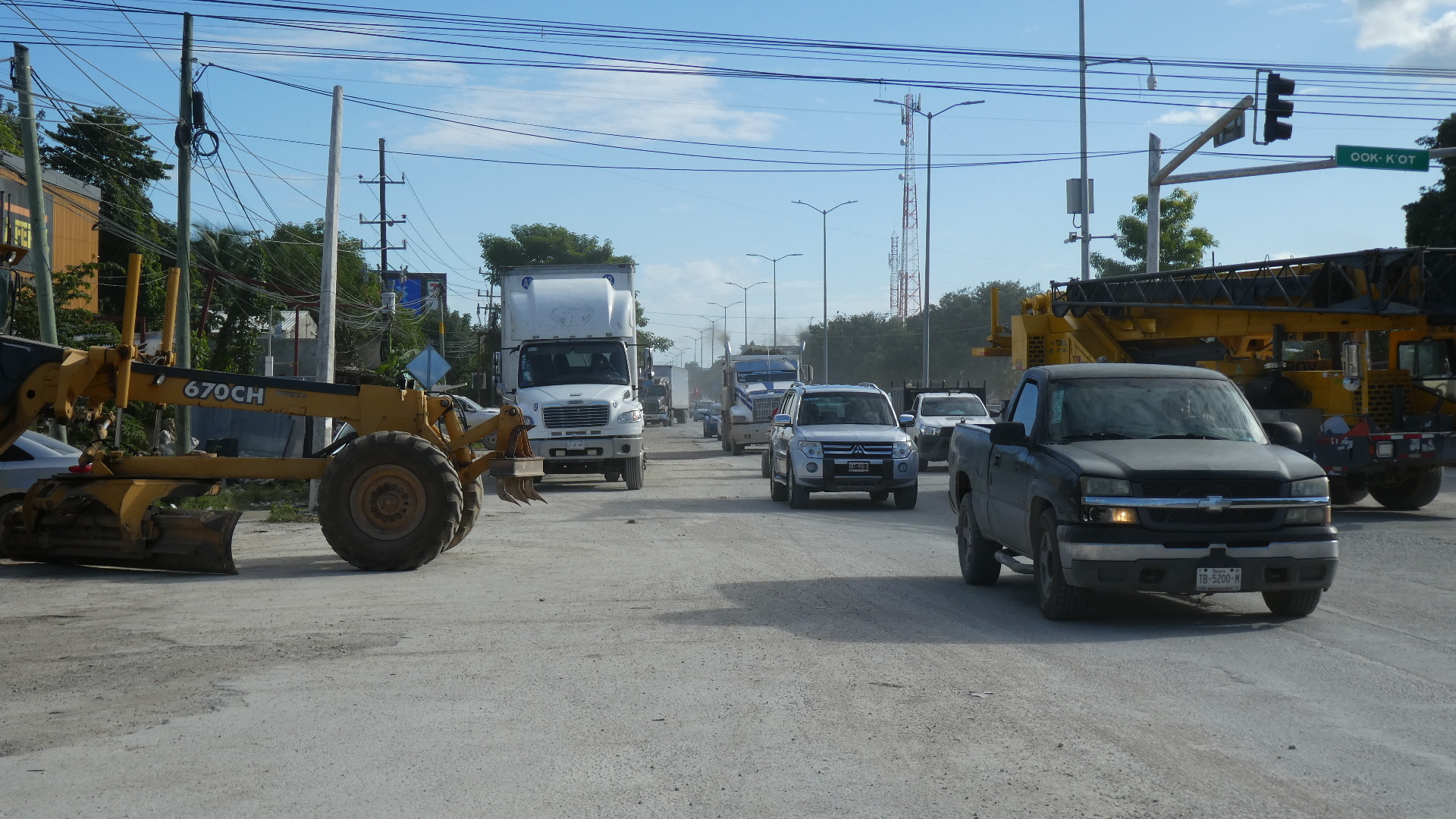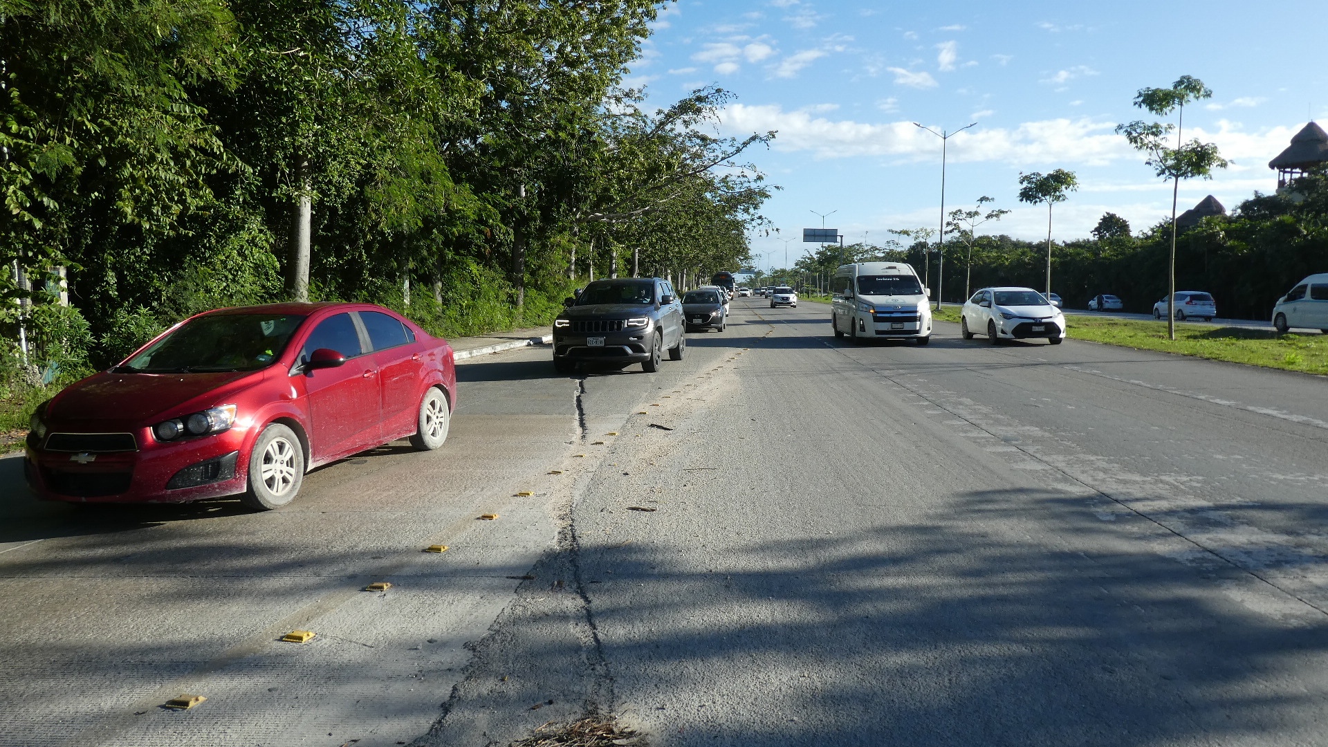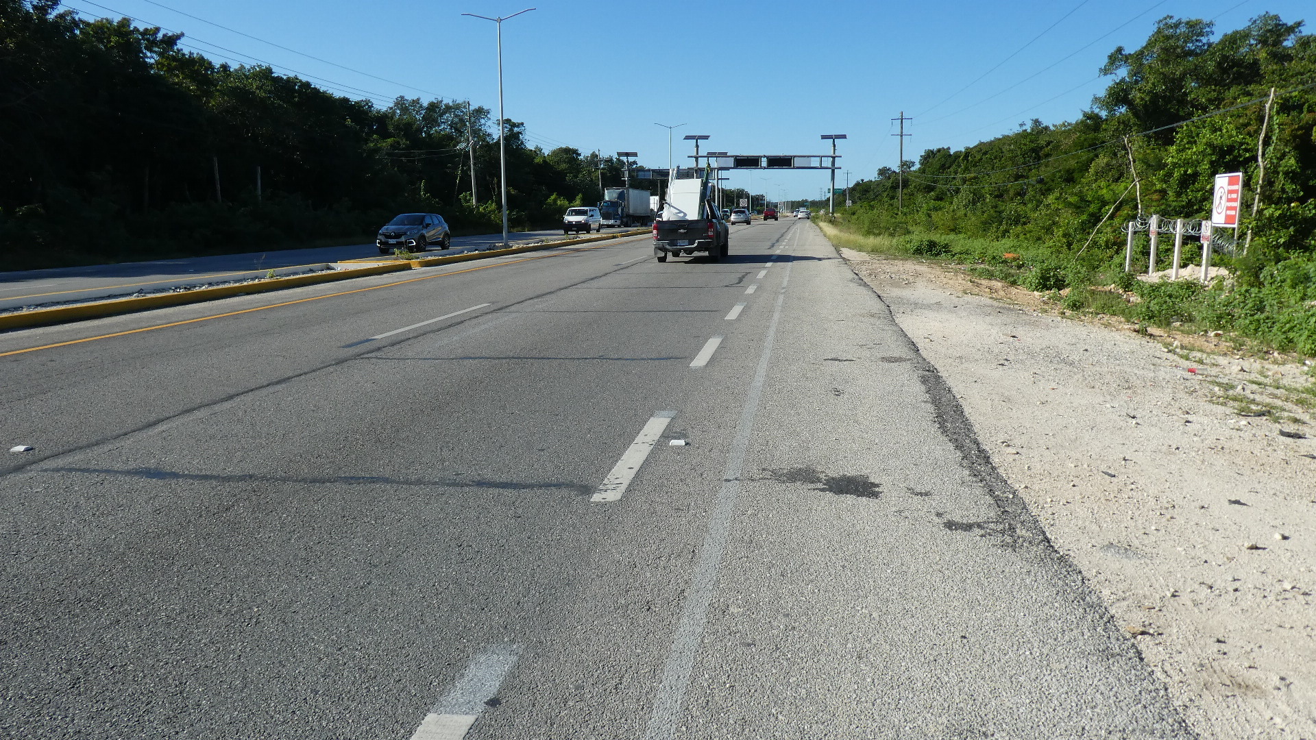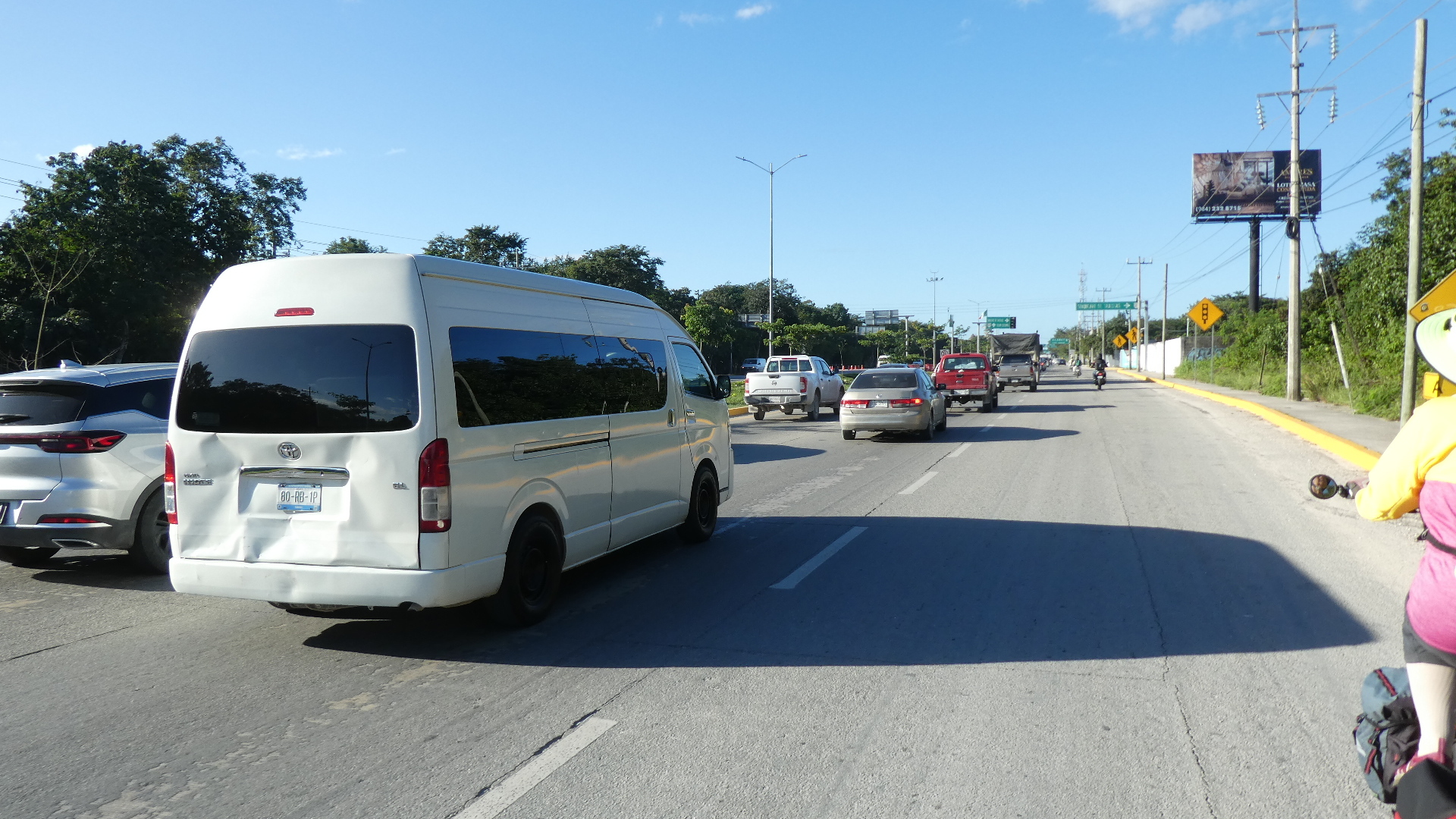 One of the problems with cycling a high speed limited access road is that while you may have a shoulder, it becomes useless at off and on ramps. In the photos below, half the traffic is exiting for the Xcaret theme park. We got off our bikes here, and Dodie simply got the traffic to stop.