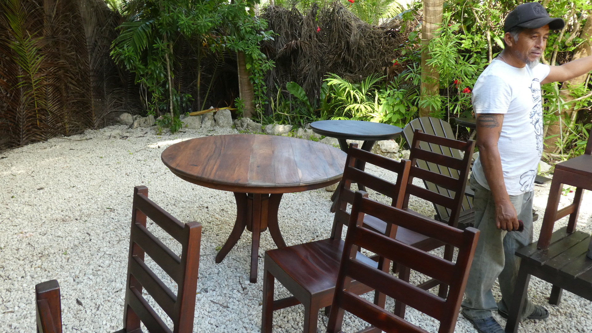 We took a short walk around the grounds, and were introduced to a man refurbishing some of the restaurant chairs. Virginia described him as a genius in his field, and also praised his command of English. We did not get the fellow's name but chatted for a while, about chair finishes and gluing at first, and then to learn that he had worked for some years in construction in Washington State. We talked about being an immigrant, and about the reasons for returning home. The man was thoughtful and articulate, and worthy of Virginia's praise. His son was also there helping with the chairs. He is home for the holidays, from studying in Izamal. I was gratified to find that he knew our hotel there, the San Miguel Arcangel and the big yellow church beside.