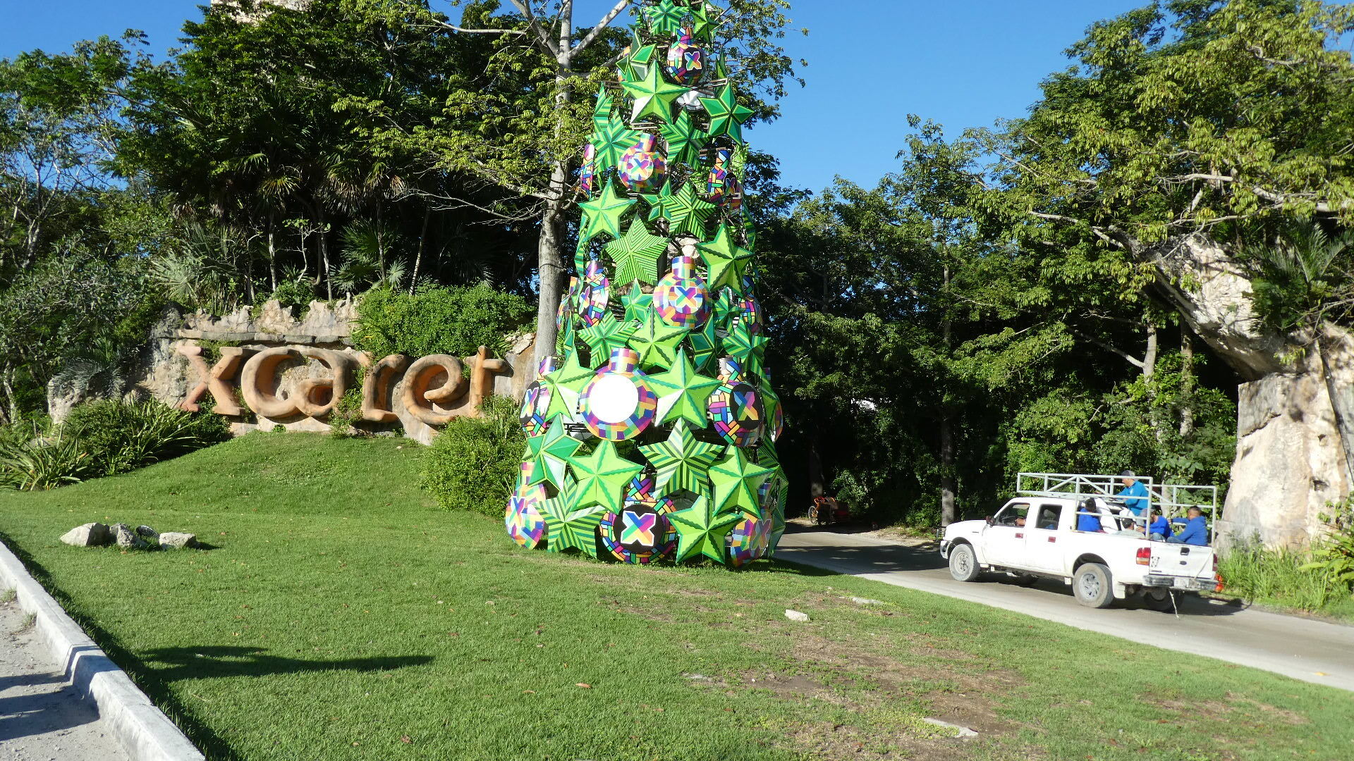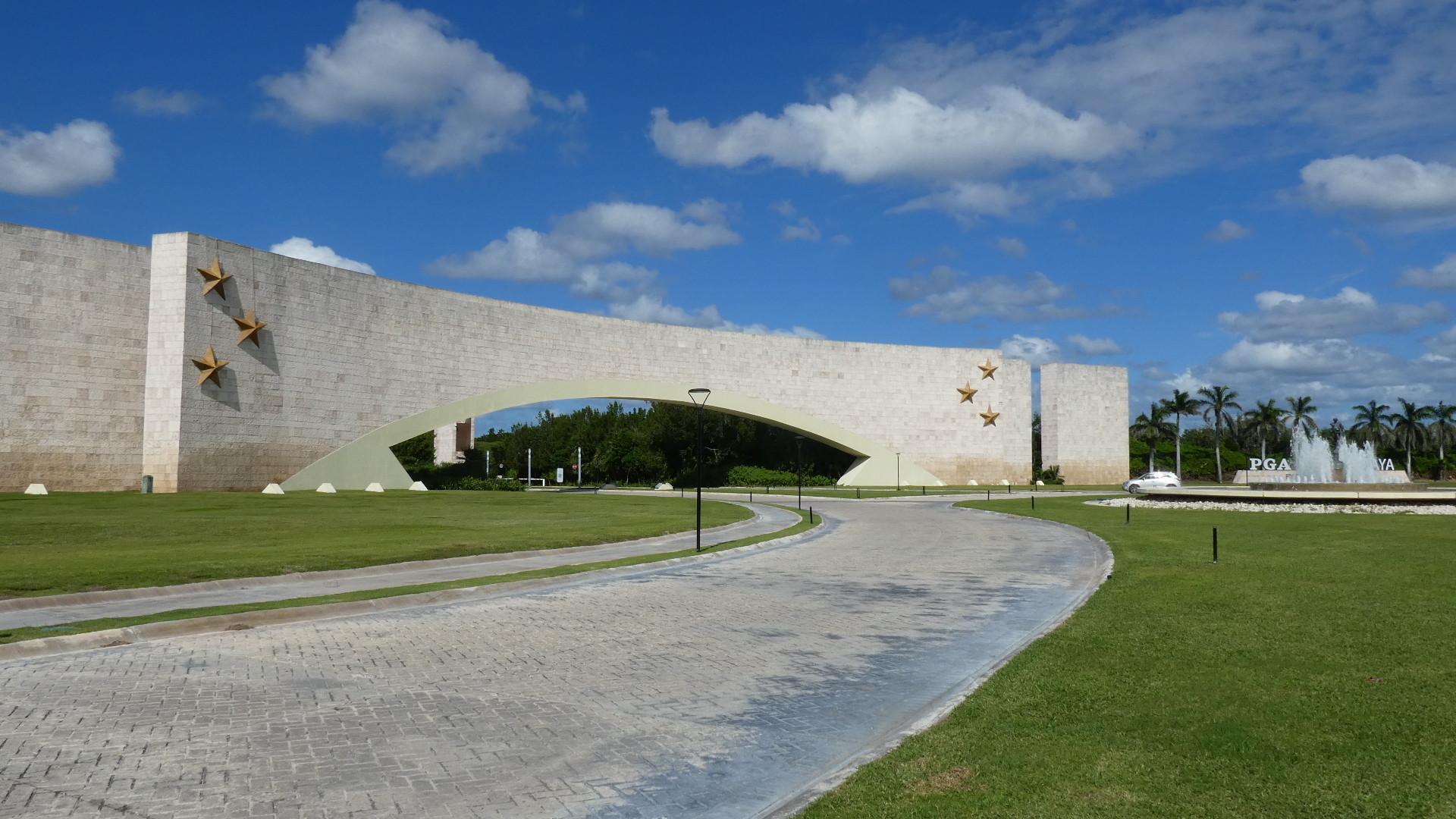 We reached the Tulum Country Club, which is quite a distance from Tulum. All the big hotels and theme parks have pretentious entrances, and this one is typical. This is the special distance along this ride where Dodie seems to always have absorbed too much heat. Last time they had their sprinklers on, and she wanted to run through them, but just then they turned off. This time she wanted to wet her shirt in their fountain. In the end we just basically poured water down her back. It's notable, because to locals (including the crocodiles) there is a cold snap going on here right now.