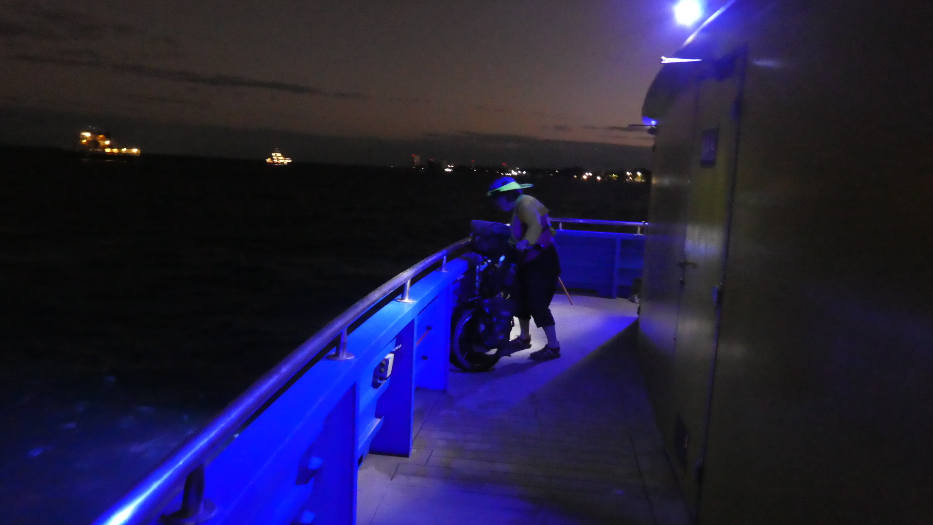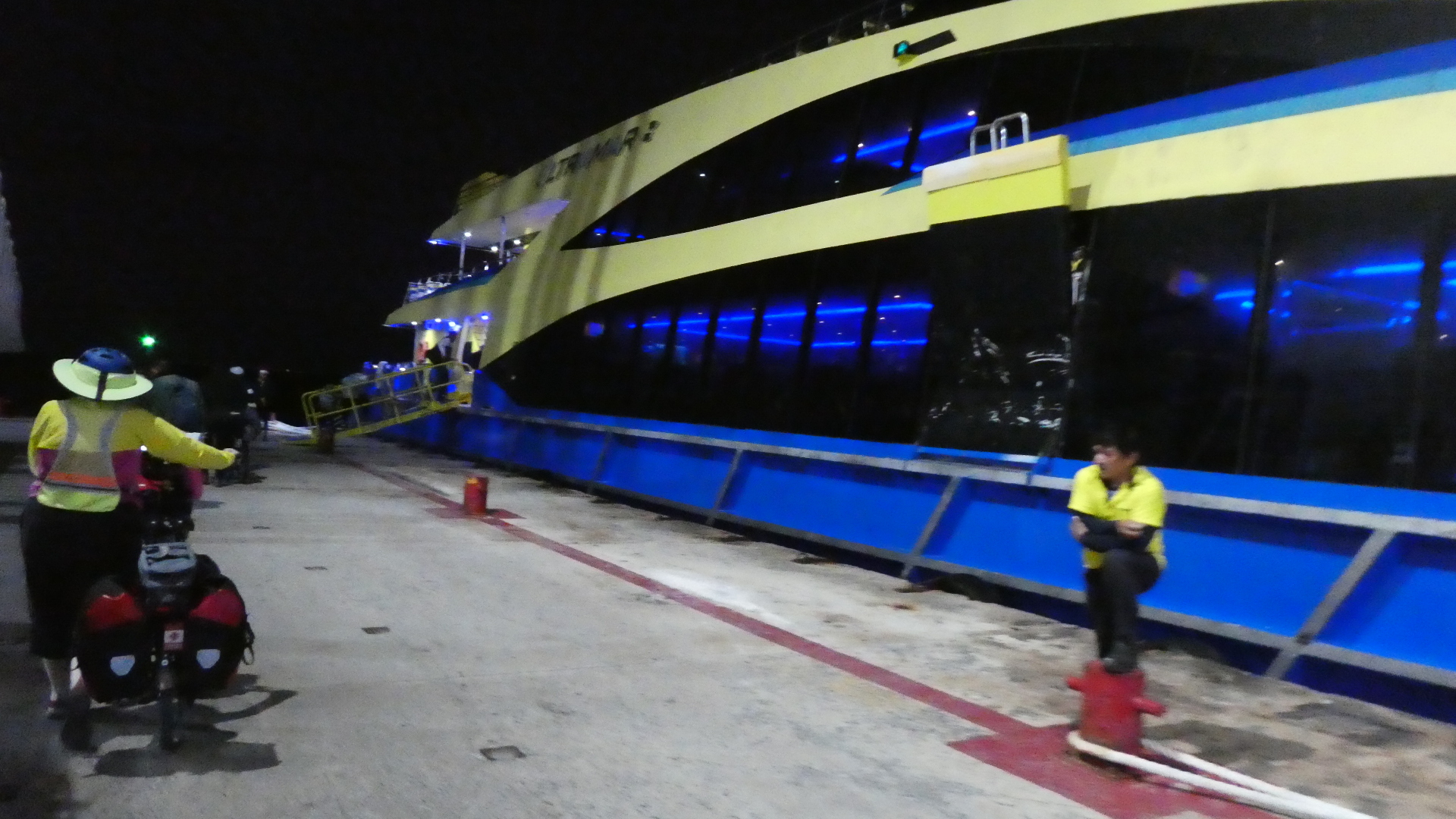 With Ultramar, there was only loading at one end, and all by the one gangplank. You can see it in the photo below. It turned out that the loaded bikes fit, in terms of width, but it was a short and steep push up the ramp.