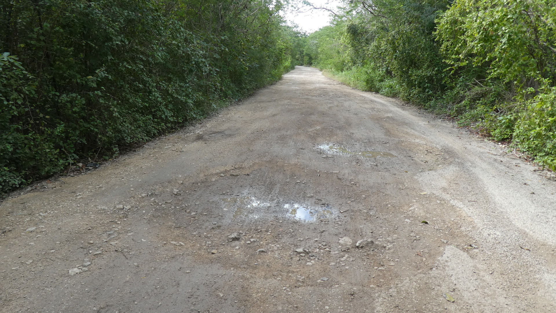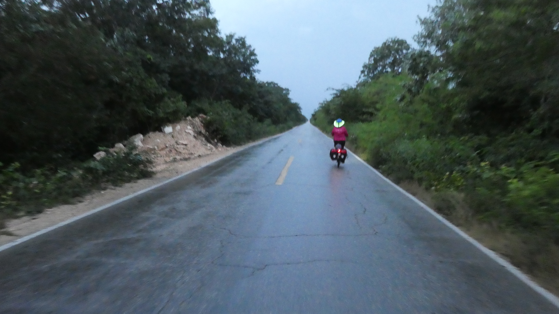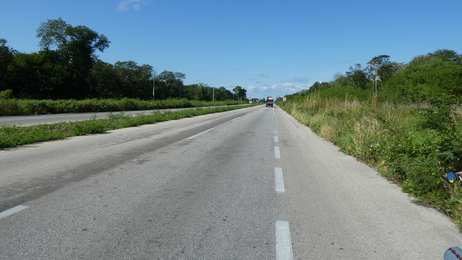 Yesterday's road that led past Chichen Itza had a shoulder for us, which makes sense for the volume of traffic. But today with that major attraction behind us, the road narrowed and the shoulder disappeared. The traffic volume also dropped, but not enough to make the new arrangement comfortable. So not quite, but a little, I was feeling like when riding the white line in Europe. One thing, though, there were no suicide passers. All the drivers just waited for the safe chance to pass. And even if we really clung to the side for them, they would neither sideswipe us nor take the risk out in the other lane.