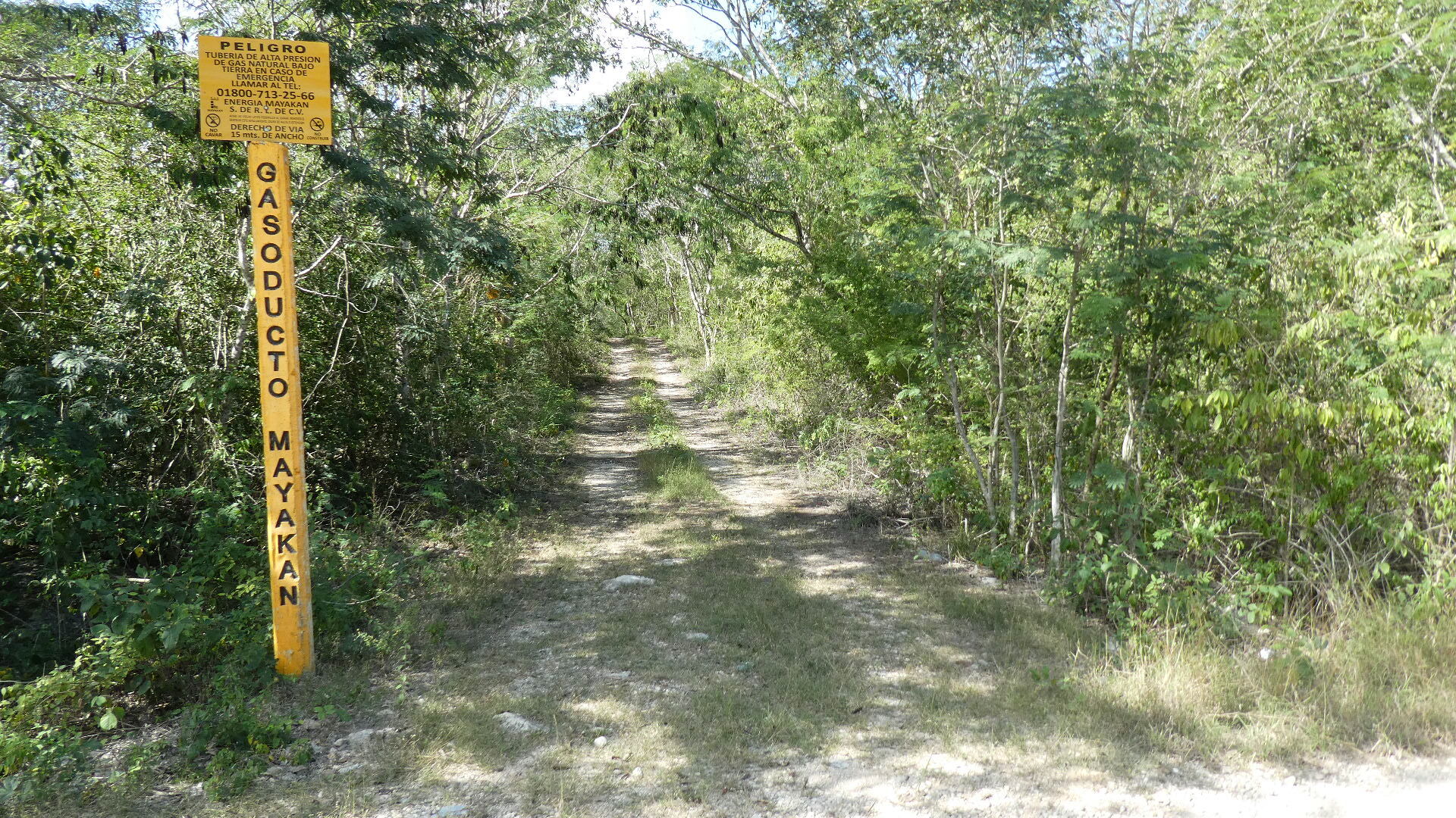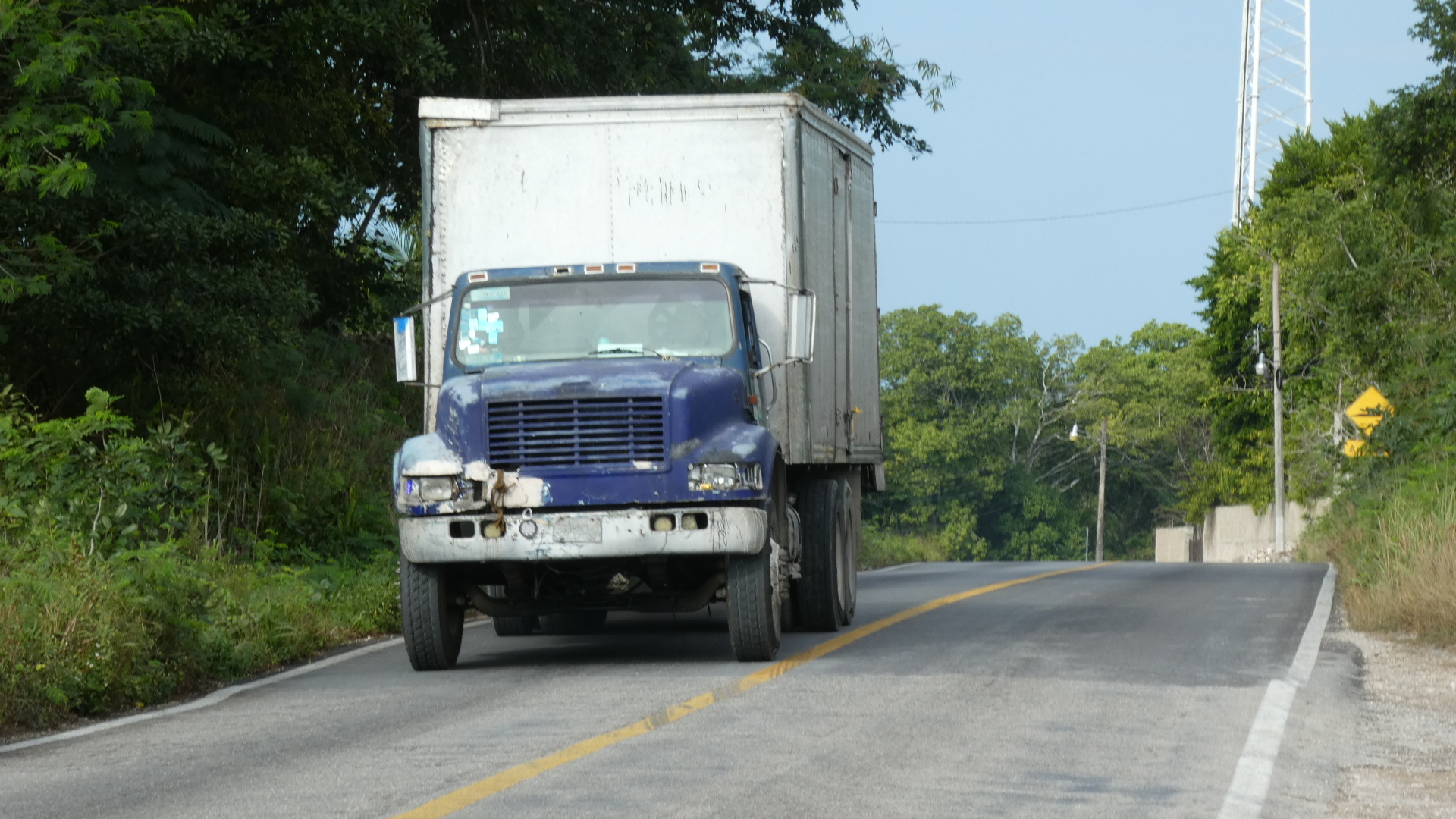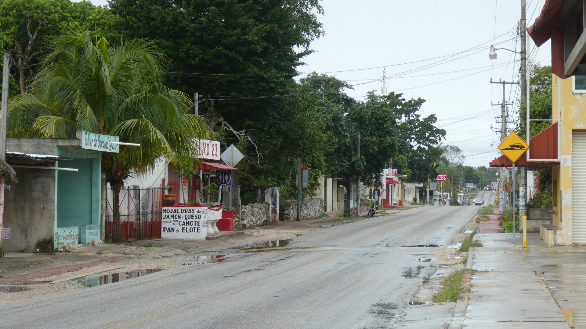 Yesterday's road that led past Chichen Itza had a shoulder for us, which makes sense for the volume of traffic. But today with that major attraction behind us, the road narrowed and the shoulder disappeared. The traffic volume also dropped, but not enough to make the new arrangement comfortable. So not quite, but a little, I was feeling like when riding the white line in Europe. One thing, though, there were no suicide passers. All the drivers just waited for the safe chance to pass. And even if we really clung to the side for them, they would neither sideswipe us nor take the risk out in the other lane.