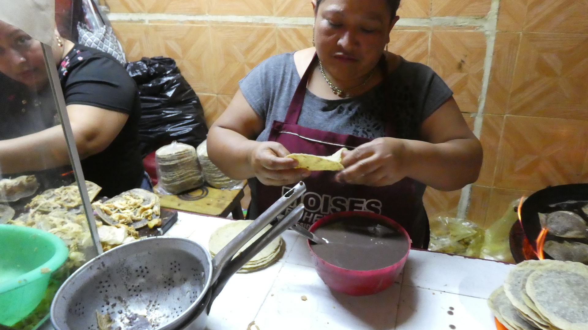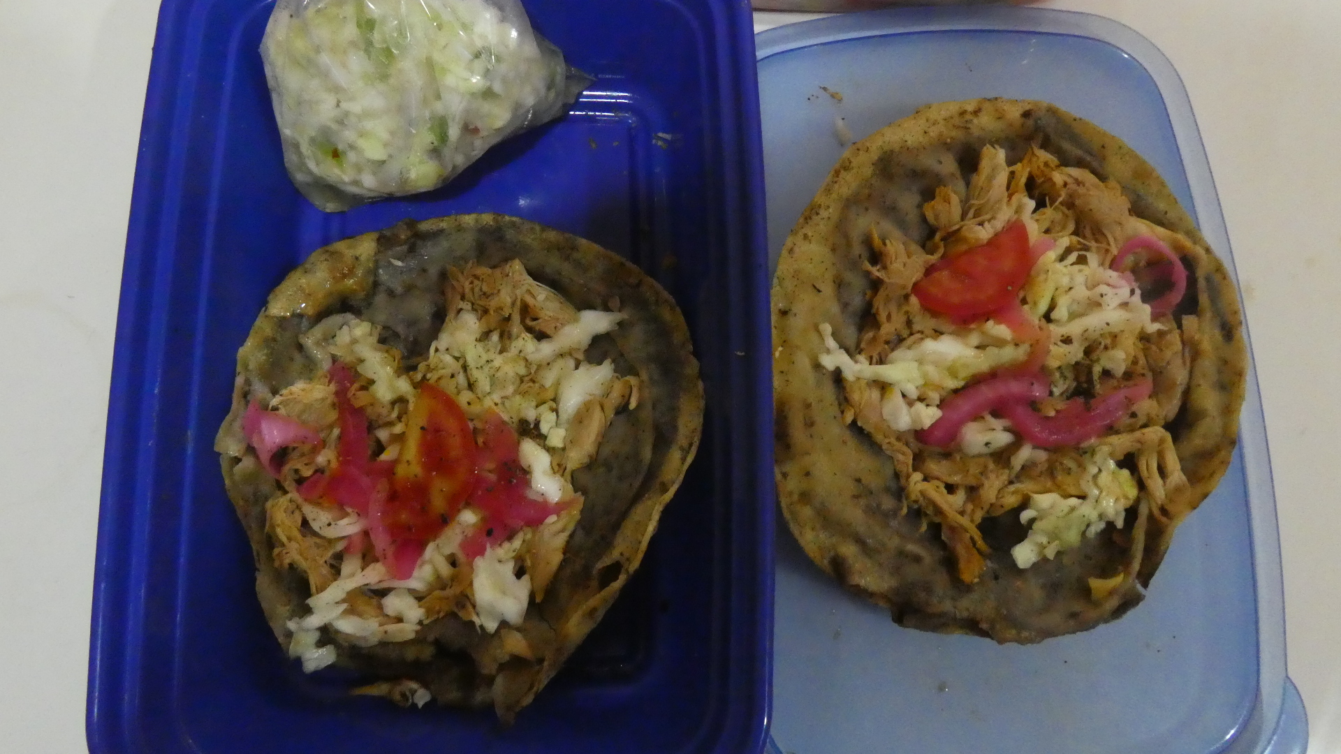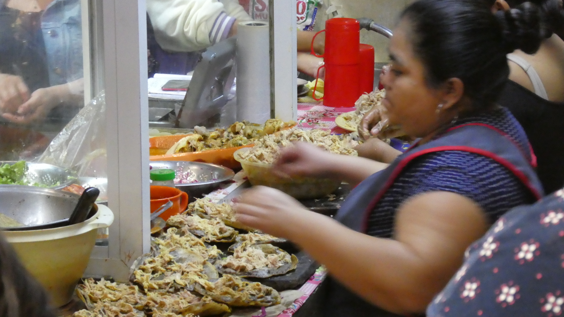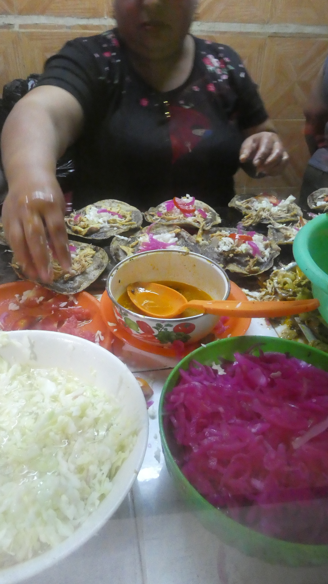I got to watch very closely as I waited in line. It turned out that everyone was making not tacos but panuchos. "A Panucho is a Mexican food specialty from the Yucatán made with a refried tortilla that is stuffed with refried black beans and topped with chopped cabbage, pulled chicken or turkey, tomato, pickled red onion, avocado, and pickled jalapeño pepper. It is occasionally topped with eggs in some variations."
