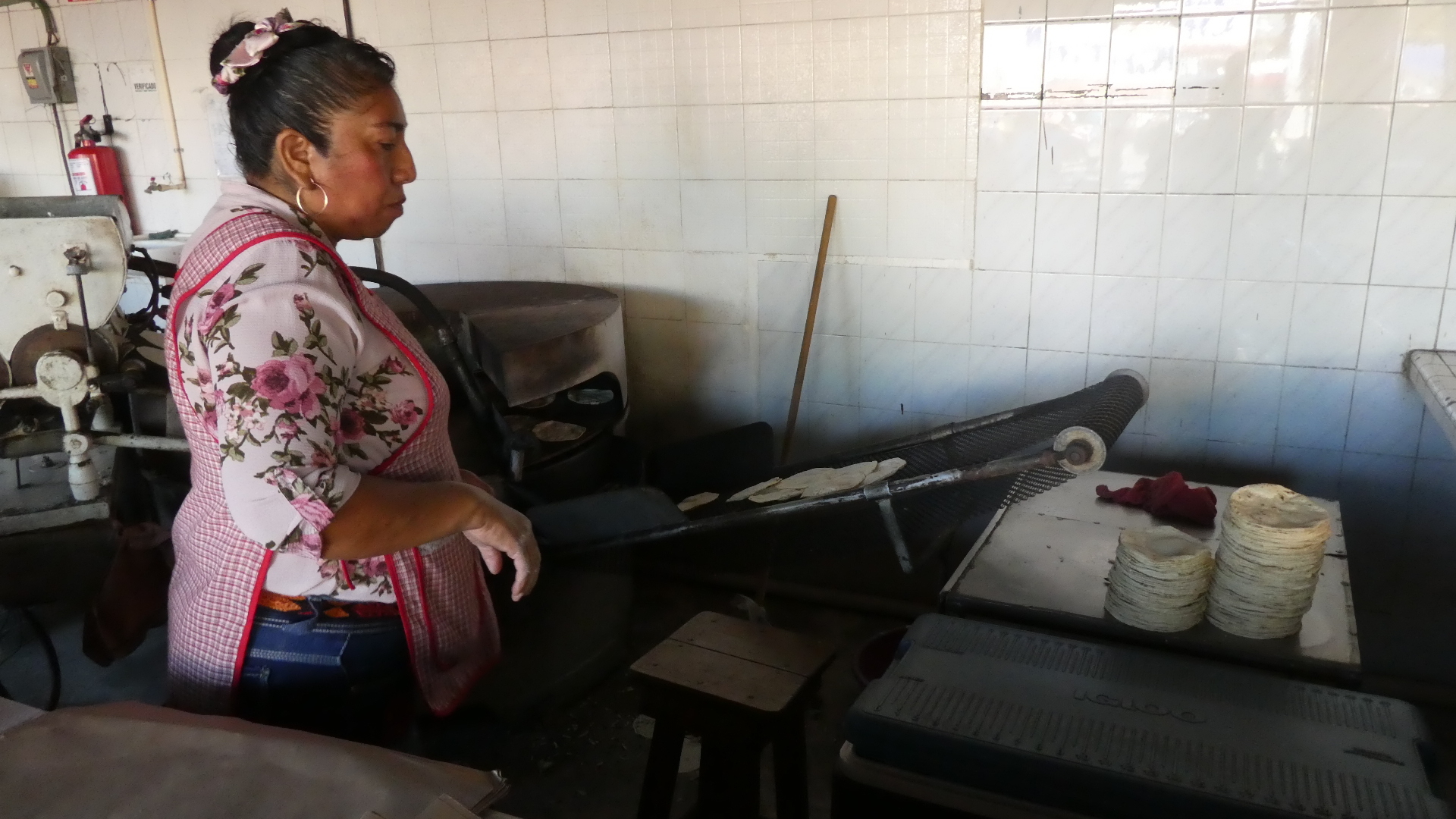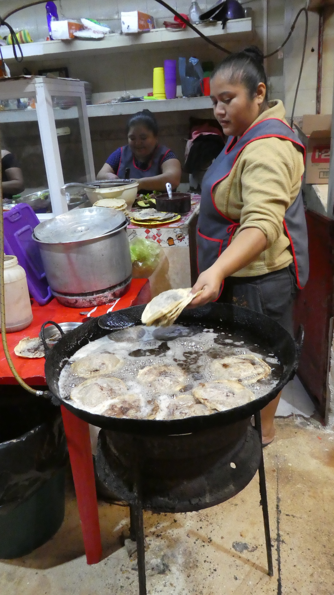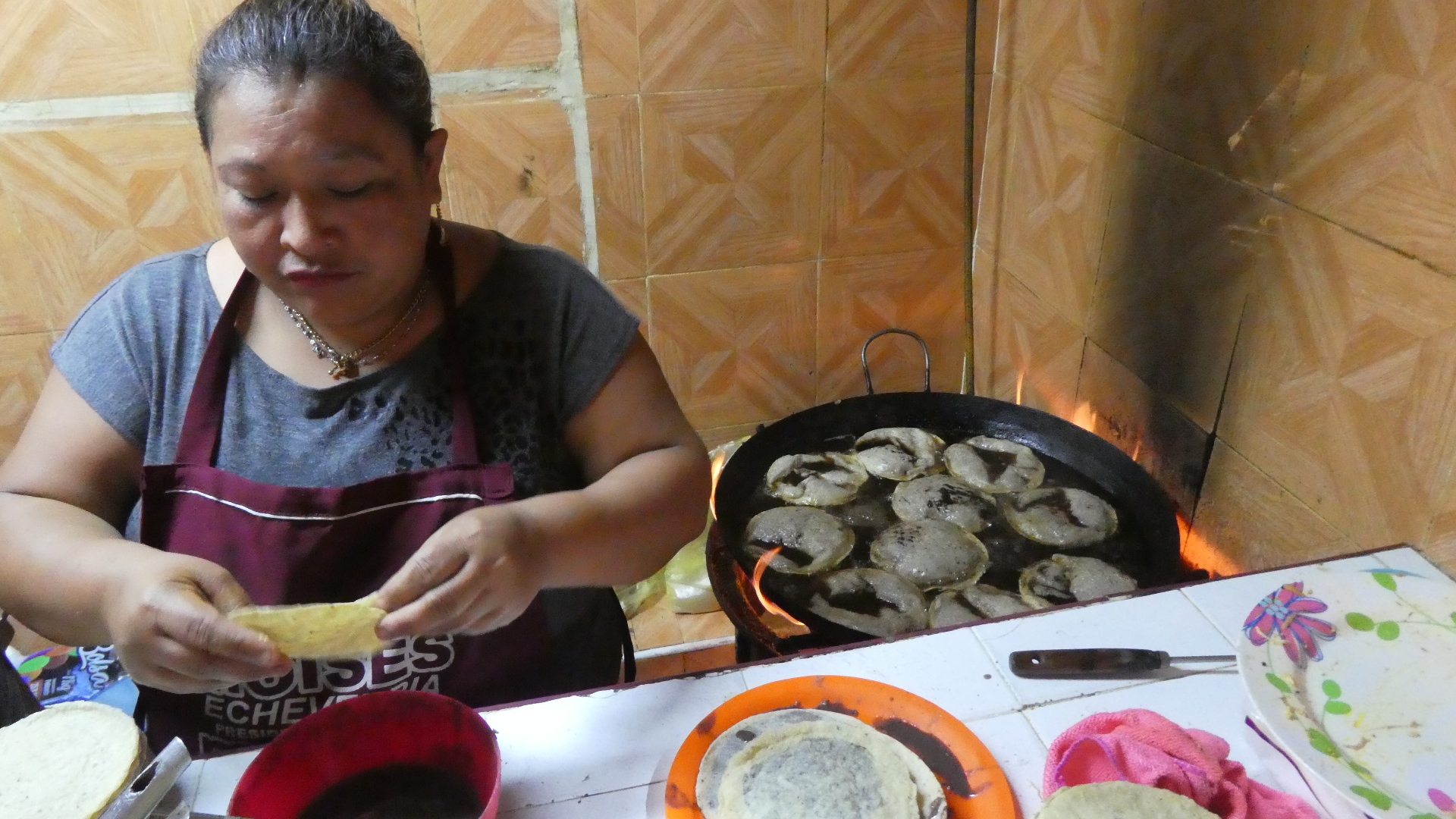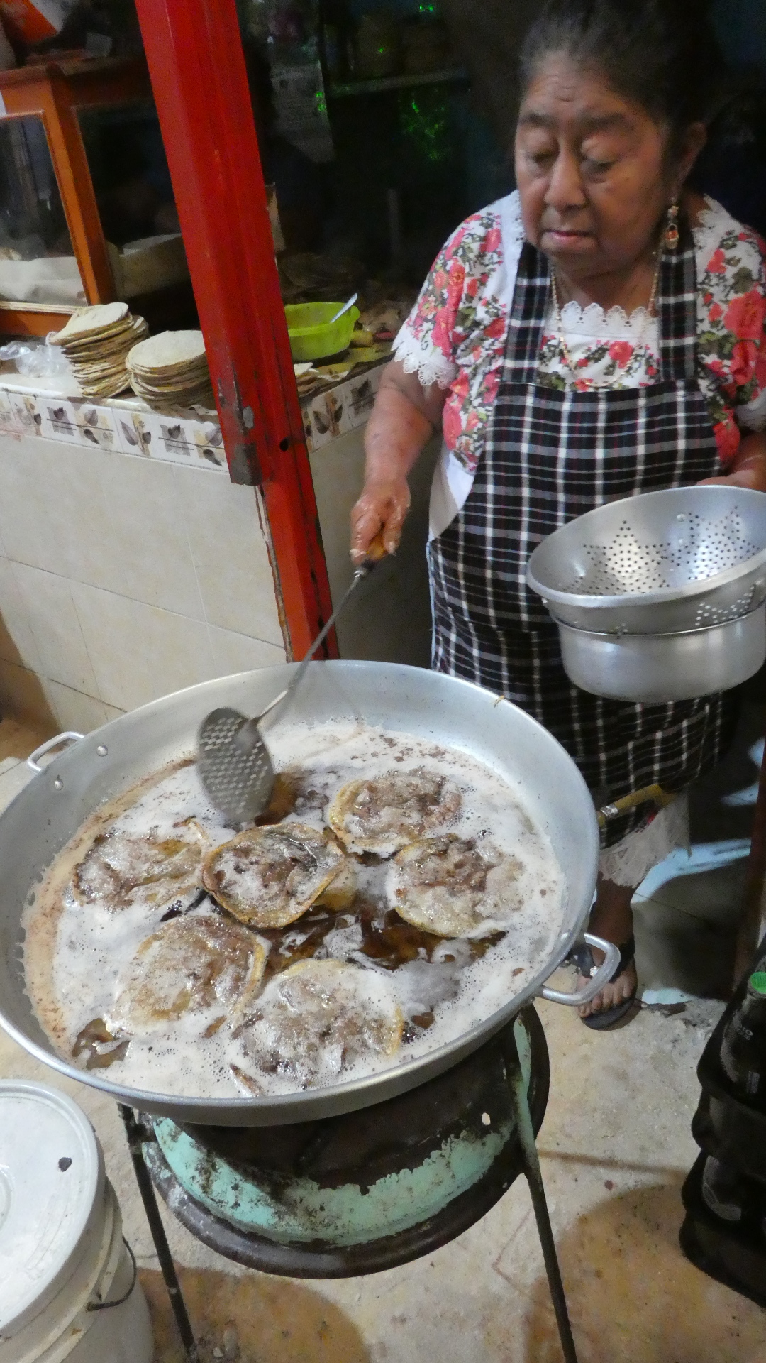 I was attracted by the process of "refrying" the tortillas, since of course I like fried food, as does everyone, right? In this case the tortillas seem to sit in the oil a long time. But this is not due to neglect. Abuela, in the photo below, checked on them very frequently.