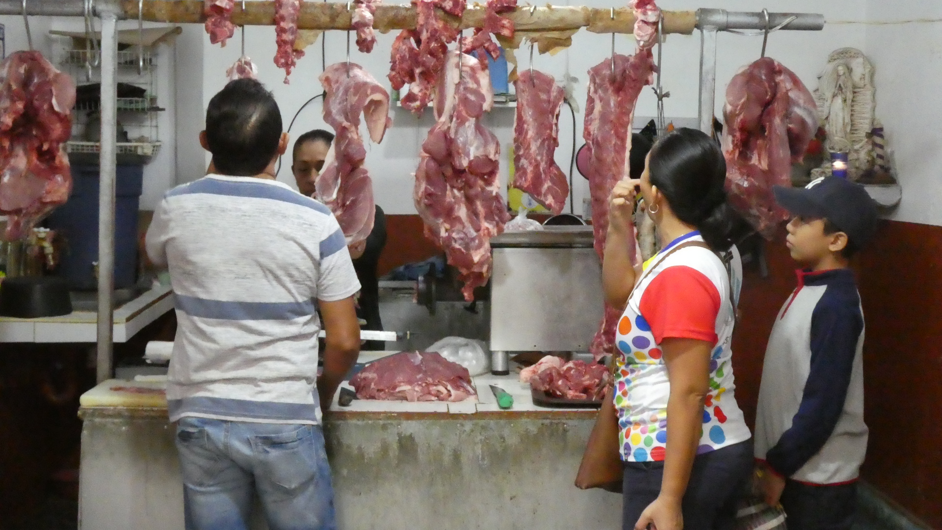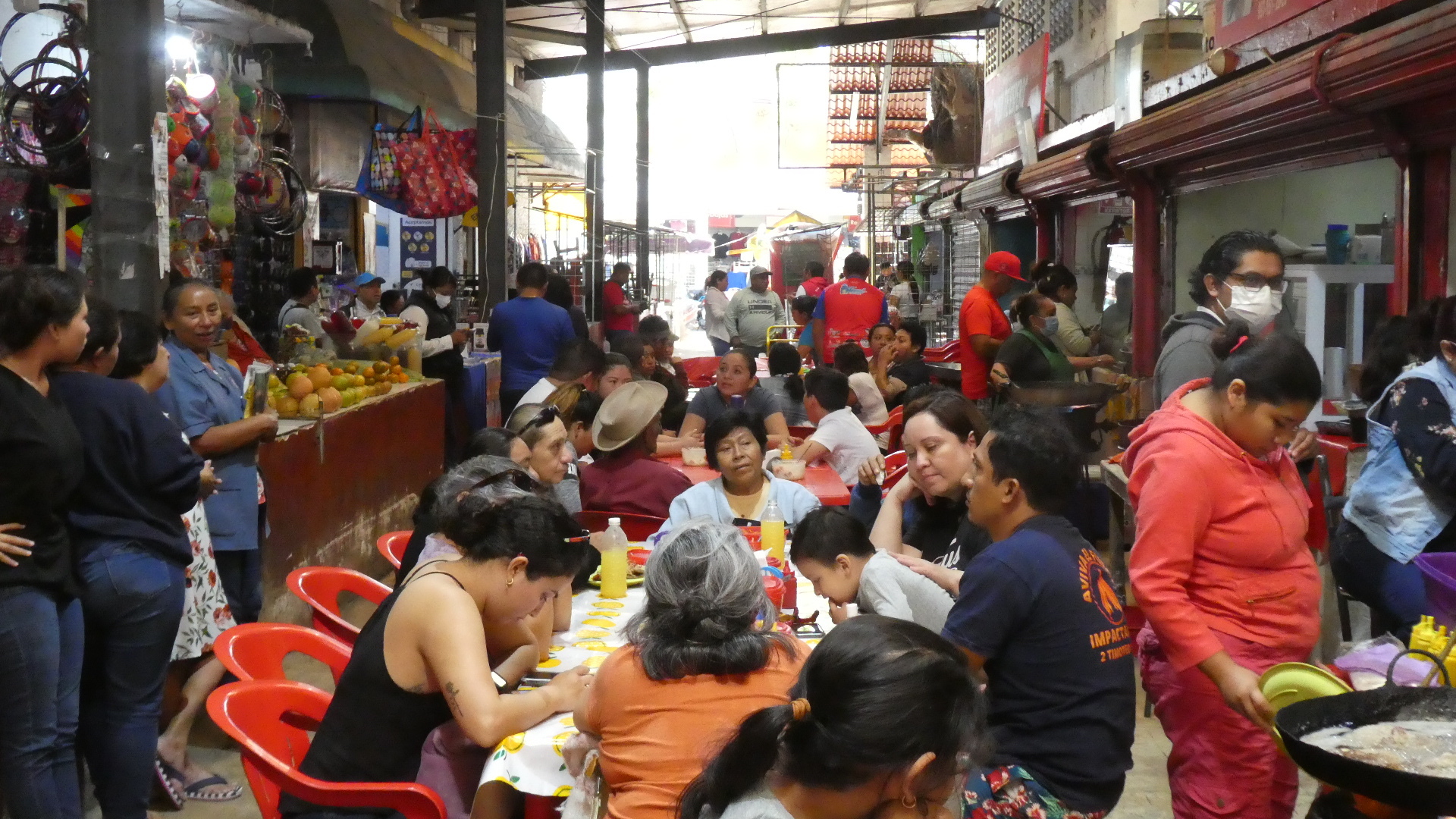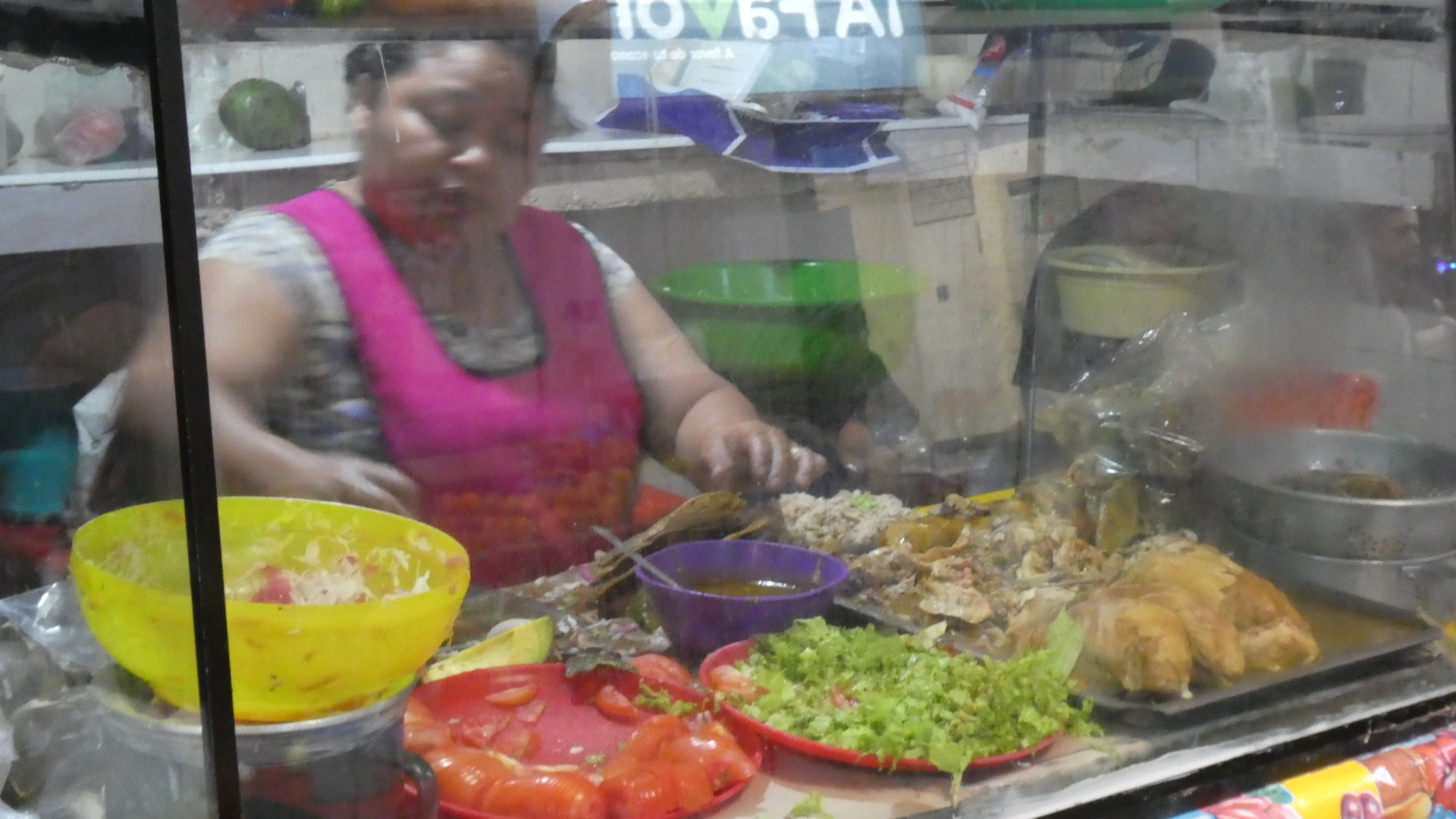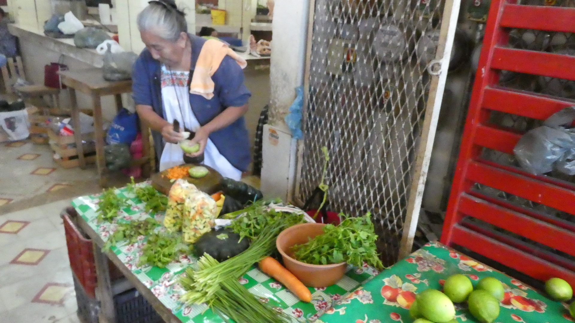 Other food preparation was going on in other parts of the market. For example, here below abuela is slicing small quantities of vegetables. I think those plastic baggies are her final product, but she is clearly not a big dealer.