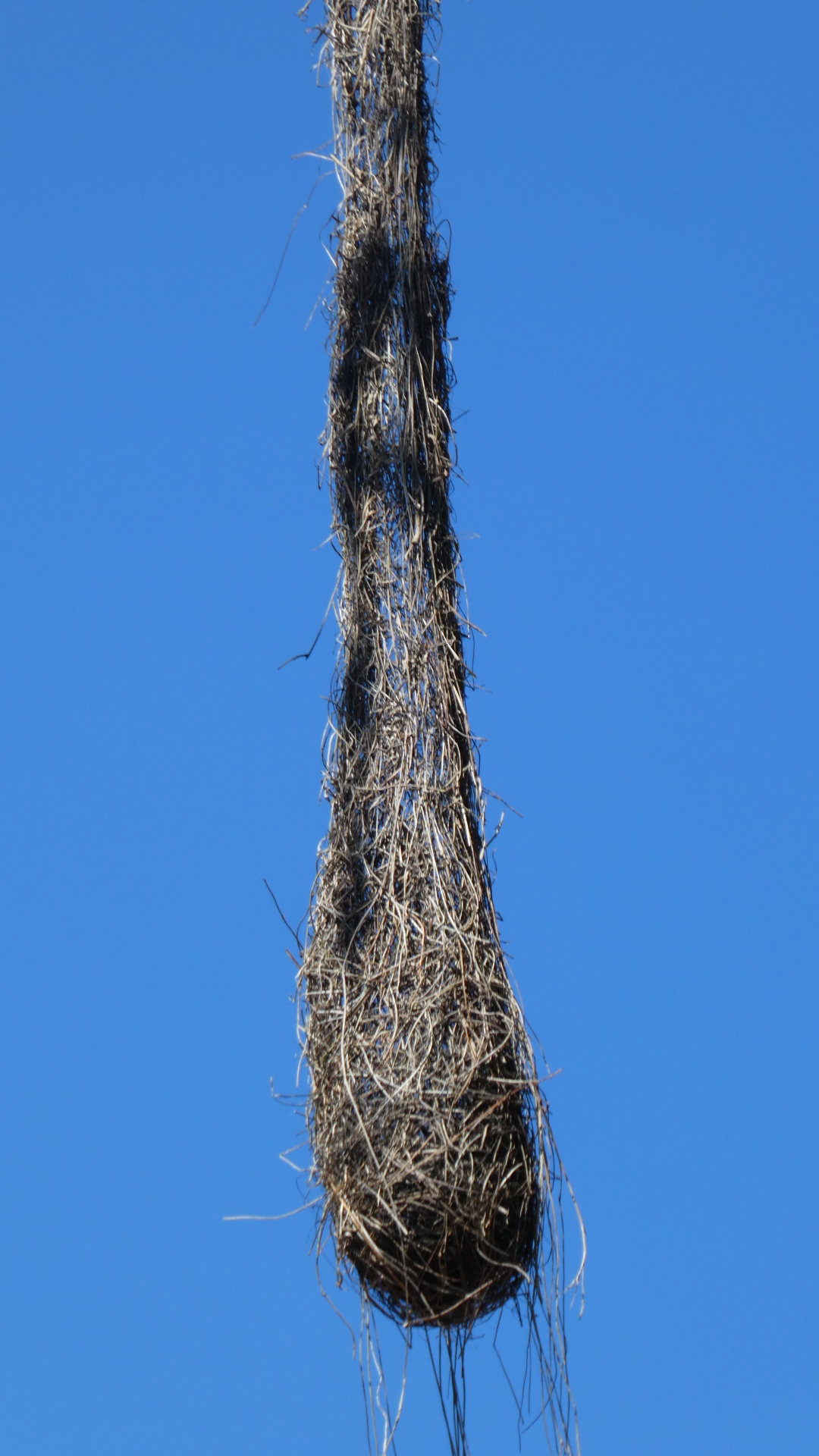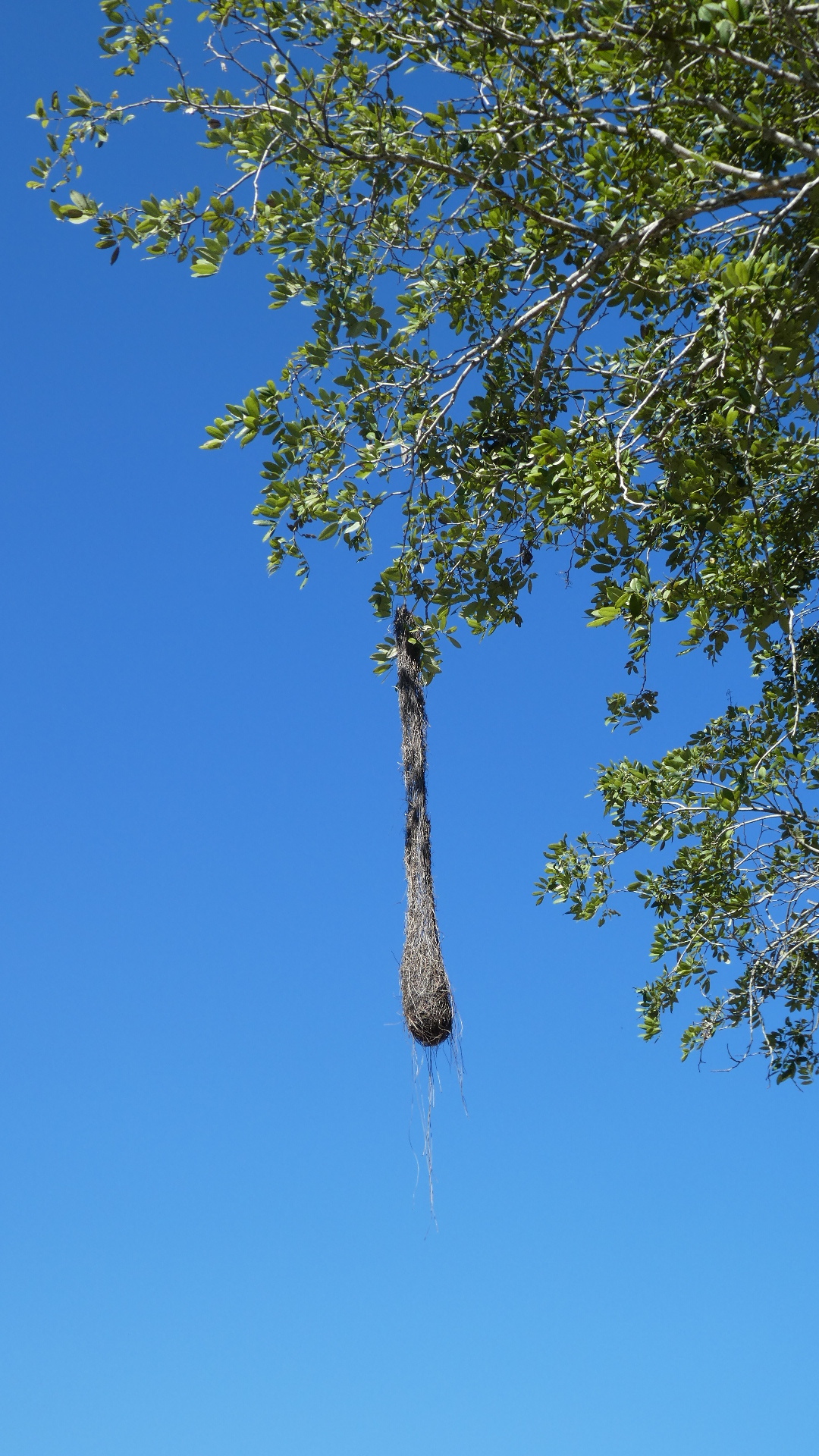 Here also up high is another oriole nest. We have never seen one in actual use. (OK, so both of our gurus, Bill and Scott, feel this is an Oropondula nest. Who are we to argue? Oropondula nest it is.)