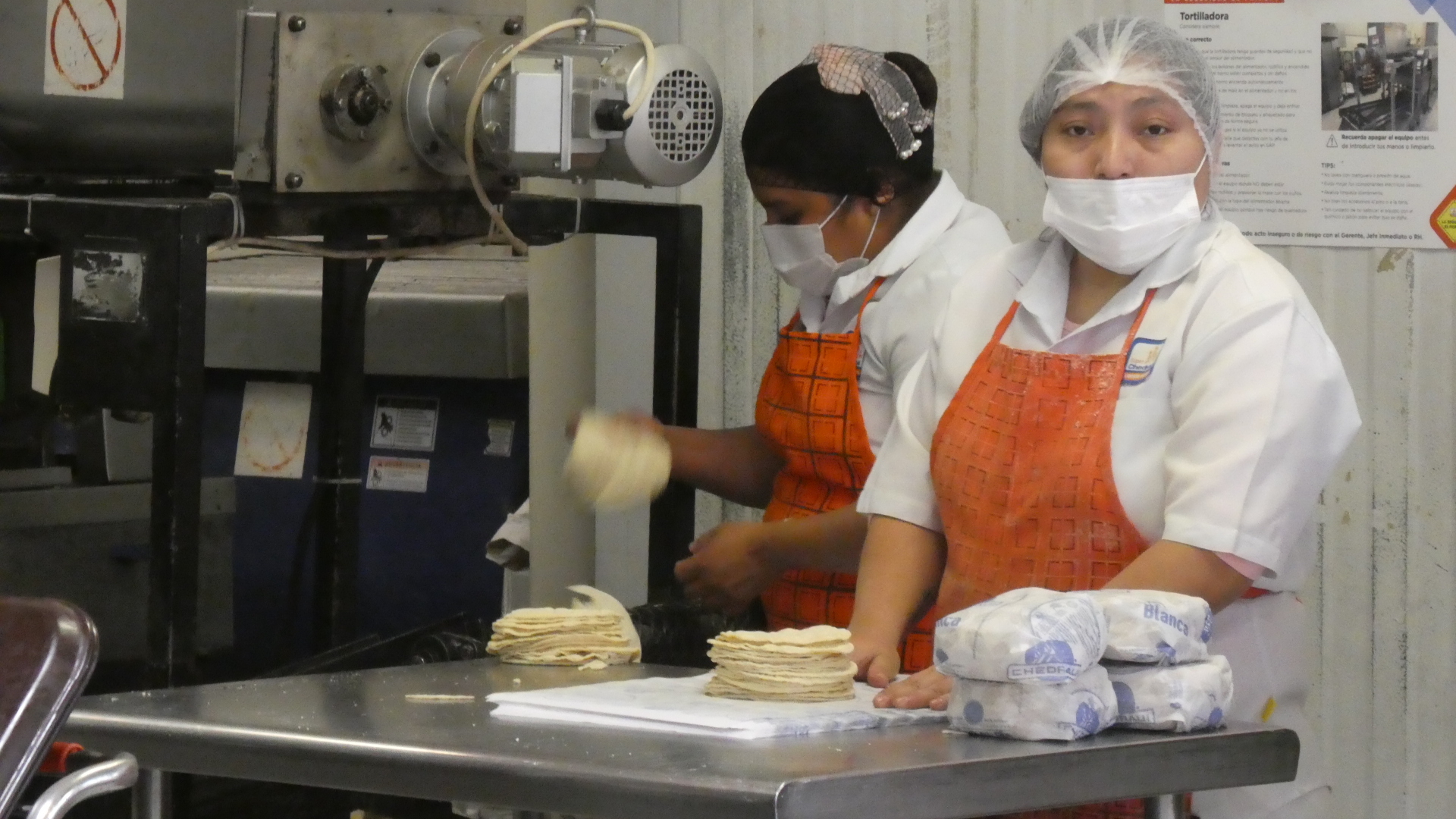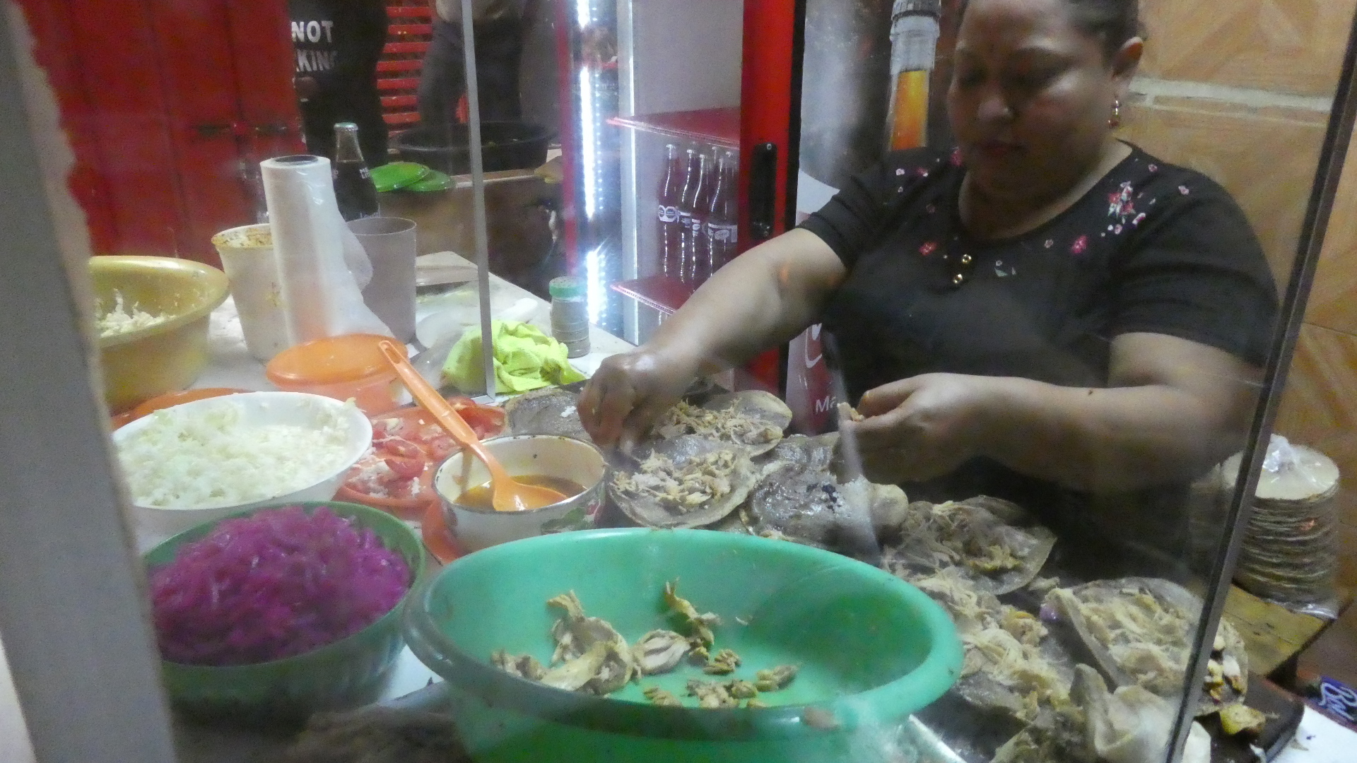 Now the tortillas are laid out, and a process begins that seemed to take a long time, yet the ladies working were a blur of continuous motion. It's hand shred the chicken - shred shred shred - and drop the product on the tortillas, Then its sprinkle pink pickled onions - sprinkle sprinkle sprinkle. Add shredded cabbage, add tomatoes, cut avocado, sprinkle magic seasoning, pour on some more liquid beans. And in the case of my "take out" order, put spicy shredded cabbage into a baggie and tie it, and put more bean sauce into a baggie, and tie it. Then wrap the whole production in brown paper. I was really fascinated to watch this all happen, but poor Dodie was out in the street. She was patient though, because she knew I was having fun inside.