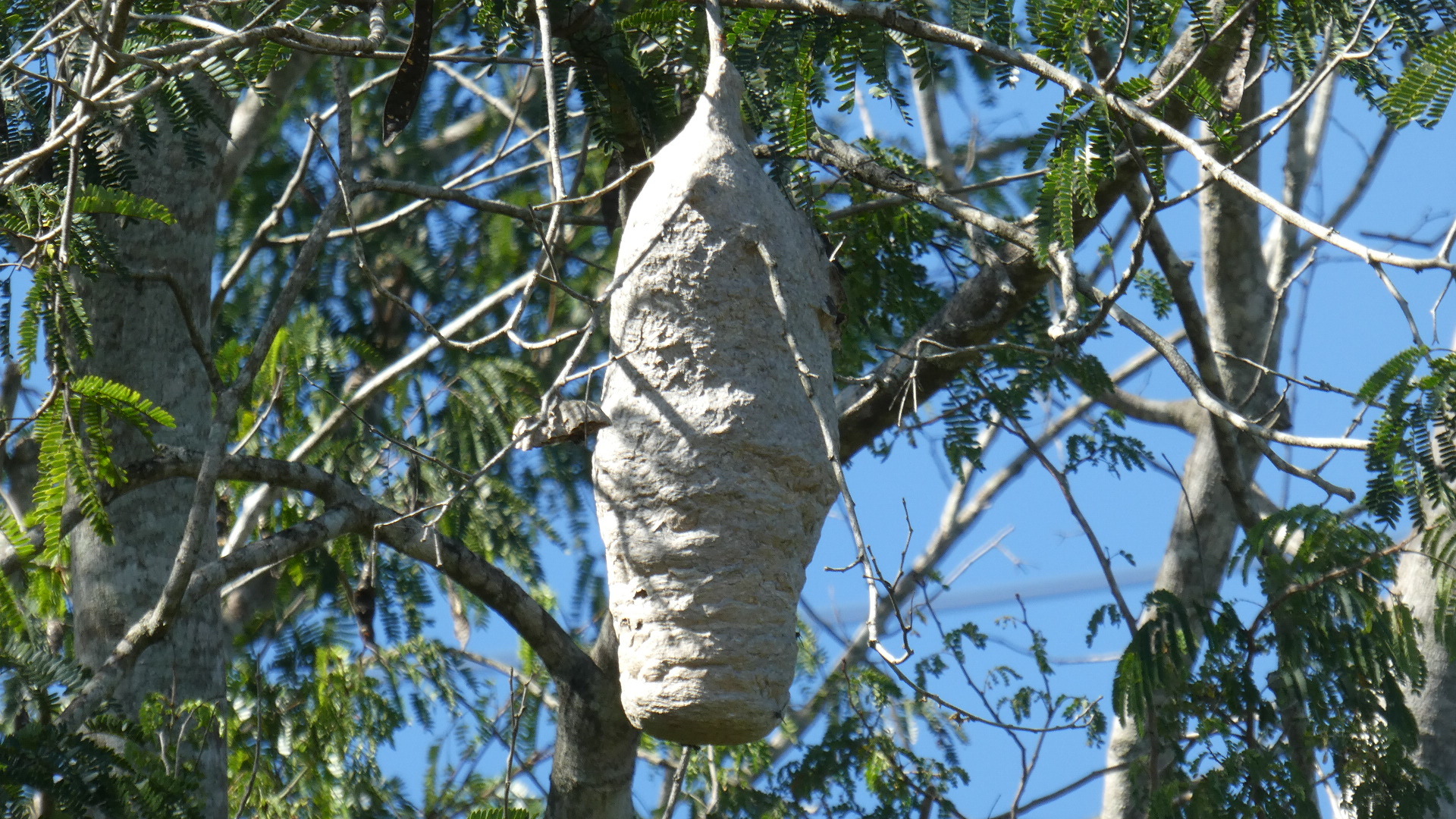 High in a tree, Dodie spots another wasp nest. It is less dramatic than the one we saw the other day (Day 17).