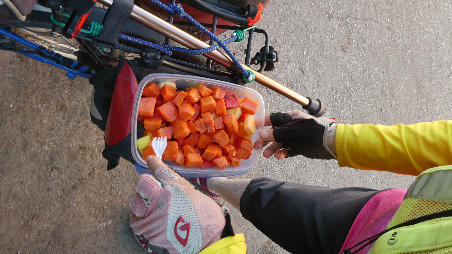 The very considerate Dodie then watched over the bikes in order to send me into the main market for a look. I wanted to find prepared fruits, but came back empty handed. So we had to send in our keen eyed spotter. Success!