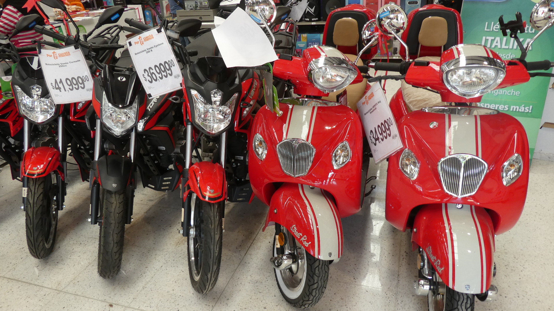 Dodie correctly figured that I would enjoy a spin around the Chedraui, and that was quite right. Like Soriana, this chain sells the likes of motos and washing machines, as well as groceries. My eye immediately went to a pair of bright red scooters. If I had to have something on two wheels with gas, I would like one of these! I must have good taste because their price was about double that of other motos on the floor, though there were some at higher prices again. At about 40,000 pesos ($3200) they are not exactly giving these things away. However, you could also buy a moto here at the grocery for 16,000 pesos. For comparison, a Vespa scooter in Canada is about $5000 (62,000 pesos).