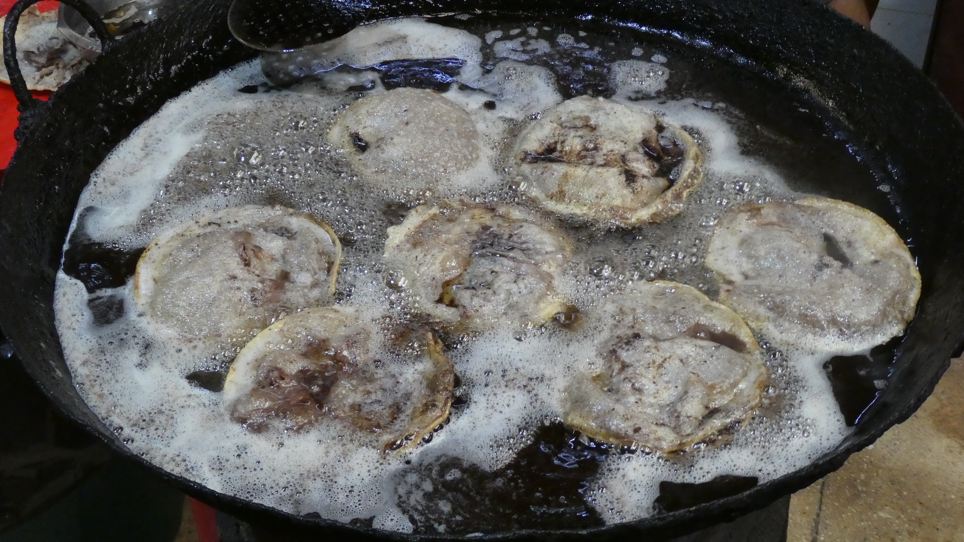 The next part in the process was to open the puffed up tortillas and pour some very liquid refried bean paste inside.