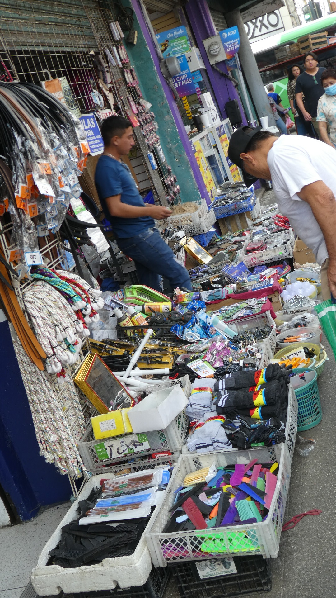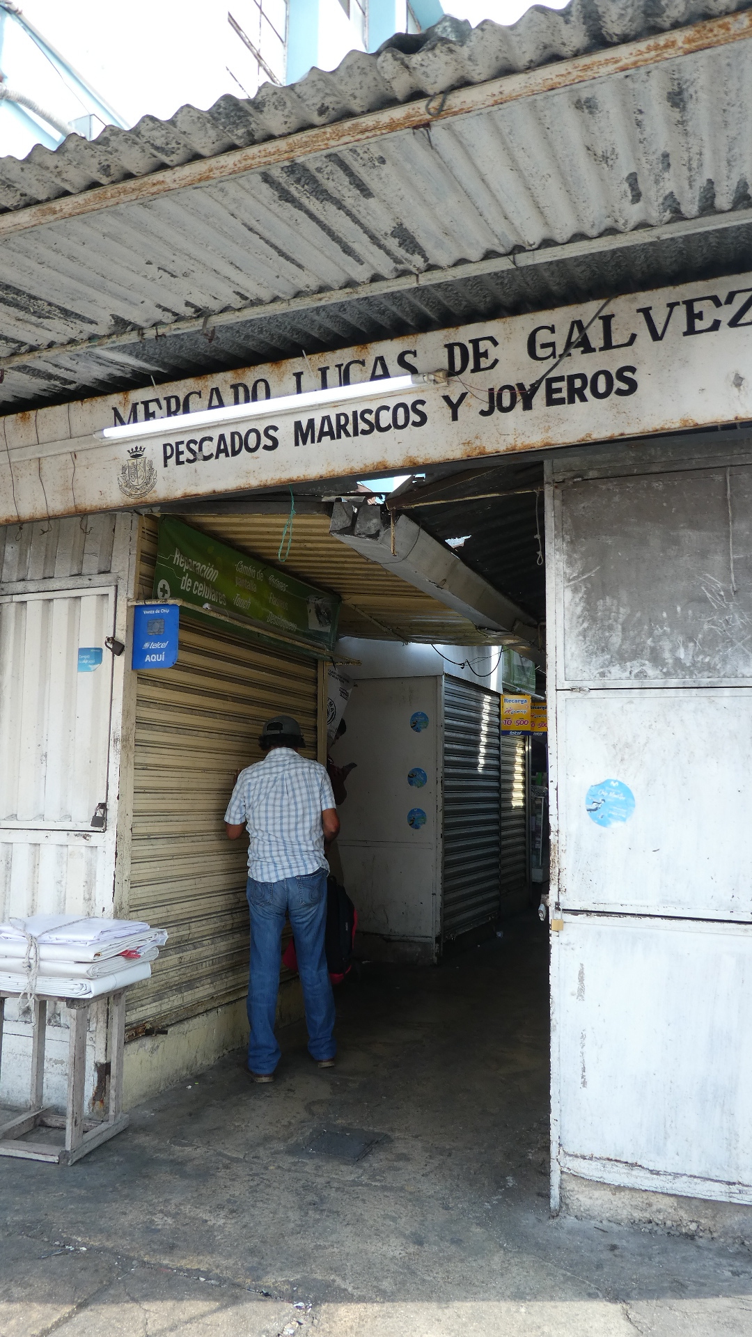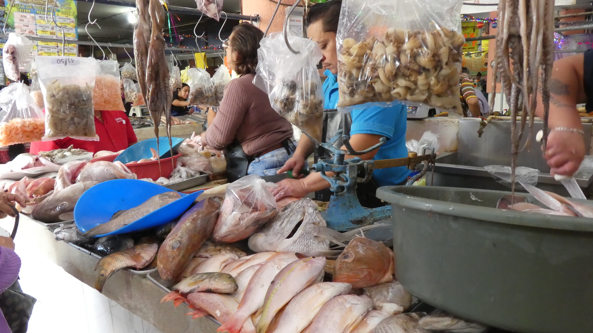 Suitably refreshed, we now charged into the more exciting (or excited) part of downtown. There were two adjacent markets mentioned by Google and others, and we walked to where they were supposed to be. We didn't find, at first, any large covered market building or outdoor arrangement of stalls. Rather, the city blocks abounded in little stores or street stalls. To boot, it was a long time before we saw so much as a banana or a fish. So we walked around and around, looking. Eventually we did find fish, and fruits, and vegetables, but right now don't ask me exactly where, or how. It was all in among warrens and alleys and buildings, but it's not like there was a sign or anything!