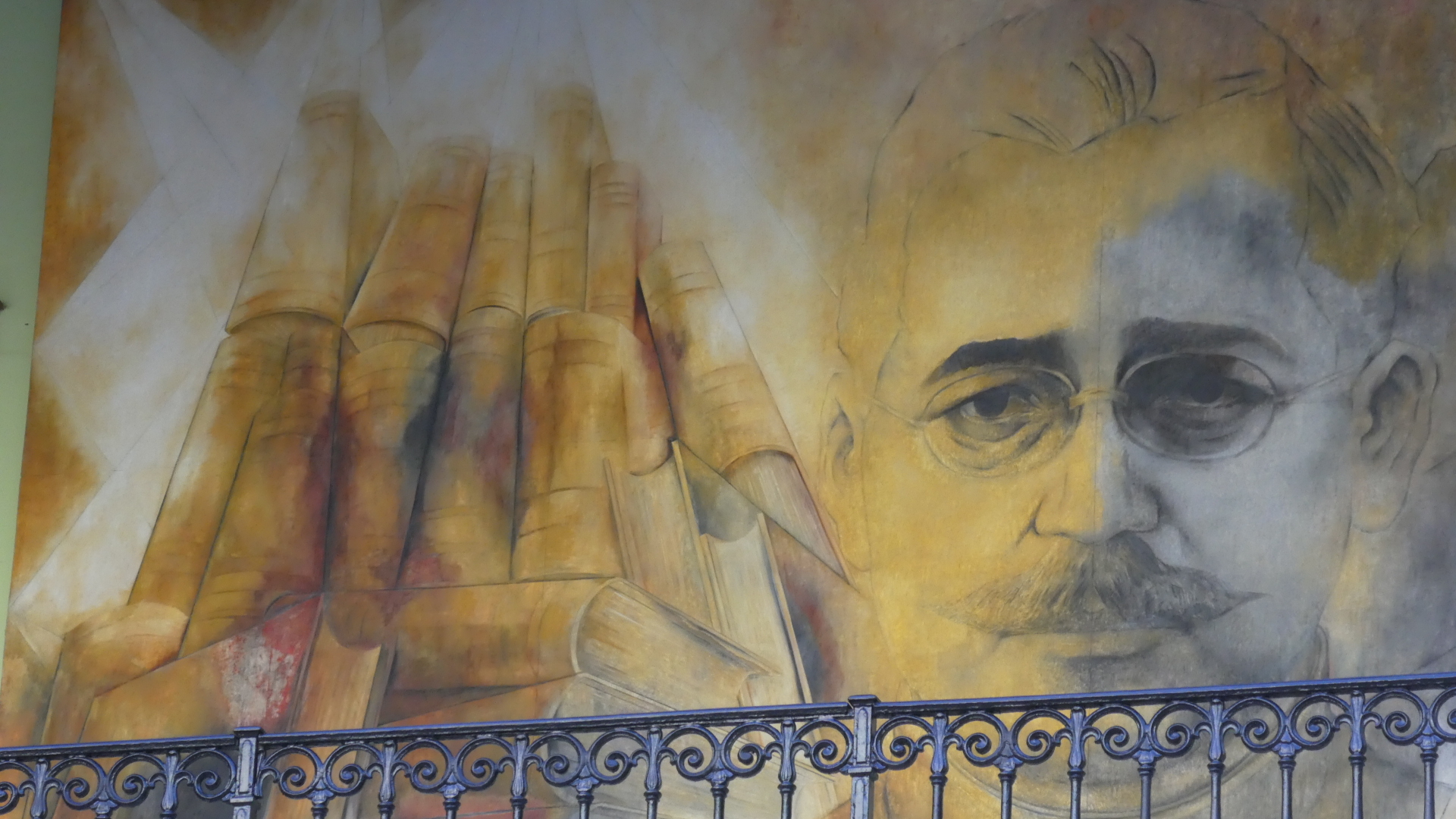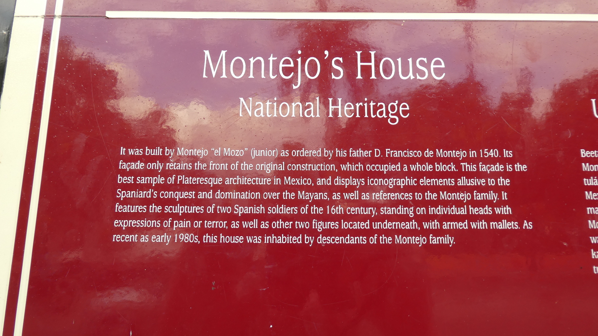 We stopped by the Montejo house on the way back. As you can read below, it originates from 1540. Famously the front facade shows Spaniards standing on natives. The house was kept in the family through a longline of inheritances, but eventually house and lands got sold off. Eventually it was purchased and restored by Banamex, which established a bank branch in it, but also preserved rooms as a museum. They periodically host art exhibitions here as well.