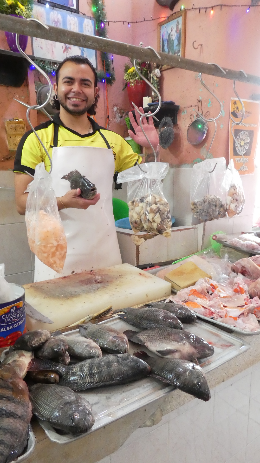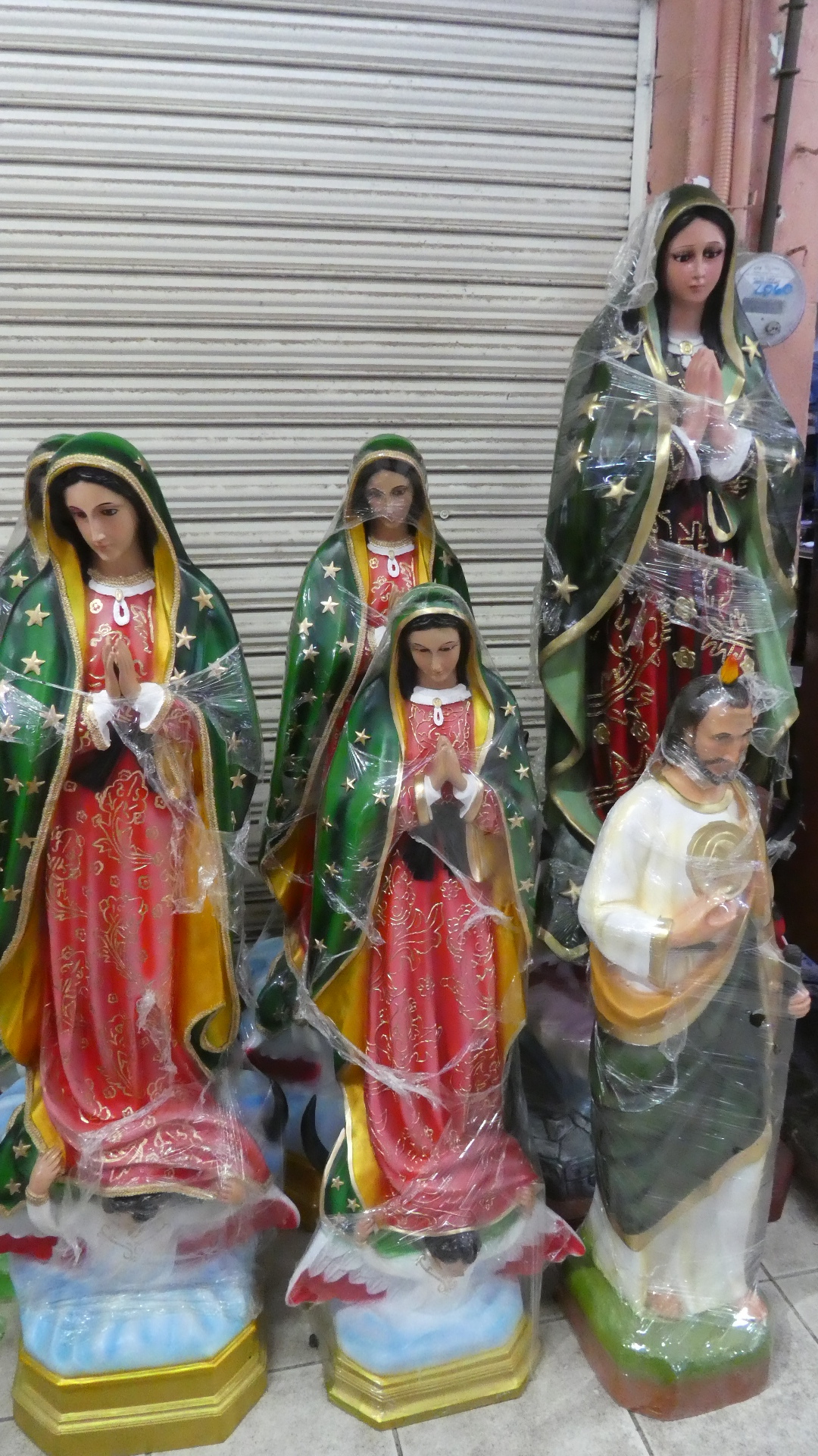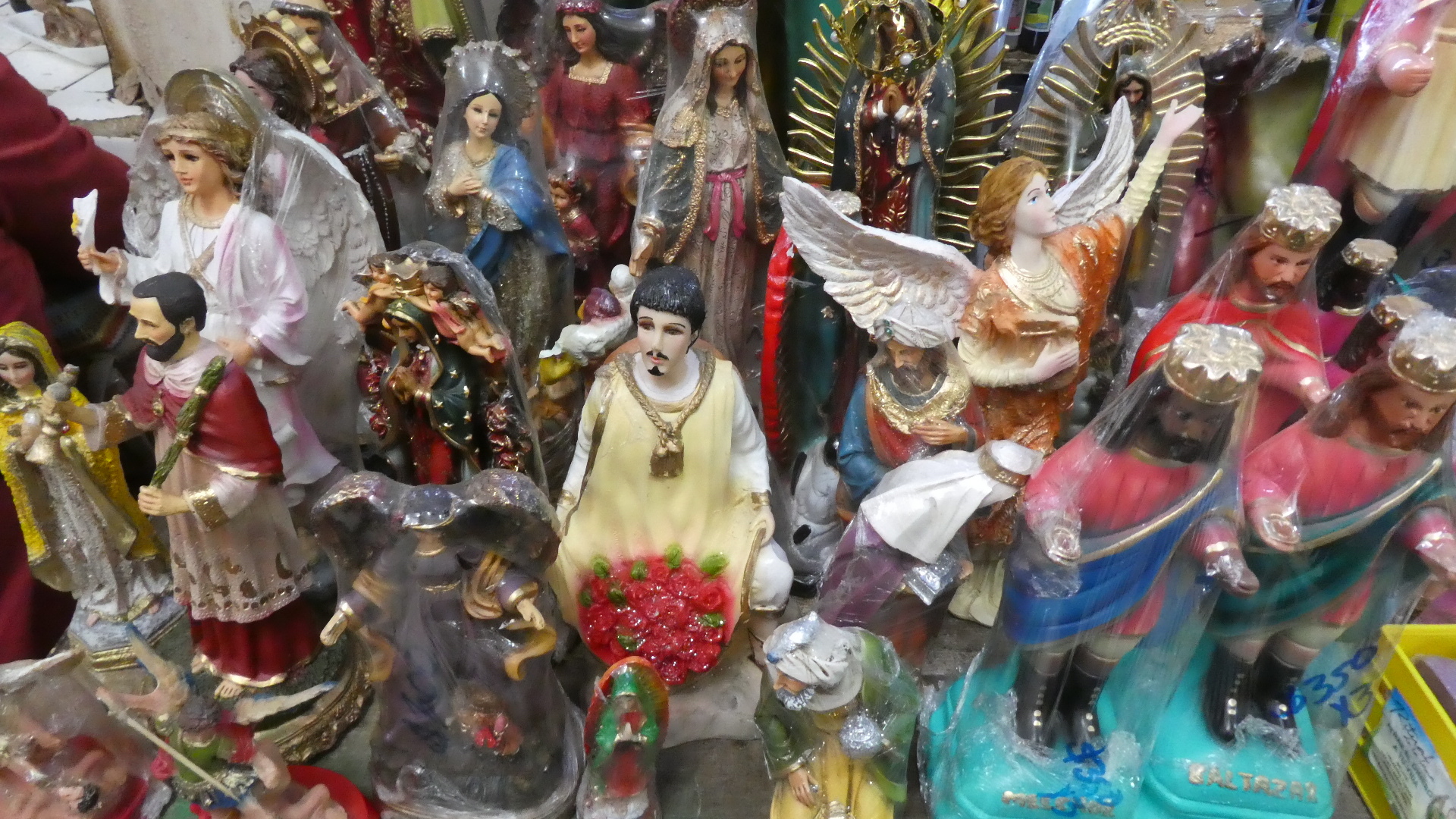 The winner for popularity here is the Virgin of Guadalupe. I had to wait a bit for my photo, for some devotees to clear out from in front. Significantly, you can buy her tee shirts in the market, and as we'll see later, full sized heavy statues, that if you are so inclined you could strap to your back and ride around on your bike.