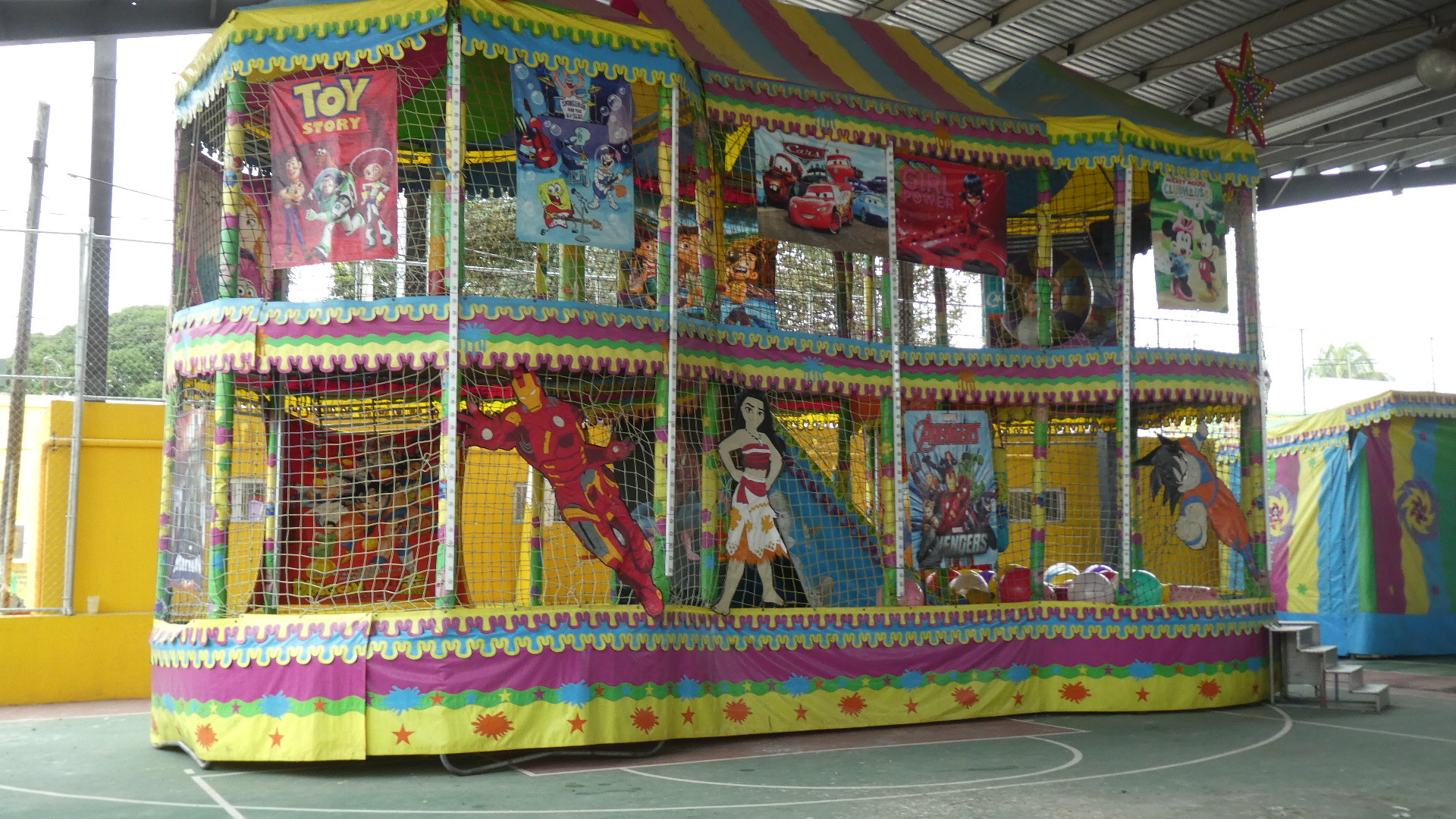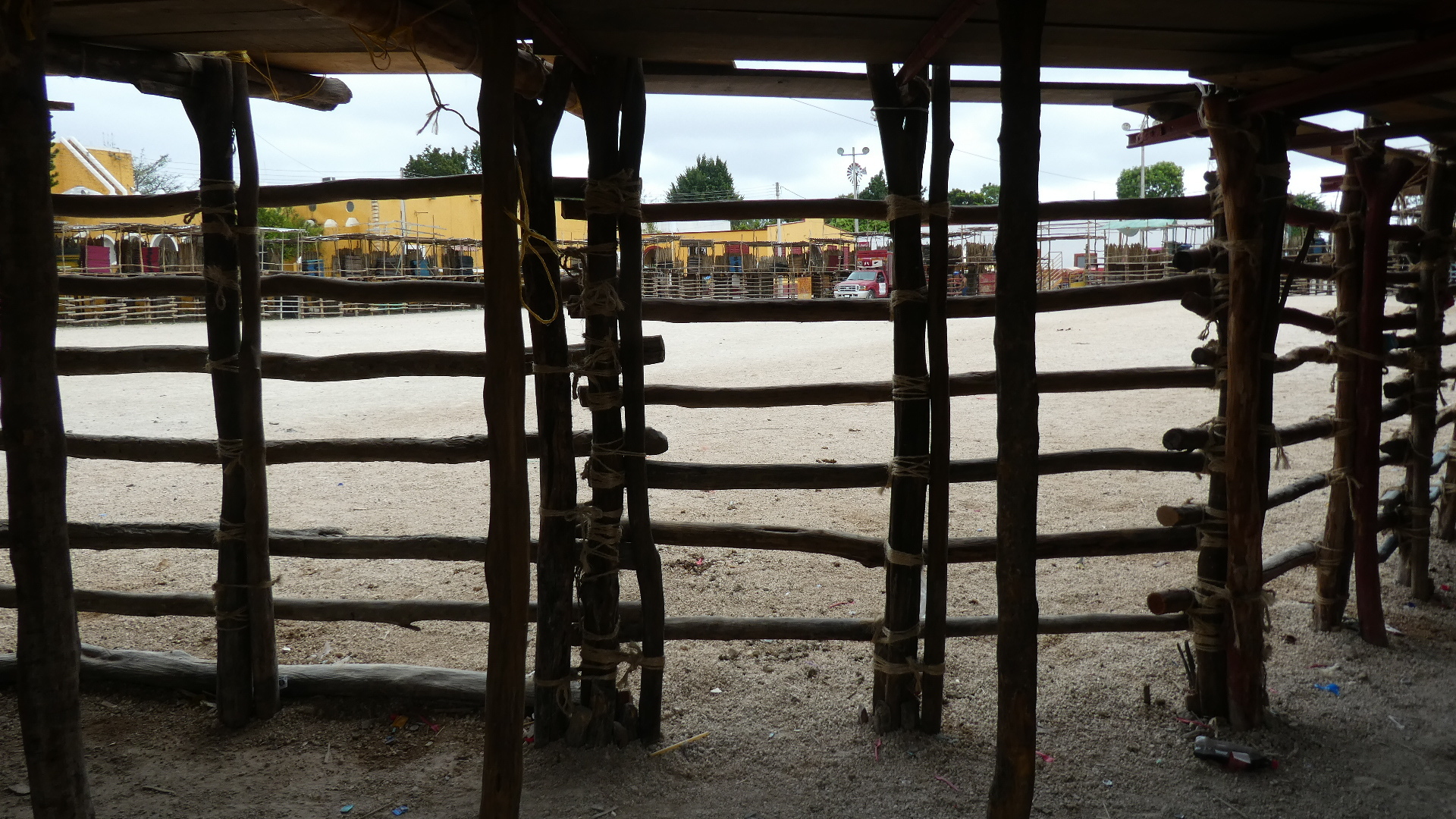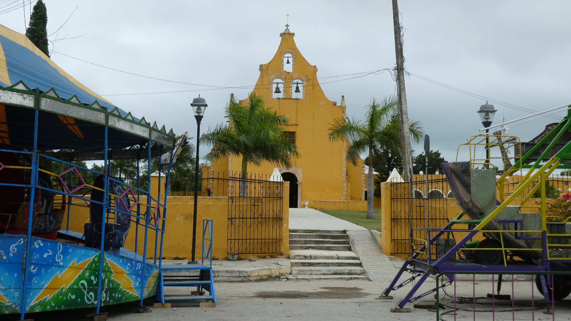 Cacalchen is a small town, with a small church. But the central area had something special going on, not only with circus tent type amusements, but also with preparations for a large rodeo. The main road to Izamal was almost completely blocked with trucks unloading heavy electrical cables, and with a large rodeo ring, right in the middle of the road and everything.