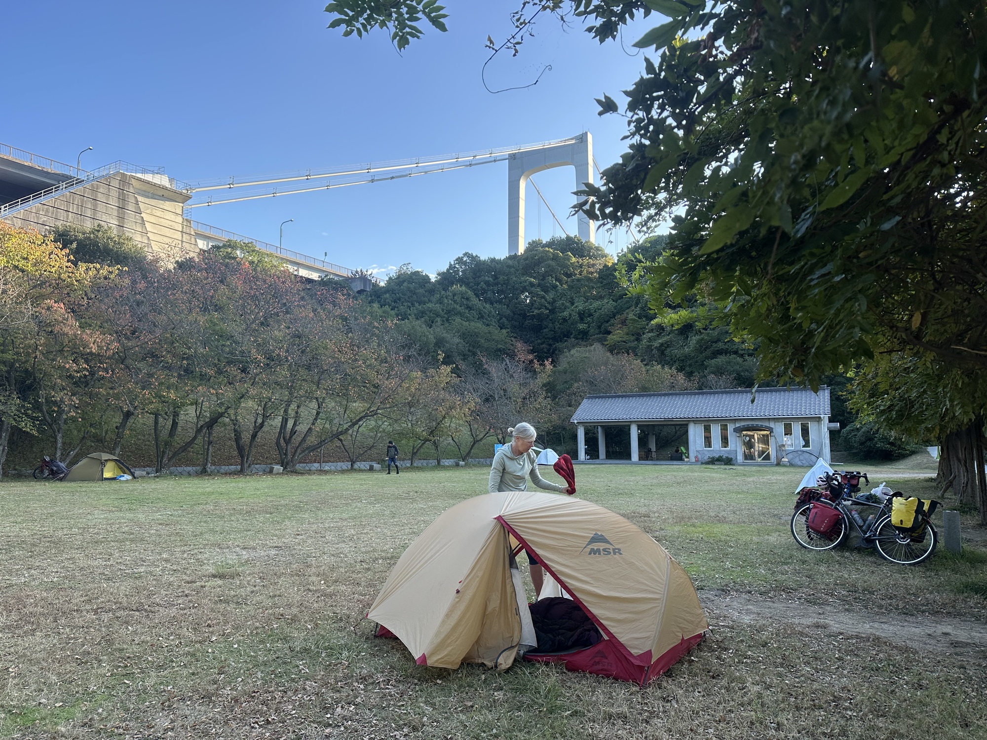 Then it was back on the bikes for the final kilometres to our planned destination. We’d heard about a campground only accessible from the bike lane of the second bridge, and so we followed a path branching off midway through the second bridge. It was only signed “Michikajima Island” — no mention of camping, but when we’d swooped down a few switchbacks for get to sea level from the height of the bridge, there it was, with a few campers already setting up tents. We joined them, putting the tent up in time to enjoy the last warmth of the setting sun, overlooking the ocean. The days are getting very short, so camping means early dinners and bedtime.