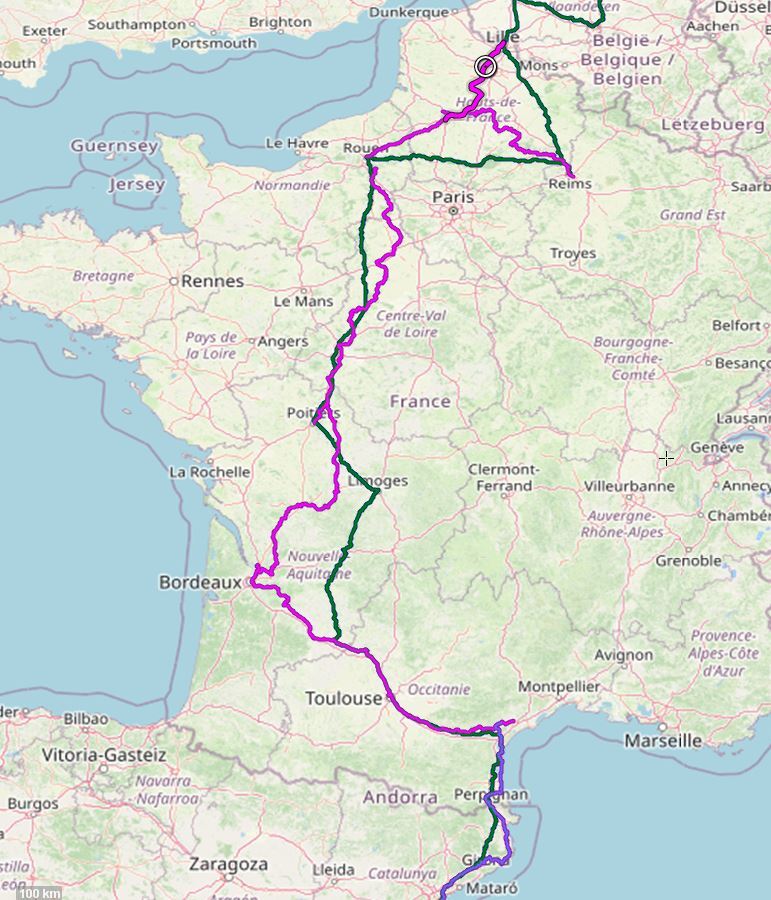 Despite the Santa Comba result, we are going to start out with the Google route. If we become unhappy at any point, then we'll call on our friends RWGPS and Komoot to get us out of trouble. We also have the tracks of several bikeways loosely on our way - like EV 3, EV 8, Veloroute du Nord, etc. We may hop on one or more of those at the drop of a hat.