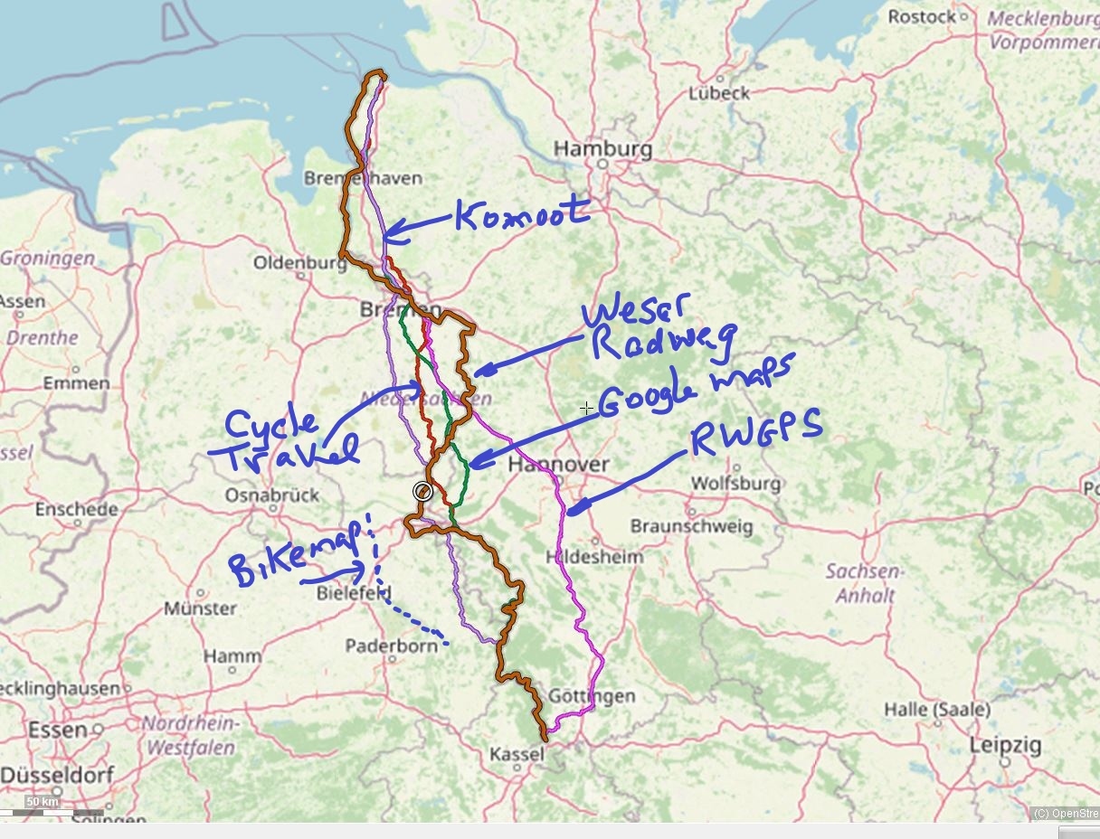We were also not about to work with five sources second guessing each bit of our Google Maps route. So we cooked up a fairly simple test for them all. As it happens, its not even on our current route, but its close. It's the approximately 365 km run from Cuxhaven - on the North Sea near Hamburg, down to Hann Munden, loosely on the way to Frankfurt. This is the path, more or less, of the Weser river, and of course it has a Weser bikeway. The map below shows how each of the sources handled the route. Bikemap.net is not shown in detail, because they charge for the GPS file. The main things we found were: