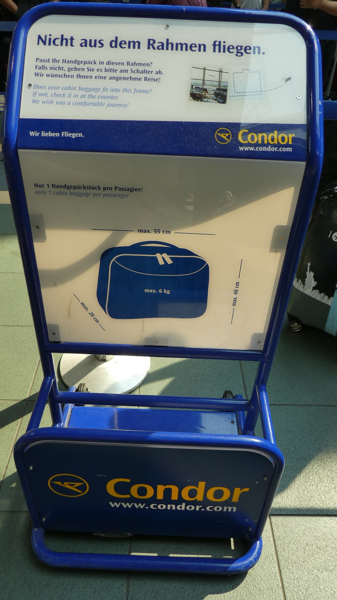 Although we already had our online boarding passes, Dodie surmised that Condor would take the chance to give us grief over the size or weight of our carry-ons. So we lined up for their counter, and sure enough they checked the size and weight, before awarding the coveted carry on approval. One unexpected thing - they said Condor might consider reimbursing our train ticket, since their delay will cause us to miss our train in Frankfurt. We'll see about that.