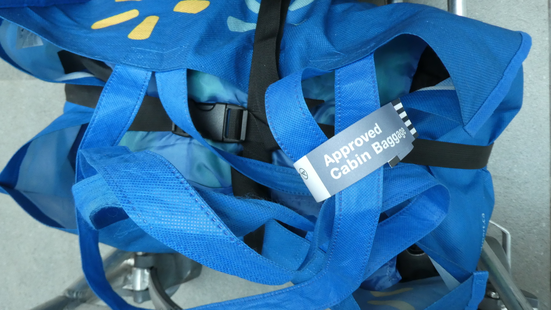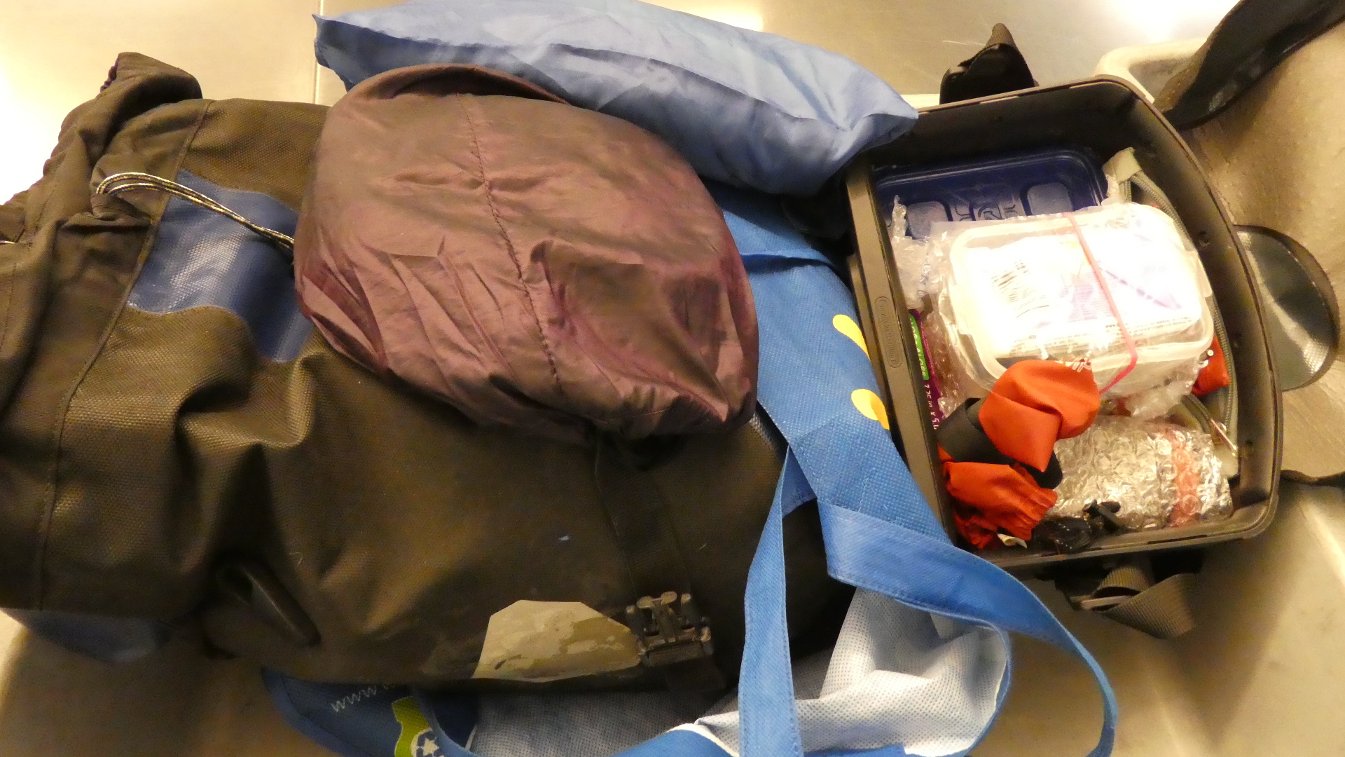 Security was up next. I assured Dodie that without the controversial e-bike batteries, this would be a breeze. Hah! They must have sensed that Dodie had spent hours carefully Tetrising our stuff into the bags, to beat the Condor size limits. So CATSA diverted three of our four bags to rip apart - looking for ...what? The first thing they questioned was a plastic container holding a yellow cloth. Perhaps yellow symbolizes acid for them? Next was two packets of wet wipes. Now wet is like "liquid", so maybe that was their concern. Entirely reasonable to suspect that the Grampies have learned to weaponize wet wipes. Parents with slobbery babies, take note. (We kept the wet wipes). Finally, they found ten individual hand warmers. We have these because with poor circulation in my hands, cold November rains can cause me a lot of pain. But CATSA said we had "too many". Clearly they have never cycled in November! They felt a lot better when we told them ok, half for me, half for Dodie. We kept the hand warmers!