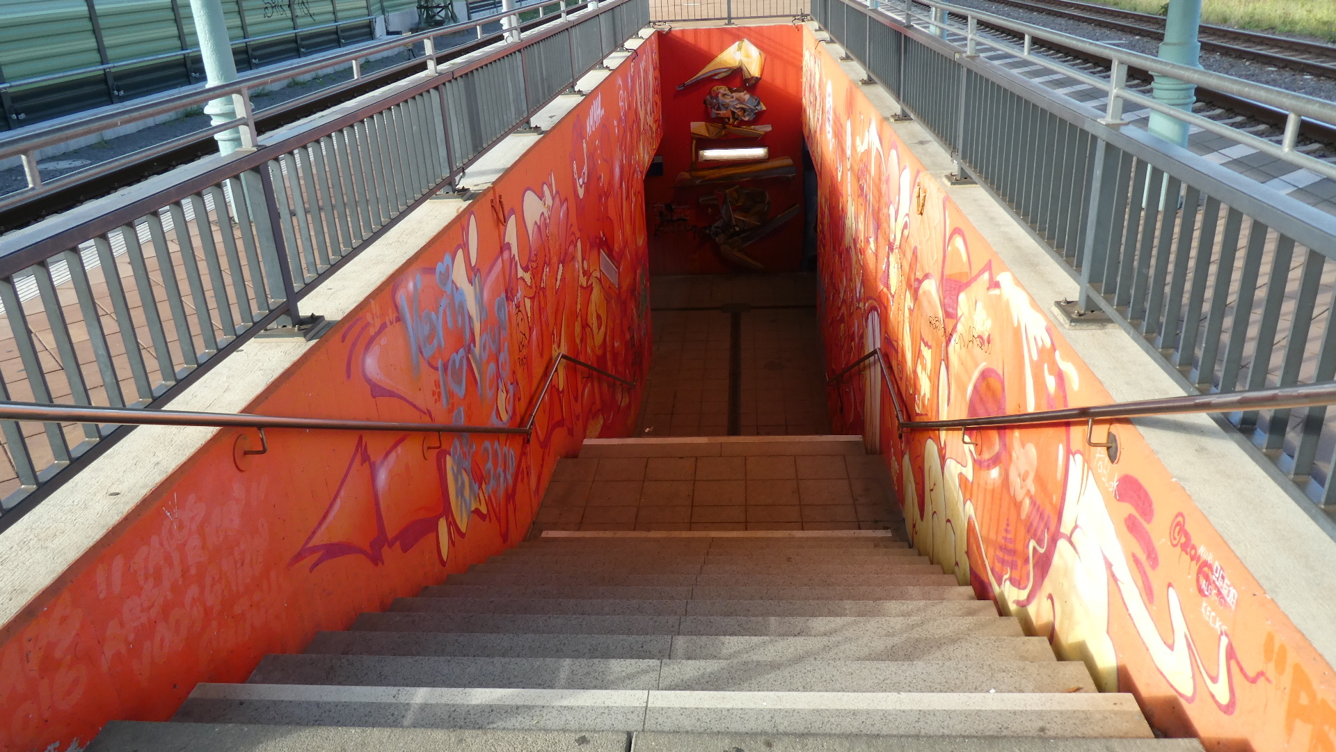As it happened, the train was a basically level entry, but the station featured a steep set of stairs up to the platform.
