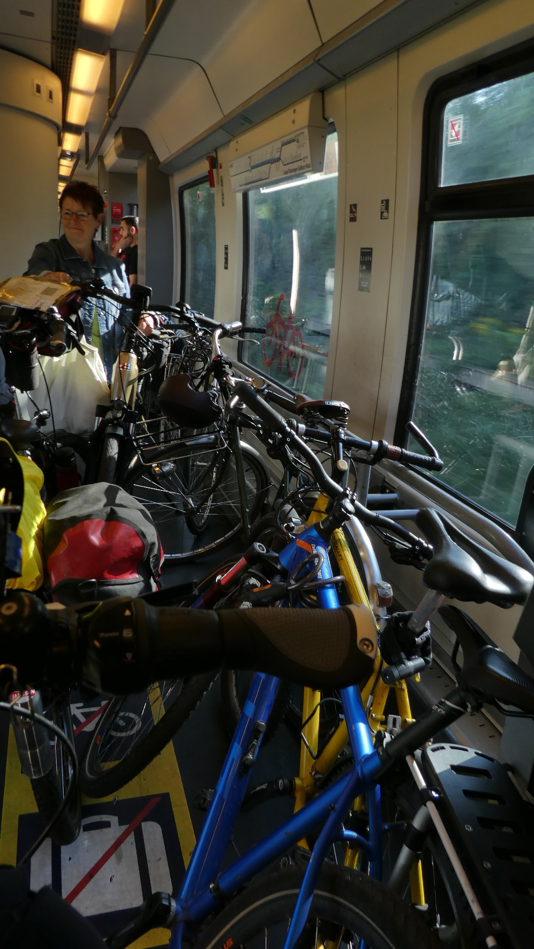 Well fine then, we shifted the other bikes a bit and our bikes a bit and managed to get ours on some hooks. We (and some other passengers) then looked on with relief as the one we were calling "Miss Snippy" soon left the train (I was looking for the black smoke) to continue her career of harassing hapless tourists elsewhere. I was ready before this to go and discuss with her her likely future non-career with DB, but Dodie forbade any further squabbling.
