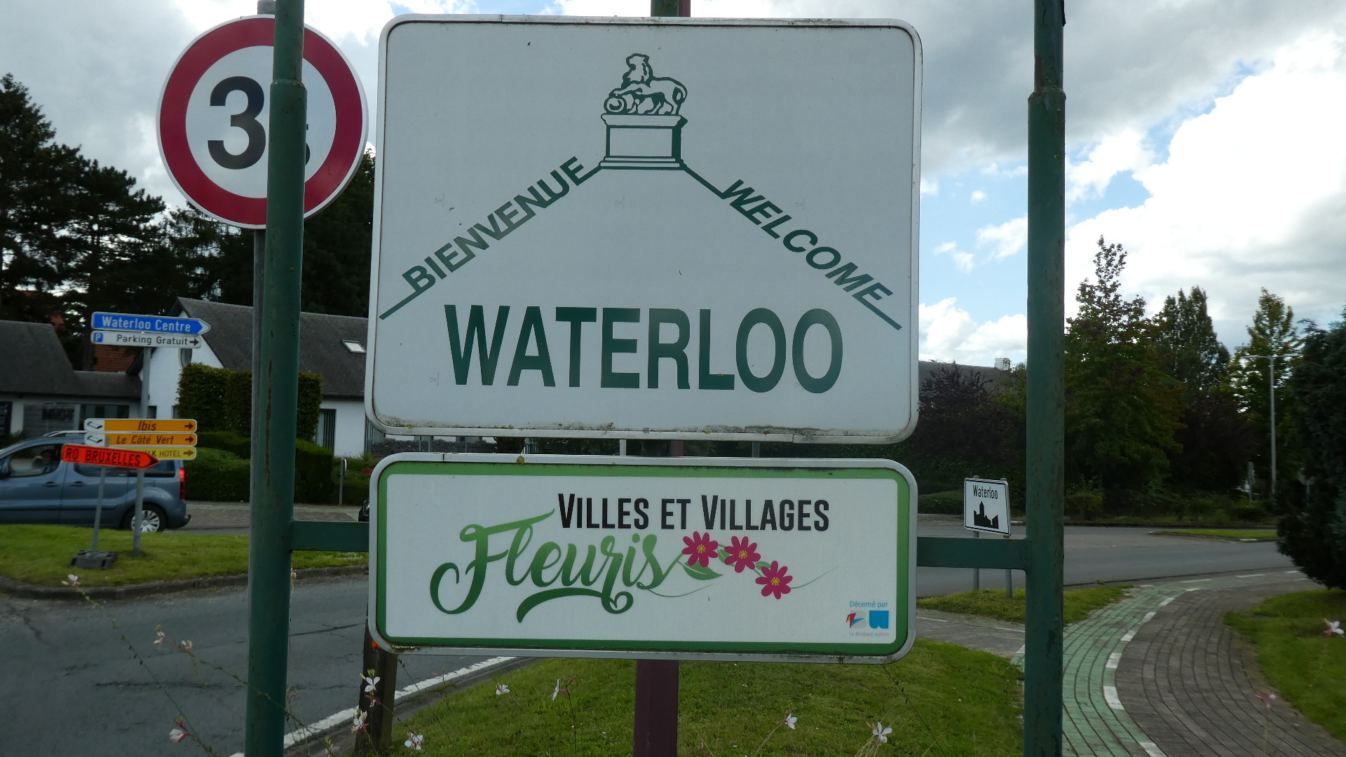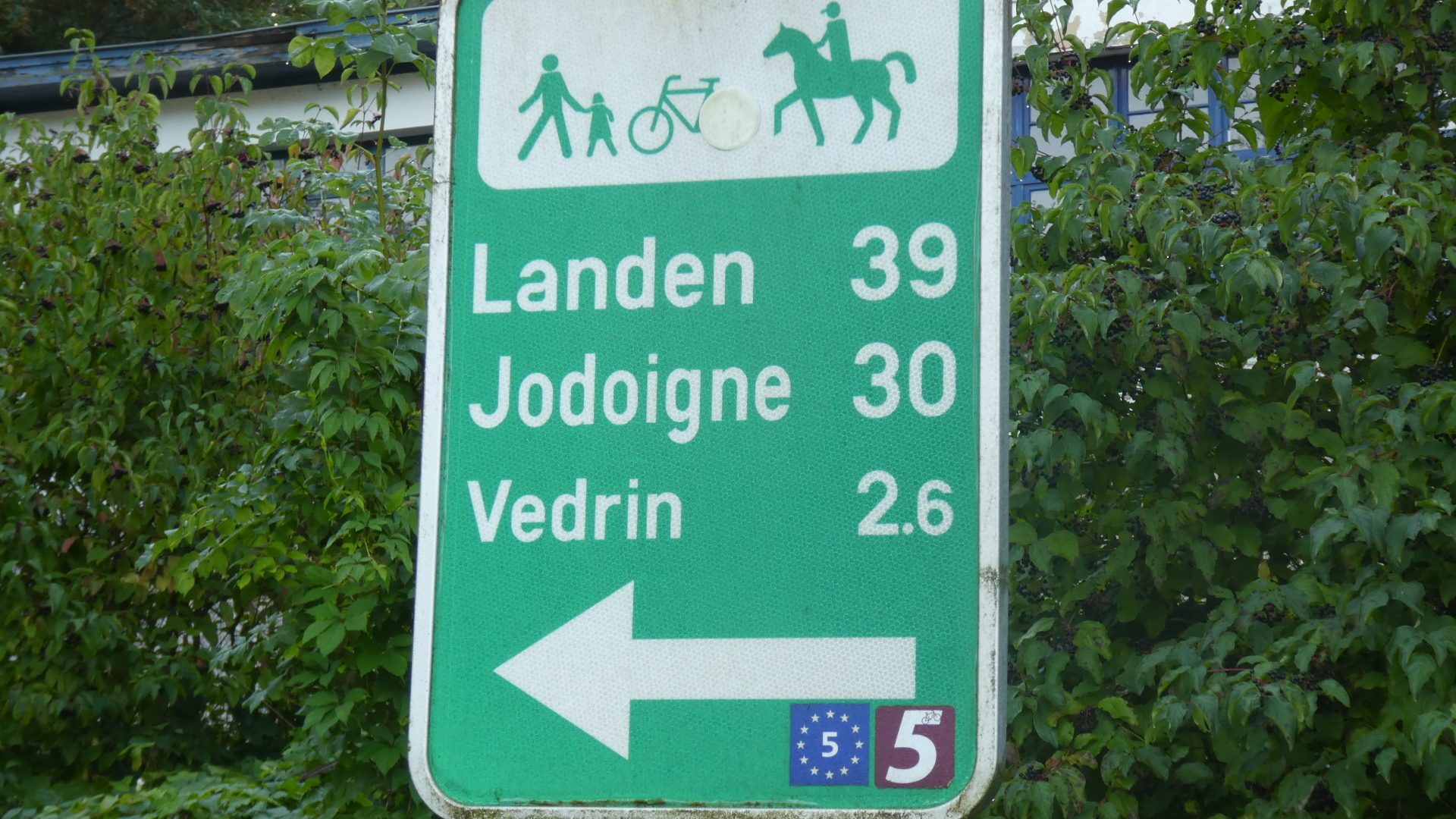 Since we are generally very aware of Eurovelo routes and take into account where they go when planning every European tour, it was remarkable that we landed unknowingly on EV 3 from Aachen to Namur. Now today coming out of Namur we found ourselves on EV 5! EV 3 is the Pilgrim Route, and EV 5 is the "Francigena". EV 5 runs 3900 km, from Canterbury to Rome. The important part for us is that in doing this it runs between Namur and Brussels! In practice we did not stick with it all the way, because we detoured for a look at Waterloo, but it was EV 5 most of the way.