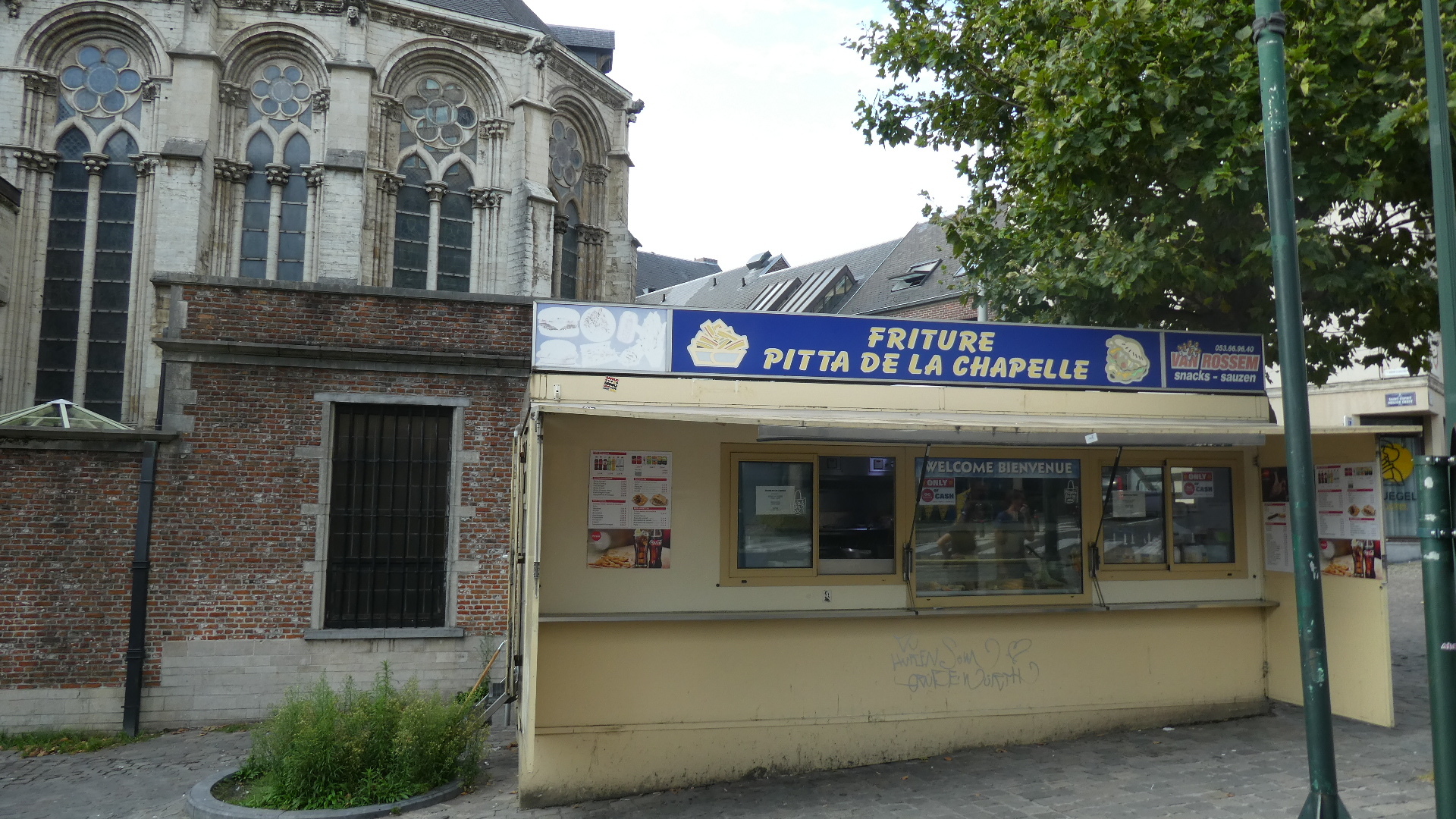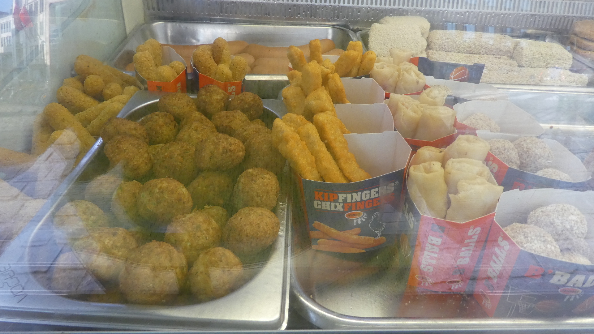 We usually don't choose youth hostels, or youth hostiles as Dodie's sister has called them, but the one in Brussels (Hostel Bruegel) was fine. One we were settled, I went out to research that big topic - Belgian Fries. Behind a church was just the thing - a dedicated, street food oriented "friterie". Interestingly is was not only potatoes being fried there, but also a selection of what we know to be common in Netherlands - various forms of croquettes. I