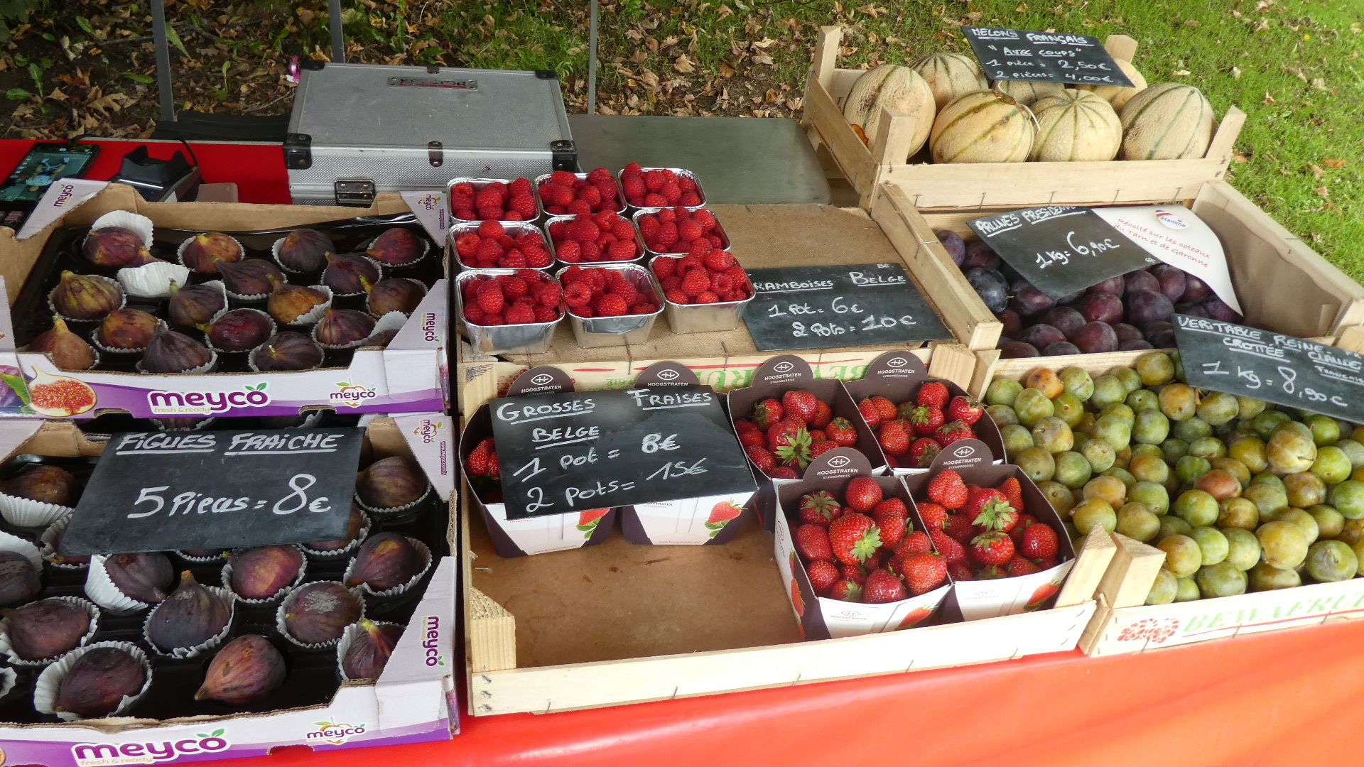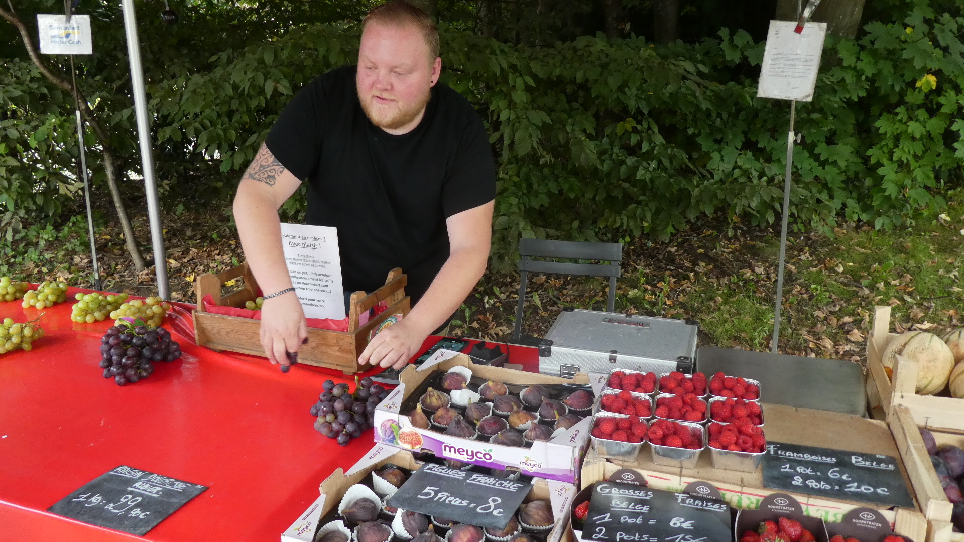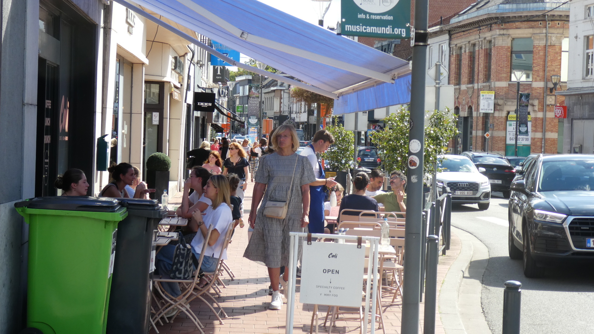 It was quite late by the time we reached Waterloo. Dodie would really have liked to visit the battlefield and also the museum. But the first thing we came to was a fruit seller. Aside from getting some great local grapes and figs from him we learned that we had already missed the turn for the battlefield. There really was not time to turn back. We proceeded into Waterloo and were very surprised to find a fancy town, with immaculate homes on the outskirts, large shopping malls, and a long street filled with boutiques and cafes. Our bike lane petered out and we were crowded off the roadway by a gaggle of Jaguars and Porsches. On the sidewalks we encountered crowds of people, and could just barely make any forward progress. This all but stopped at one point when incredibly a restaurant had filled all but two foot passage on the sidewalk with its tables.