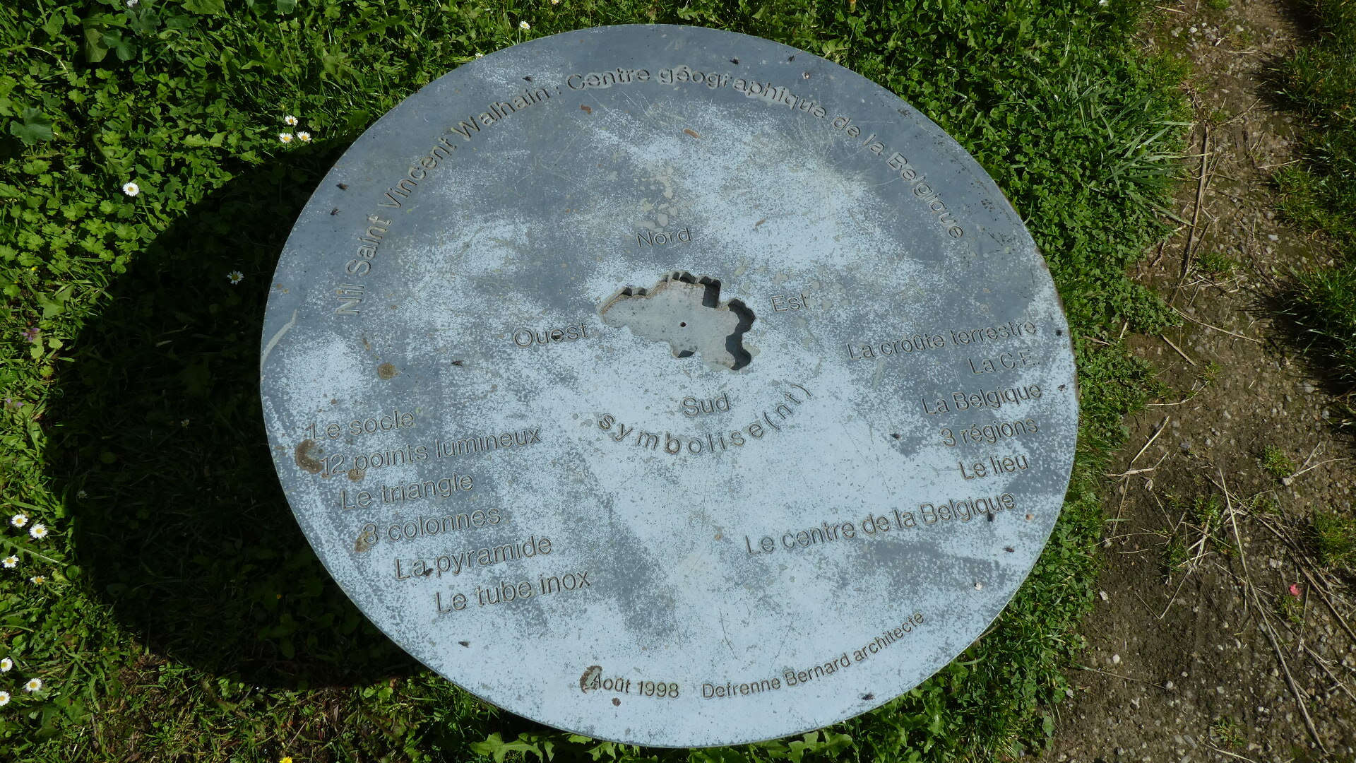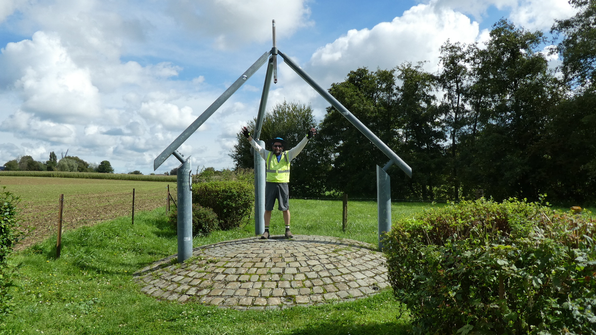 An interesting interlude came when we arrived at the "geographic centre" of Belgium, along the river Nil. There is a marker there, which took us a few minutes to find, In the interim I had had a "nature break", so this missed being in the exact centre. As we cycled away from the centre, there emerged a one sided conversation which sad to say is not infrequent between us. The gist would be: "Say, I wonder how you actually determine the centre of an irregular shape" "I don't care" "You would want it to be the sort of centre such that the shape would spin without vibration" "I don't care" "Maybe you could find it with a compass and the smallest circle that would surround all of the shape" "I don't care". We decided to defer this until the Internet could join in. But now that I have checked several sites, I am just confused. It seems we need to suspend a corner of Belgium from a string and ... OK, I don't care!