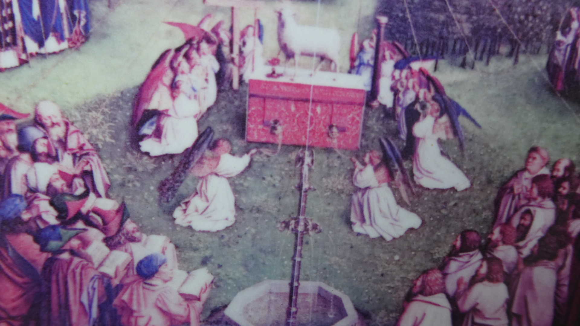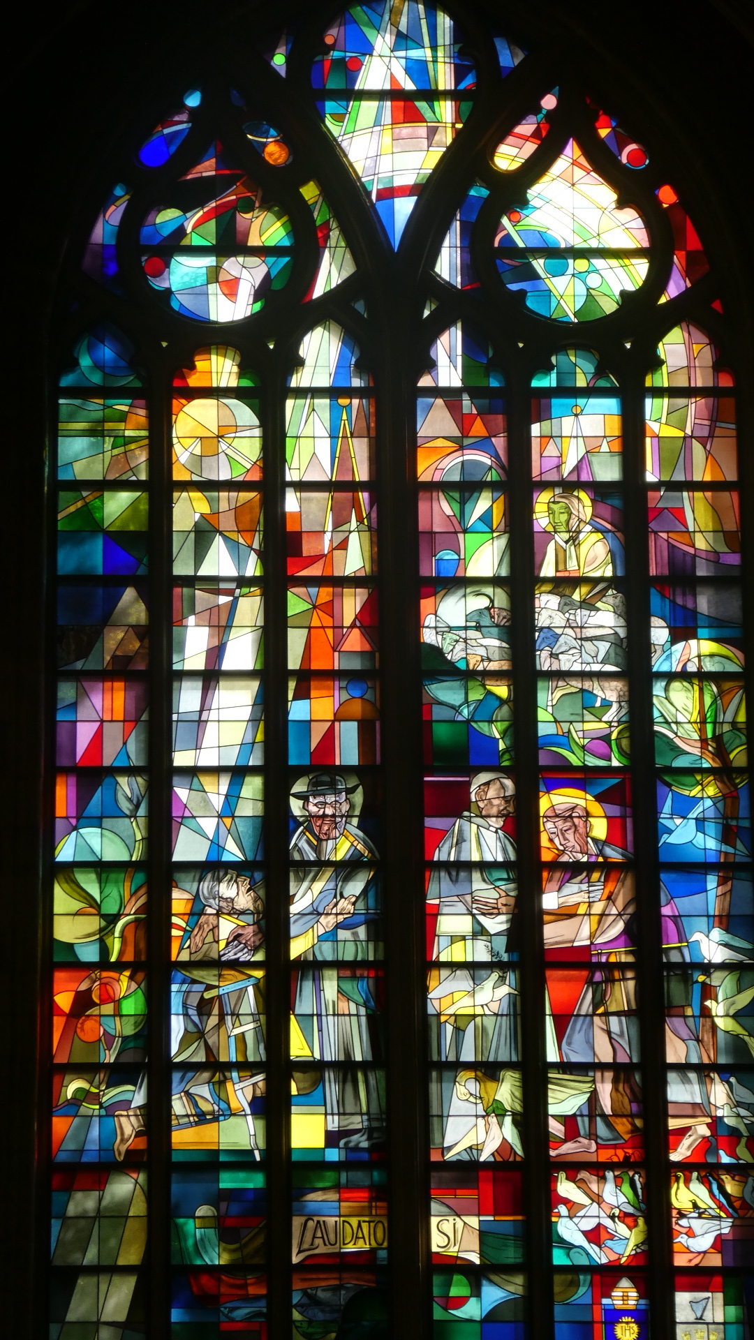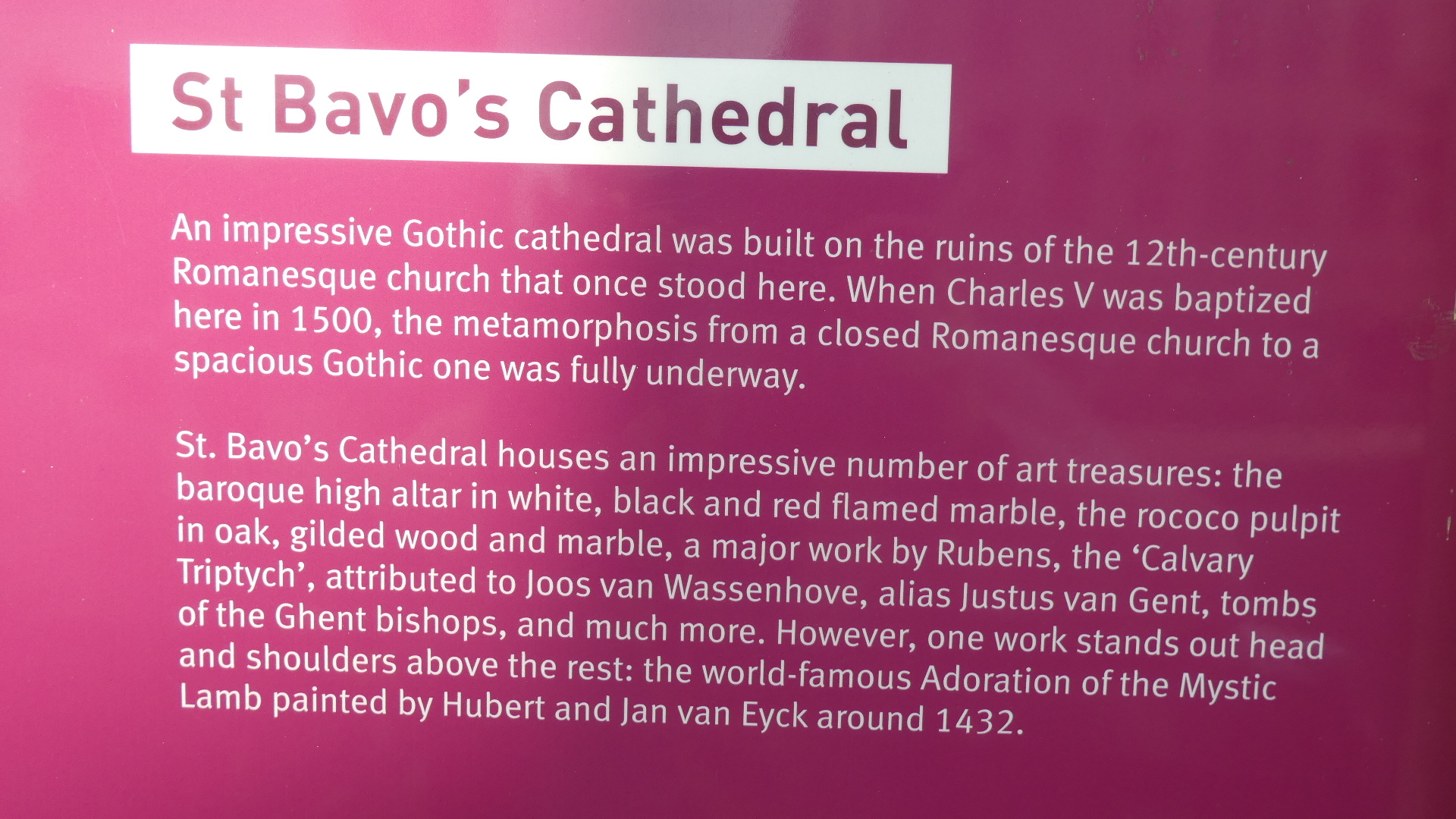 At the end of the street we spied what turned out to be St. Bavo's cathedral. Just before this, Dodie had passed over a one inch irregularity in the road, and it almost threw her bike. A heart stopper to watch from behind. But now, looking along to the cathedral, I said "I'll stop and snap a shot of it down along the street". So I stopped and put my foot down. But an irregularity in the street turned my ankle, and just like that bike and I were sprawled in the street! My later model Ortlieb handlebar bag with the magnetic closure is useless in such cases, and all my stuff was spread into the roadway. Passers by helped pick me, and the stuff, and the bike all up. No harm done! Later, walking out of the cathedral, I almost went flying again. I put it to Dodie that Europe is too bumpy, but I think she correctly concluded that at this time of day we are too tired.