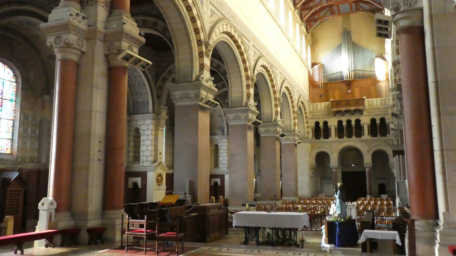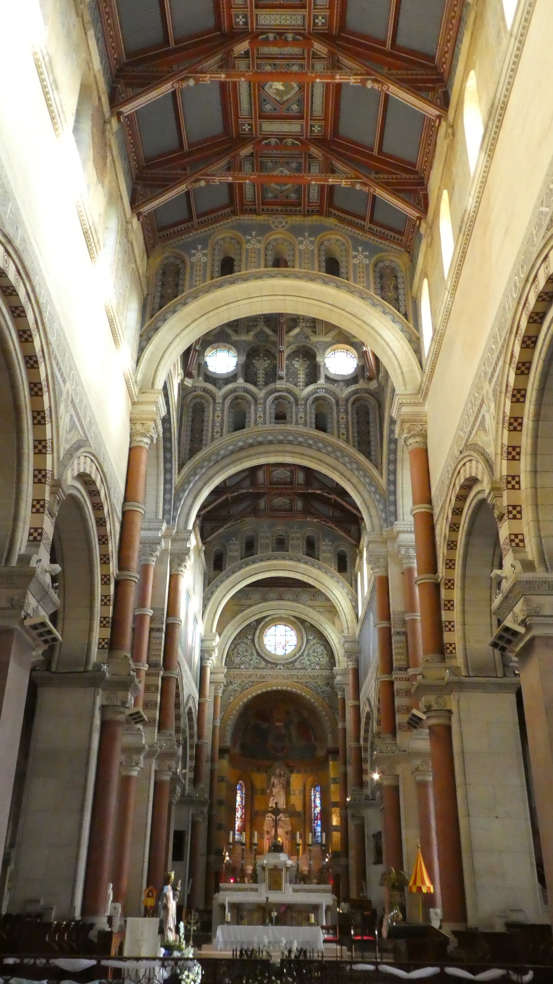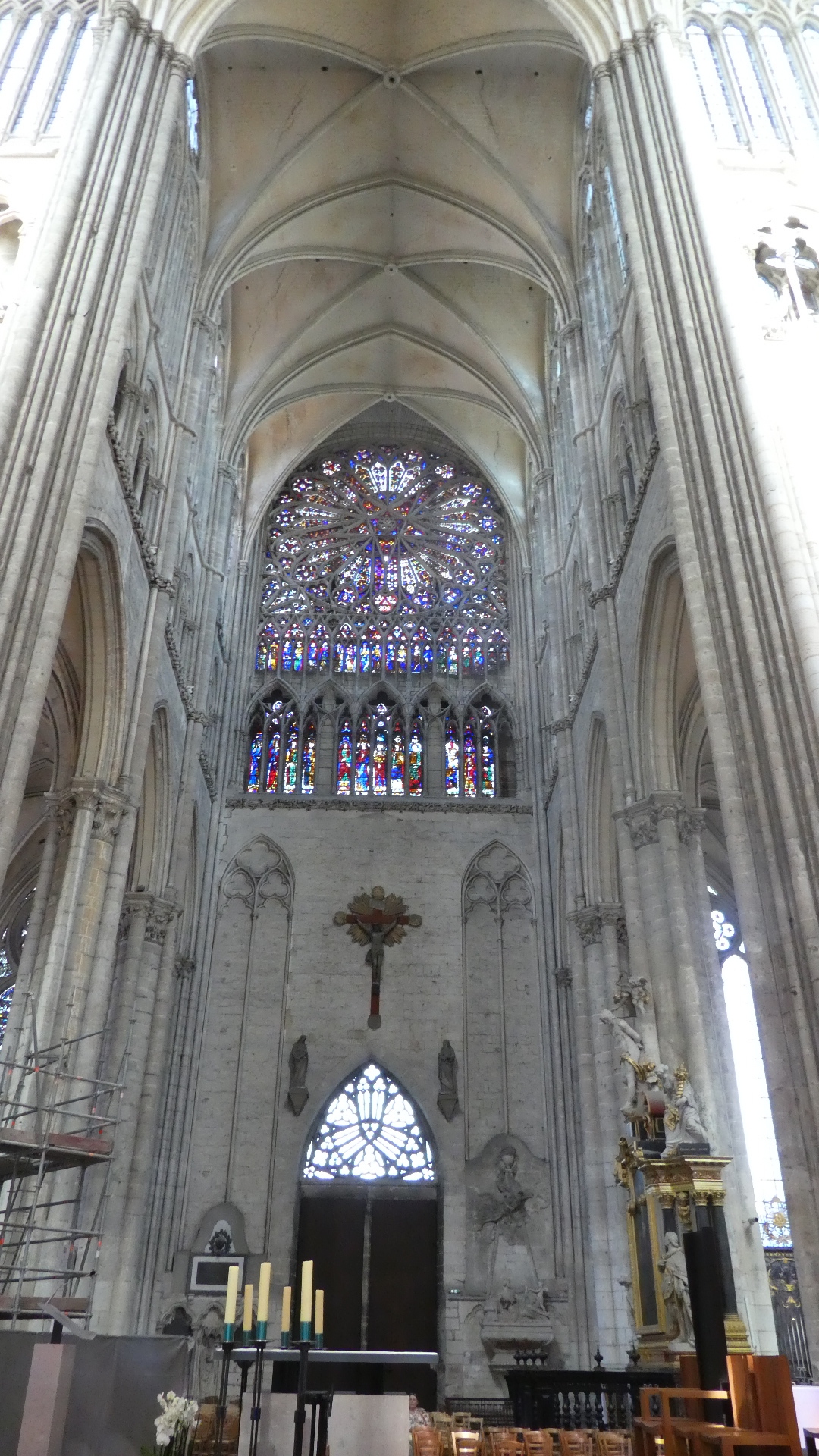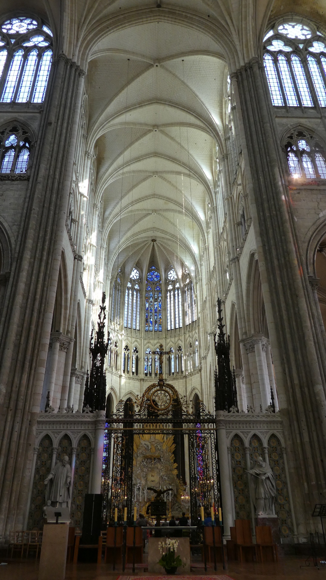 A main feature of the inside is the towering height of the gothic arches. It's amazing that they could get these so tall. In fact though, the structure did need some reinforcements over time, like extra flying buttresses, and some kind of chain tie in which the chain was installed red hot, so it would contract and tighten as it cooled.