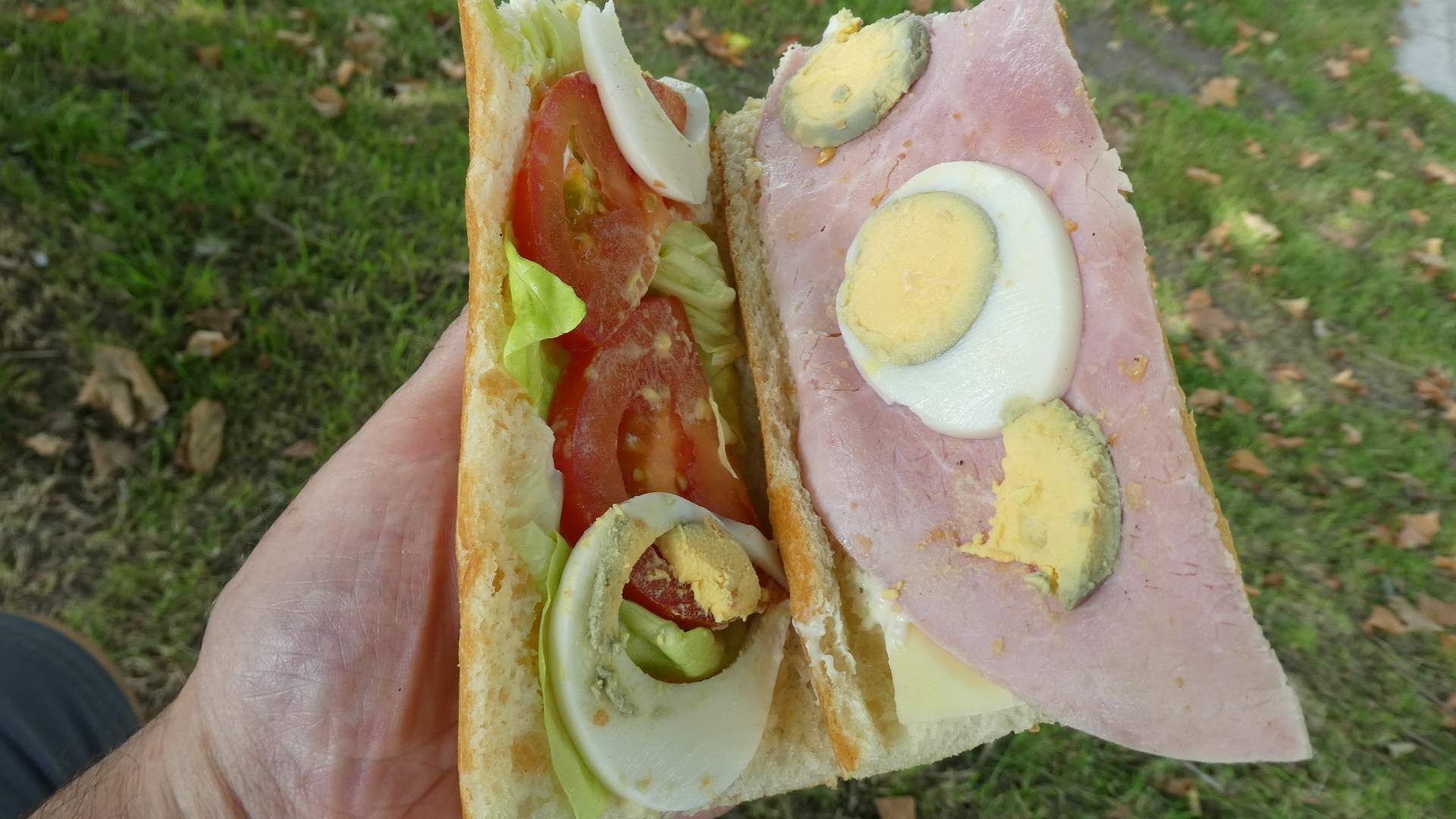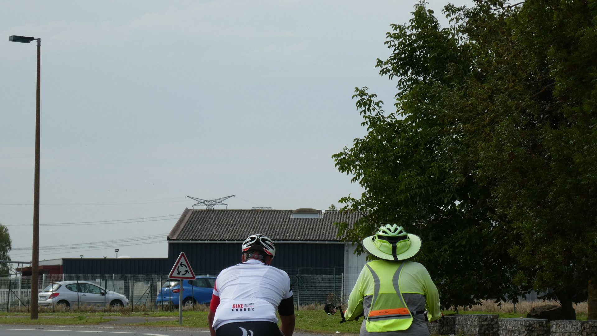 As we started to get closer to our destination at the hard to pronounce Ognes, the way became rather convoluted and the traffic rather heavy. A cyclist with a quite fast road bike joined us at a red light and exchanged some greetings with Dodie. She asked him something about were we going the right way, and he volunteered to guide us the rest of the way. Dodie warned that we go very slowly, and as always happens in these cases, the man assured her that he can go slow. In practice Dodie had to fight to keep up, and the cyclist - no doubt used to peletons - was riding within just inches of Dodie's mirror. I was impressed with Dodie hanging in with the man, not crashing, and also chattering in French the whole way. Meanwhile the three us had enough mass to fend off cars that tried to bully us in roundabouts or shove us to the side of the road. Our cycle guide showed no fear of such aggression at all.