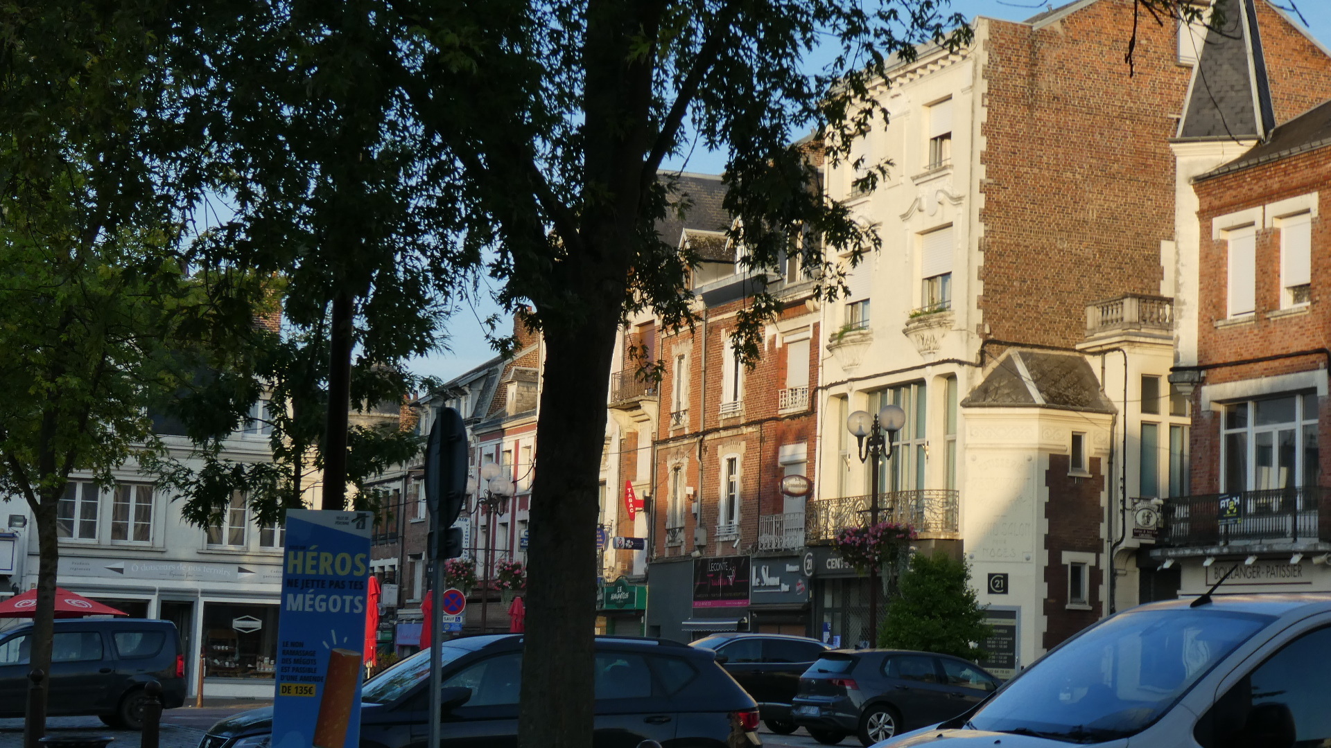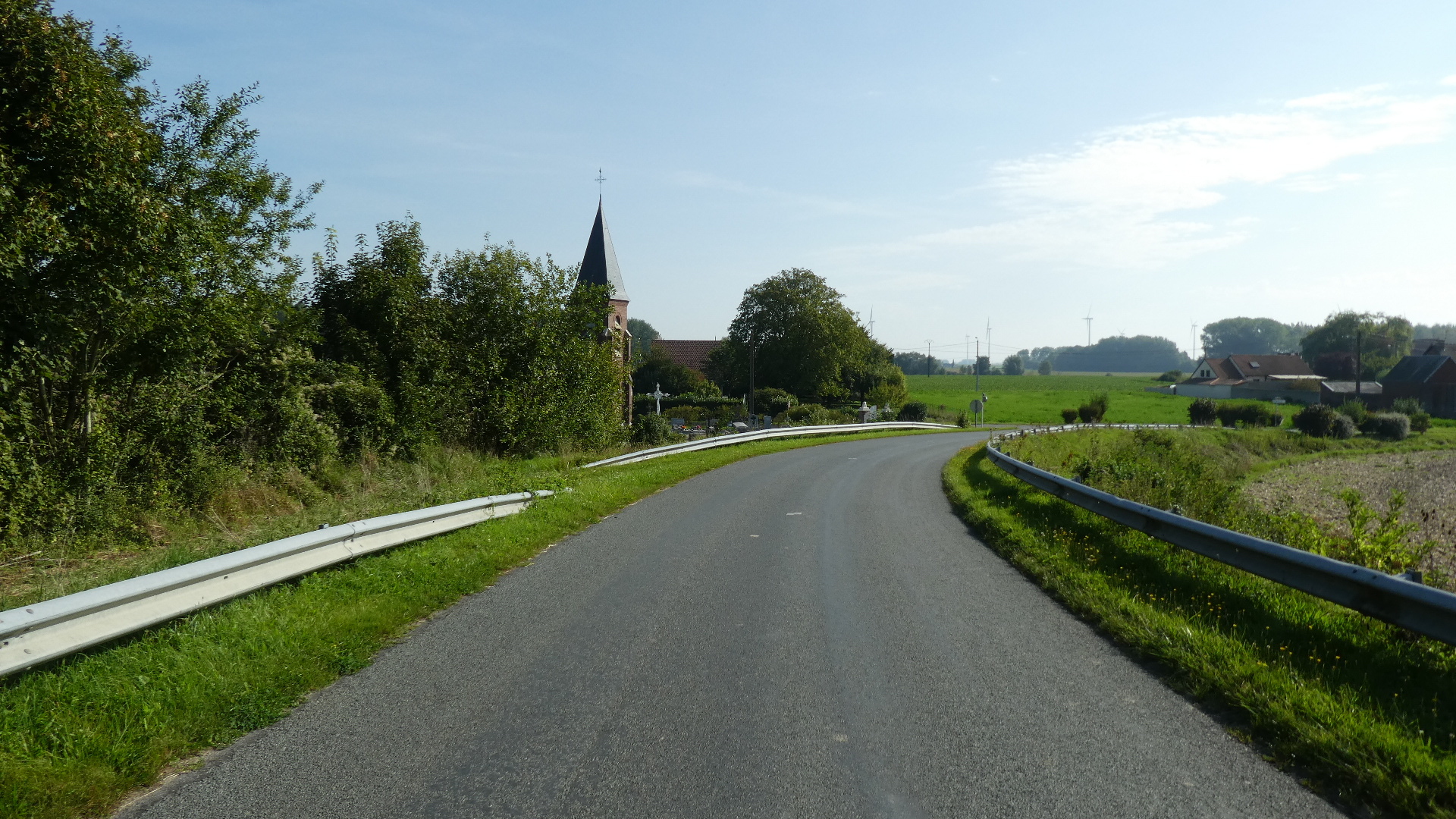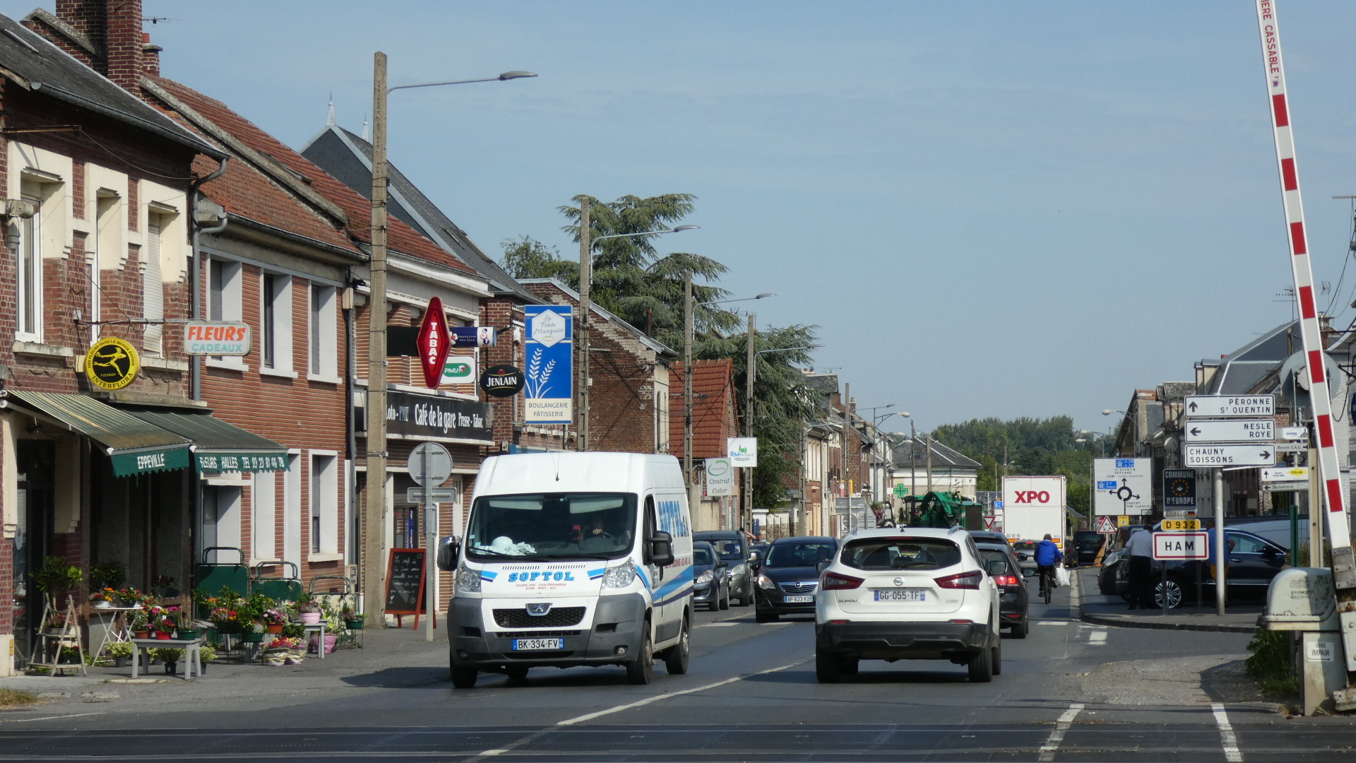 Fueled up on our level two breakfast, we made our way through Peronne. There was no bike lane on the main street and fairly heavy traffic, so the shot below is the best I did, to show what the town looked like to us. Of course, I could have stopped and made a proper photo, rather than riding down the street waving a camera, but that seems to be a bit beyond me.