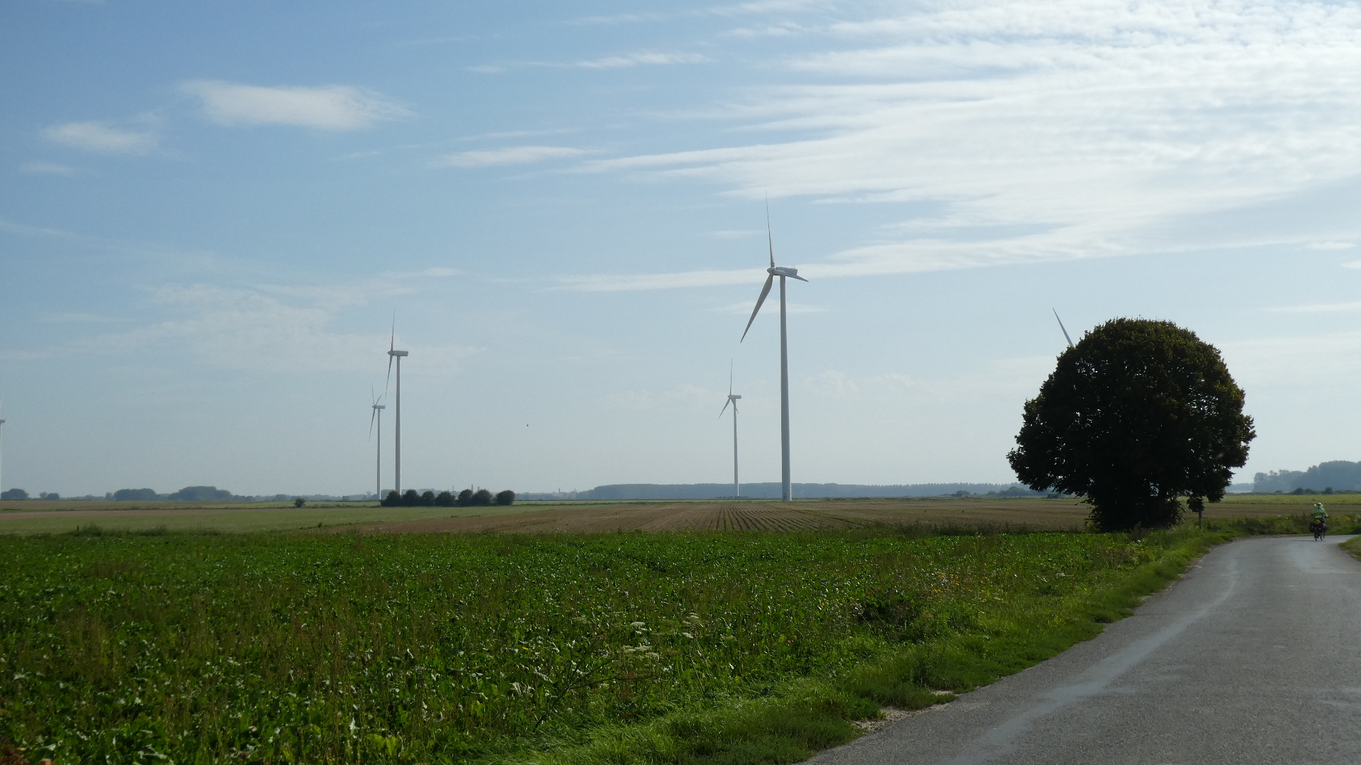 Our route took us off the river and onto some rural roads. These were fine for cycling and also featured wind turbines, which we always find to be elegant and pleasing.